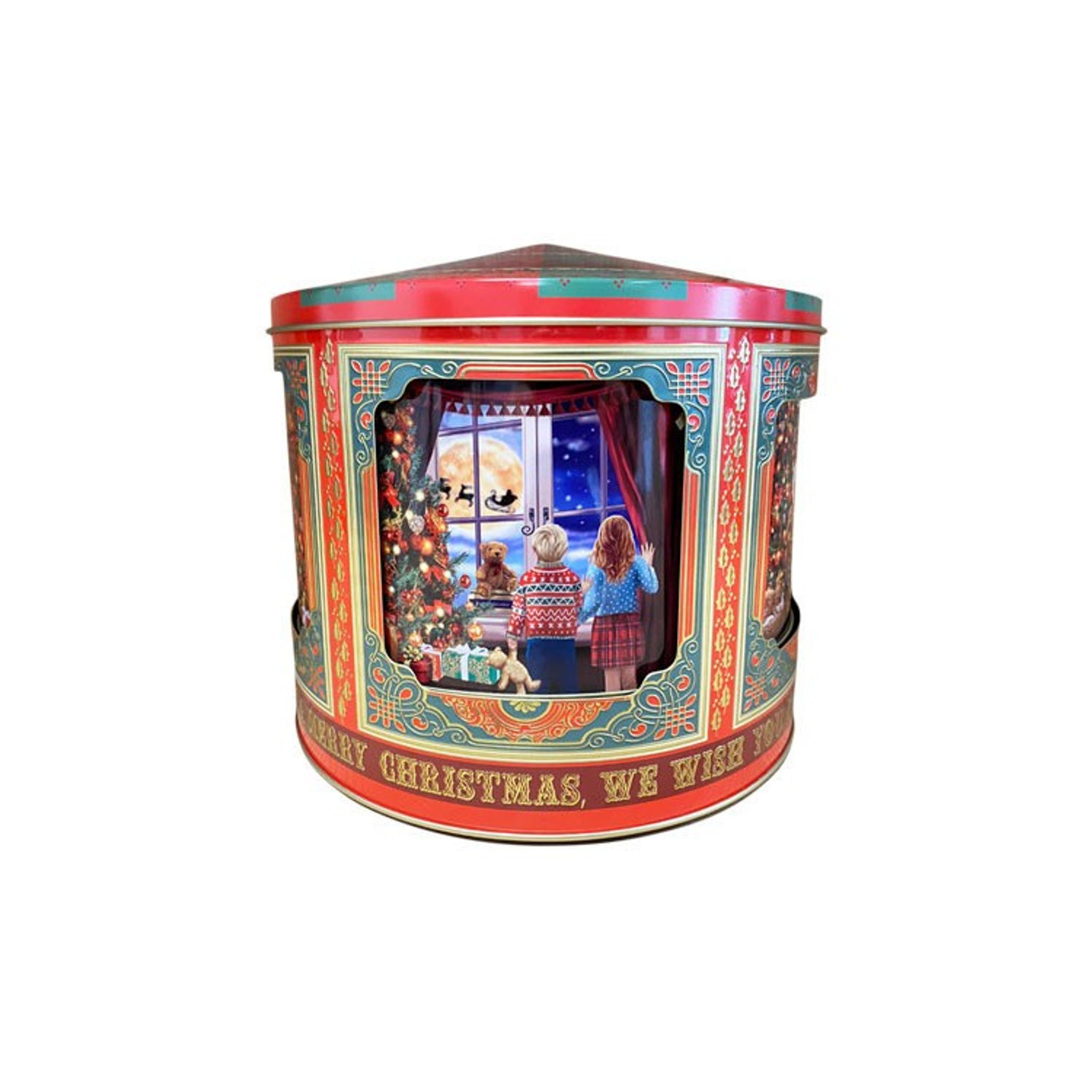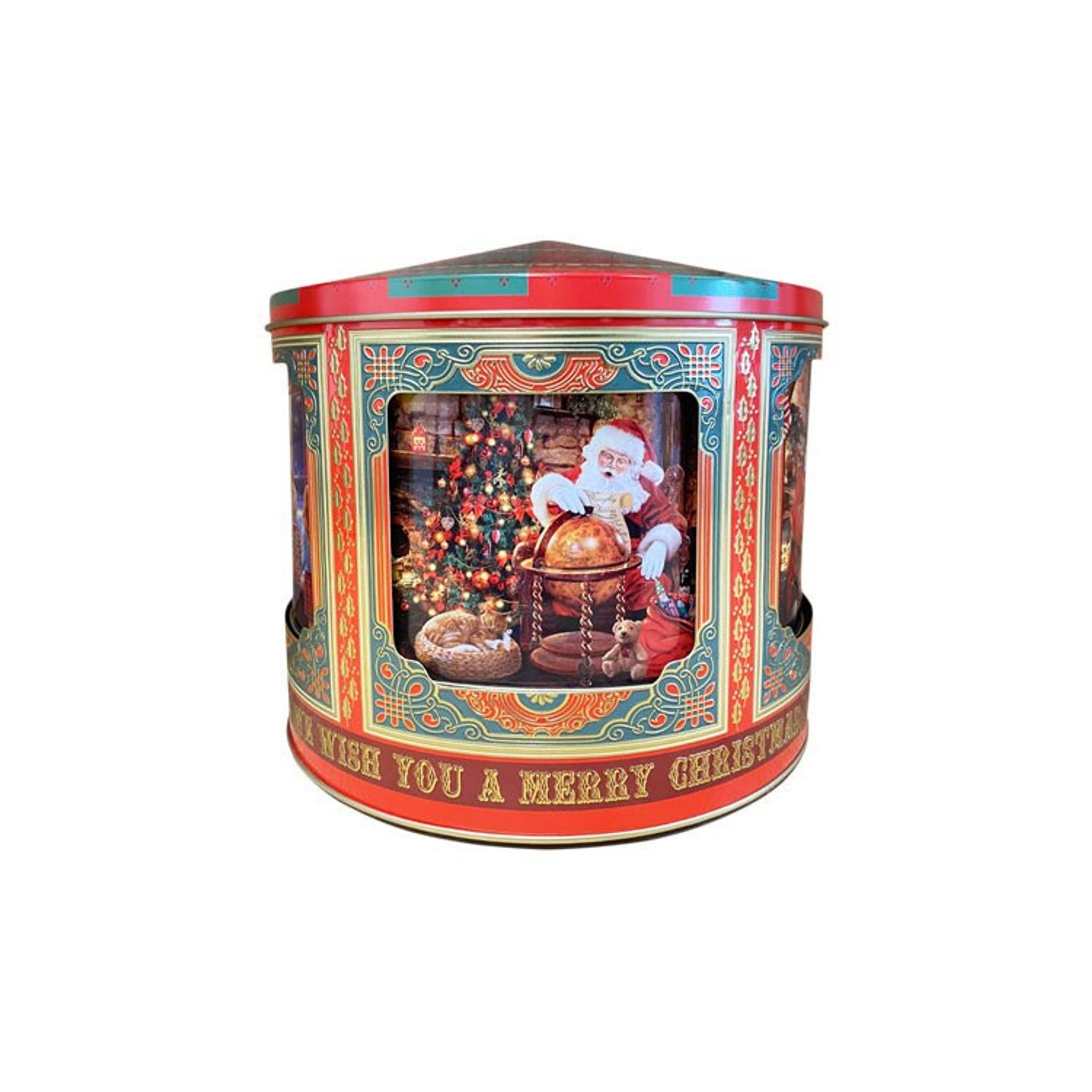 Denna plåtburk är en speldosa som skruvas upp undertill och spelar härlig julmusik och låten “We Wish You A Merry Christmas” och så snurrar även bakgrundsbilden med julmotiv runt.