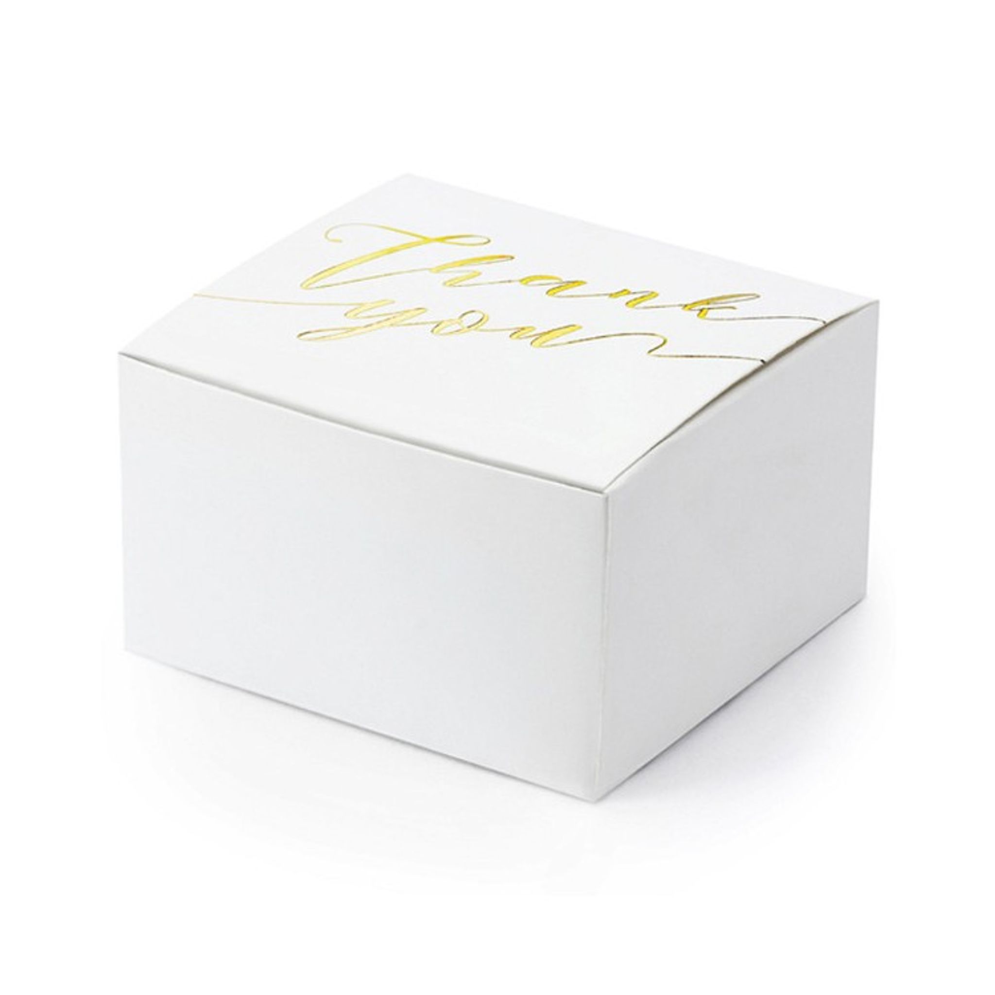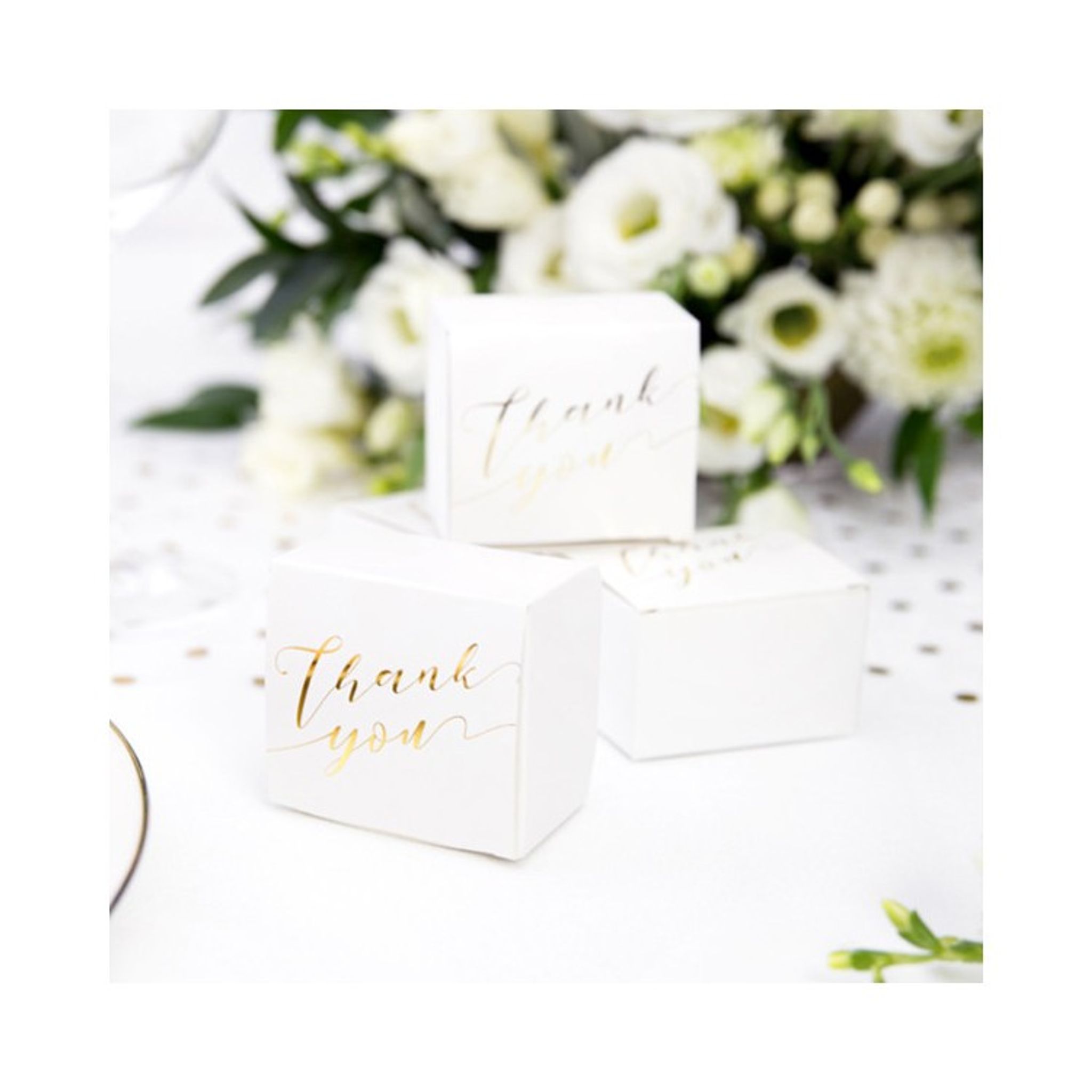 10 st fina små presentaskar i vitt med texten "Thank You" i guld. Perfekt att fylla med t.ex små godsaker och dela ut till gästerna på bröllopet. Storlek: 6 x 3.5 x 5.5 cm