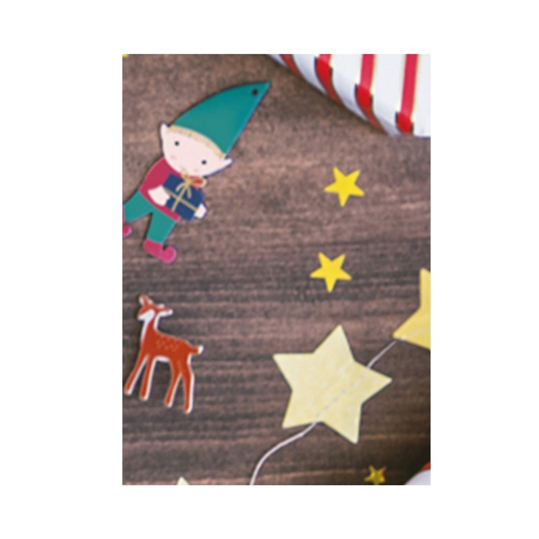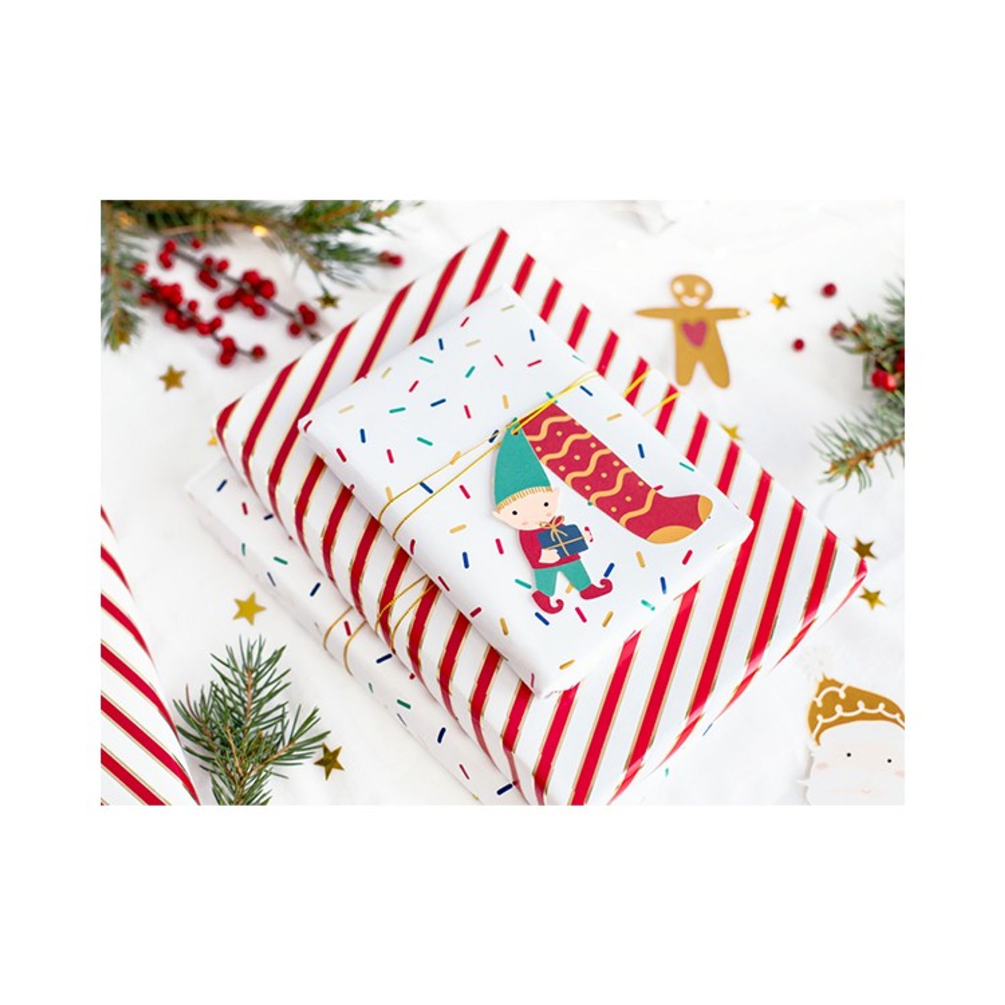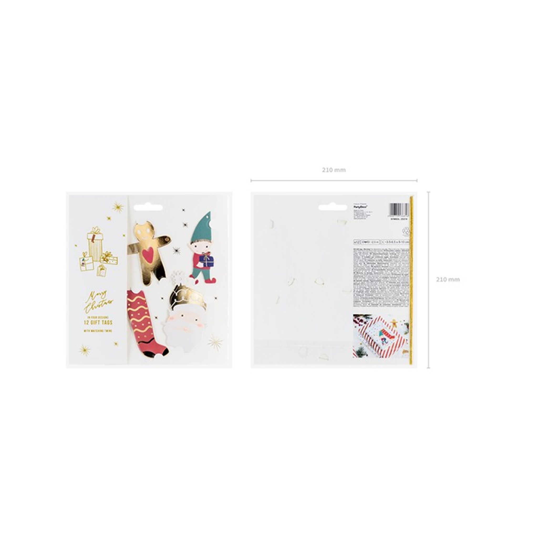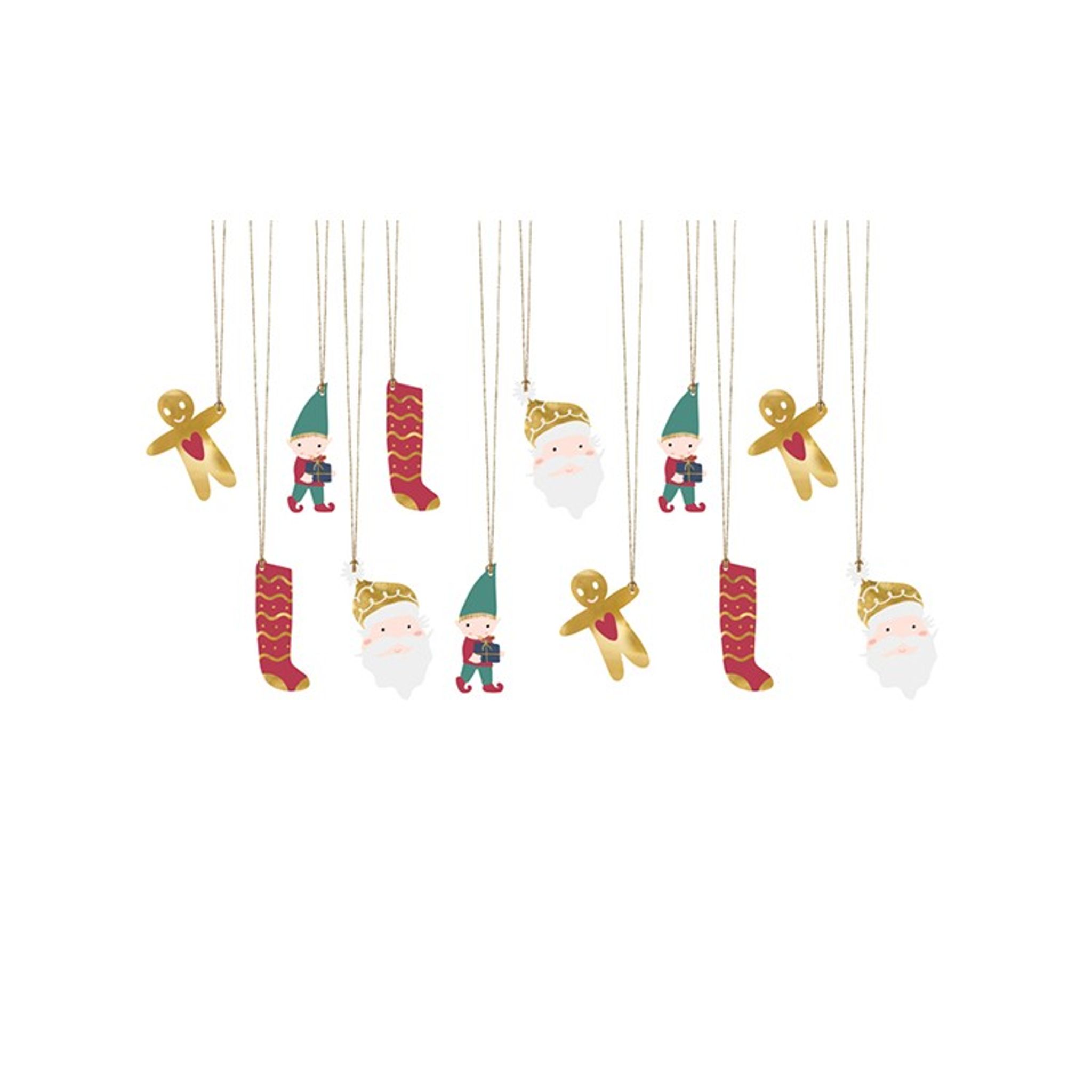 Presentetiketter i papper med mixade tomtemotiv. Etiketter kommer i 12-pack tillsammans med 2,5 m snöre i guld.