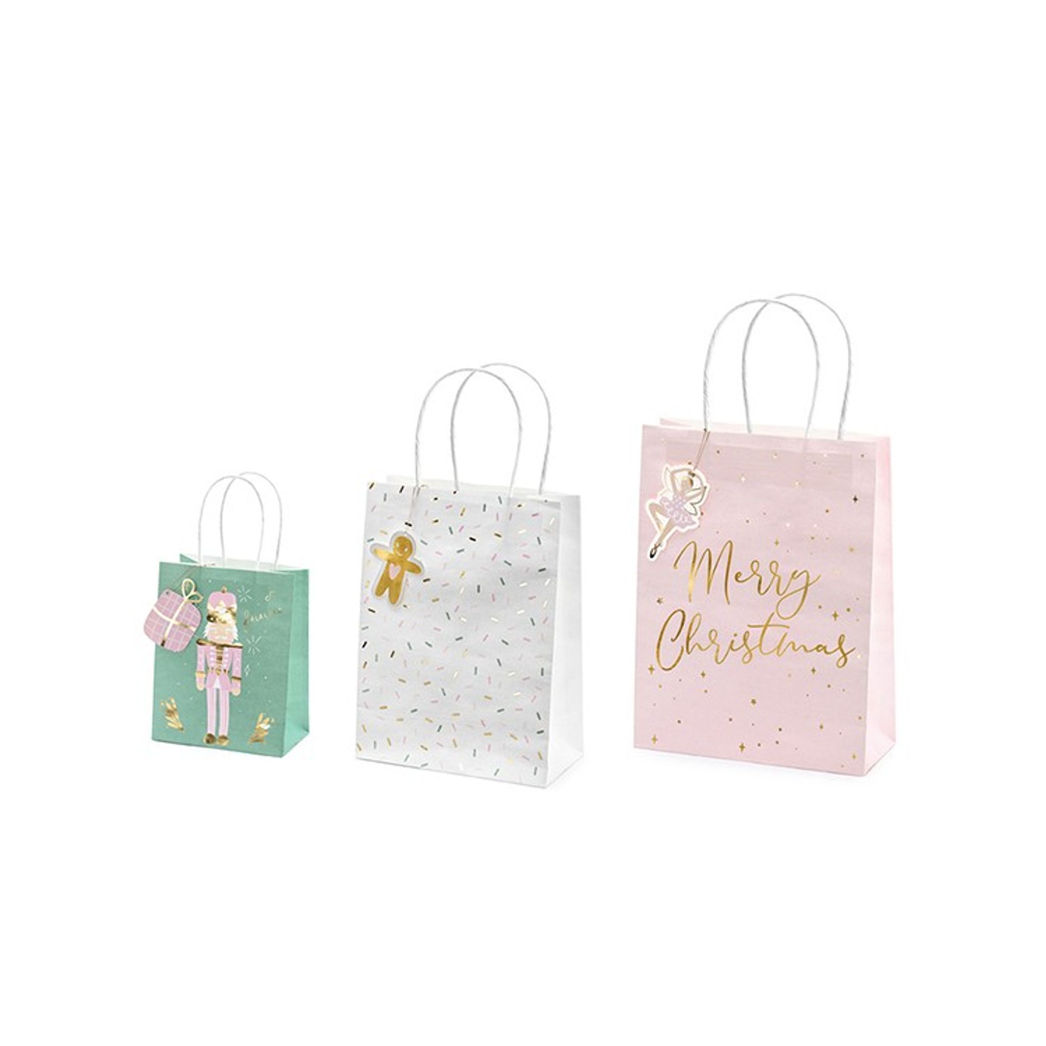 3-pack presentpåsar med julmotiv i mixade färger och storlekar. Påsarnas storlek: 24 x 32 x 10 cm 20 x 27 x 10 cm 14 x 18 x 8 cm