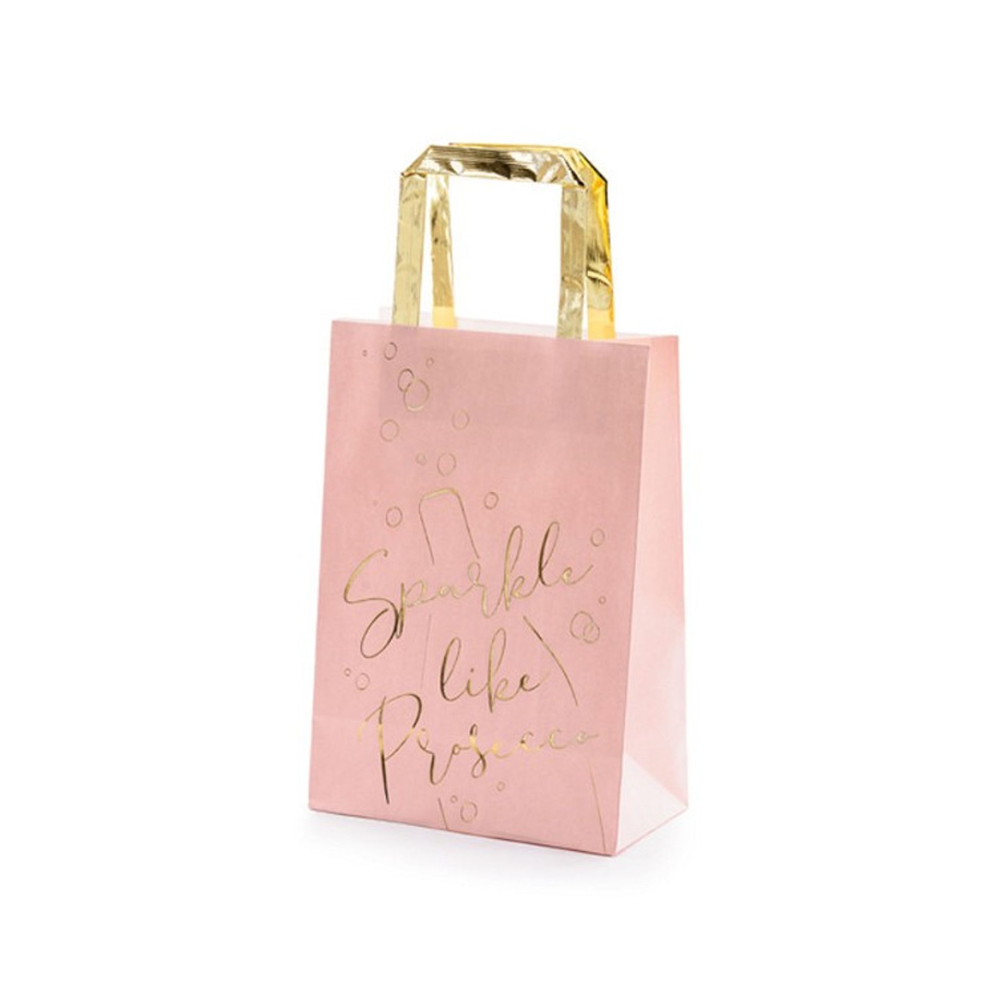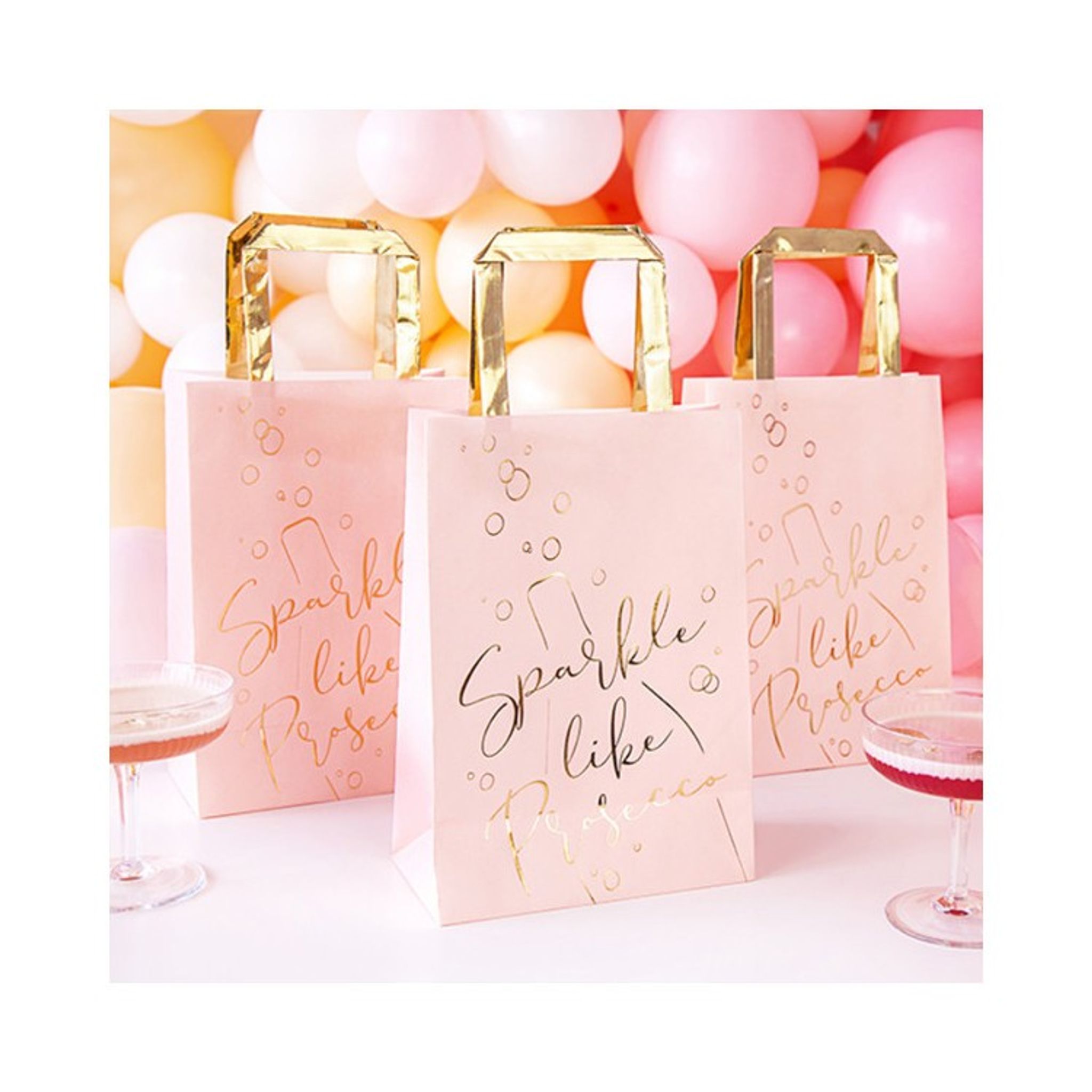 Skall du ge gästerna en överraskning som tack när festen är över? Här får du 6 st fantastiskt fina presentpåsar i härlig rosa färg med guld-detaljer som pryder påsen. Text på påsen i guld är "Sparkle like Prosecco"