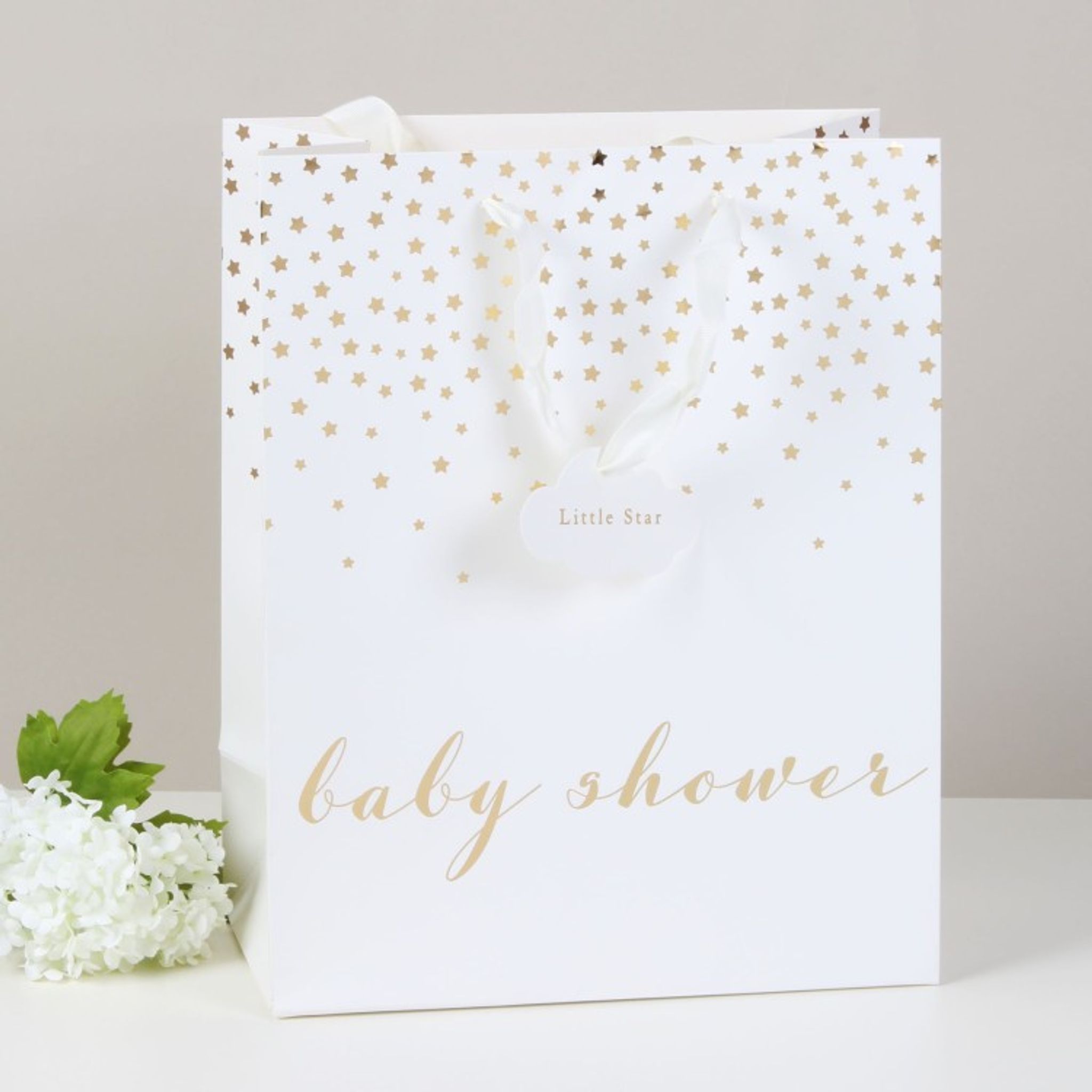 Mycket fin presentpåse i äggskalsvitt med sidenband samt en liten tag i form av ett moln med texten Little Star. Påsen har texten Baby Shower i guld. Denna påse är perfekt för smidigt inslagning när gåvan på baby showern ska överlämnas.