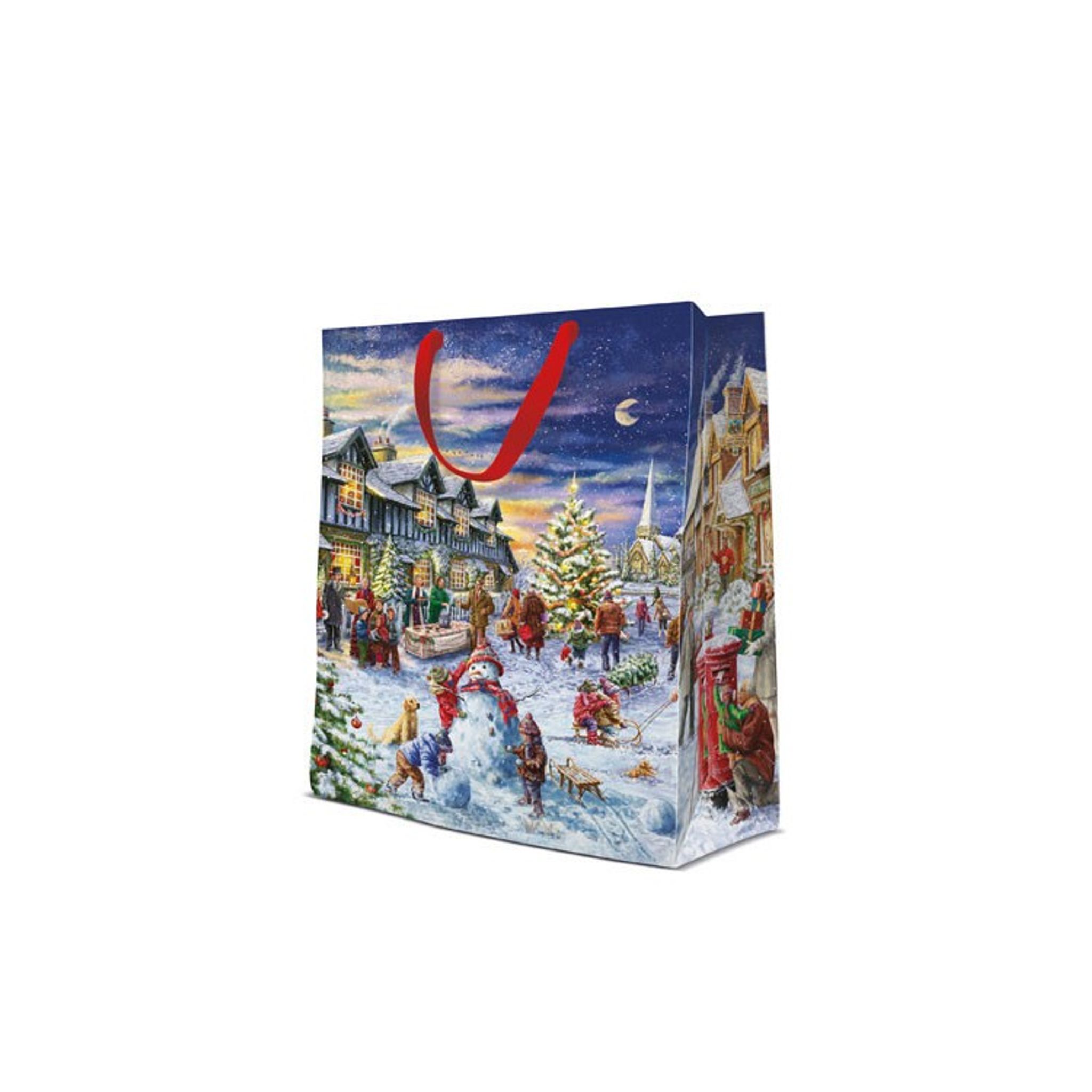 Presentpåse med härligt julmotiv, rättare sagt en mysig julmarknad. Perfekt när du lätt och enkelt vill slå in årets julklappar eller när du ska ge bort en julgåva. Matcha gärna med något silkespapper.