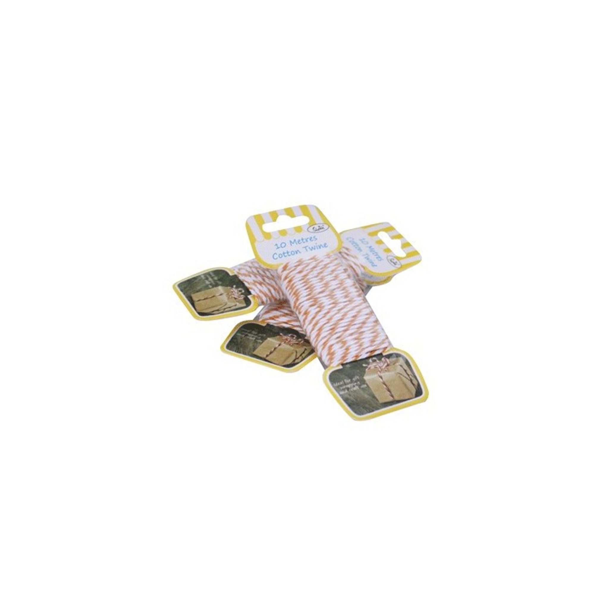 10 meter bomullsband som är tvinnat. Färg: orange/vit. Fint som presentsnöre eller till annat pyssel. Obs! Färgen går åt den senapsgula fägen.