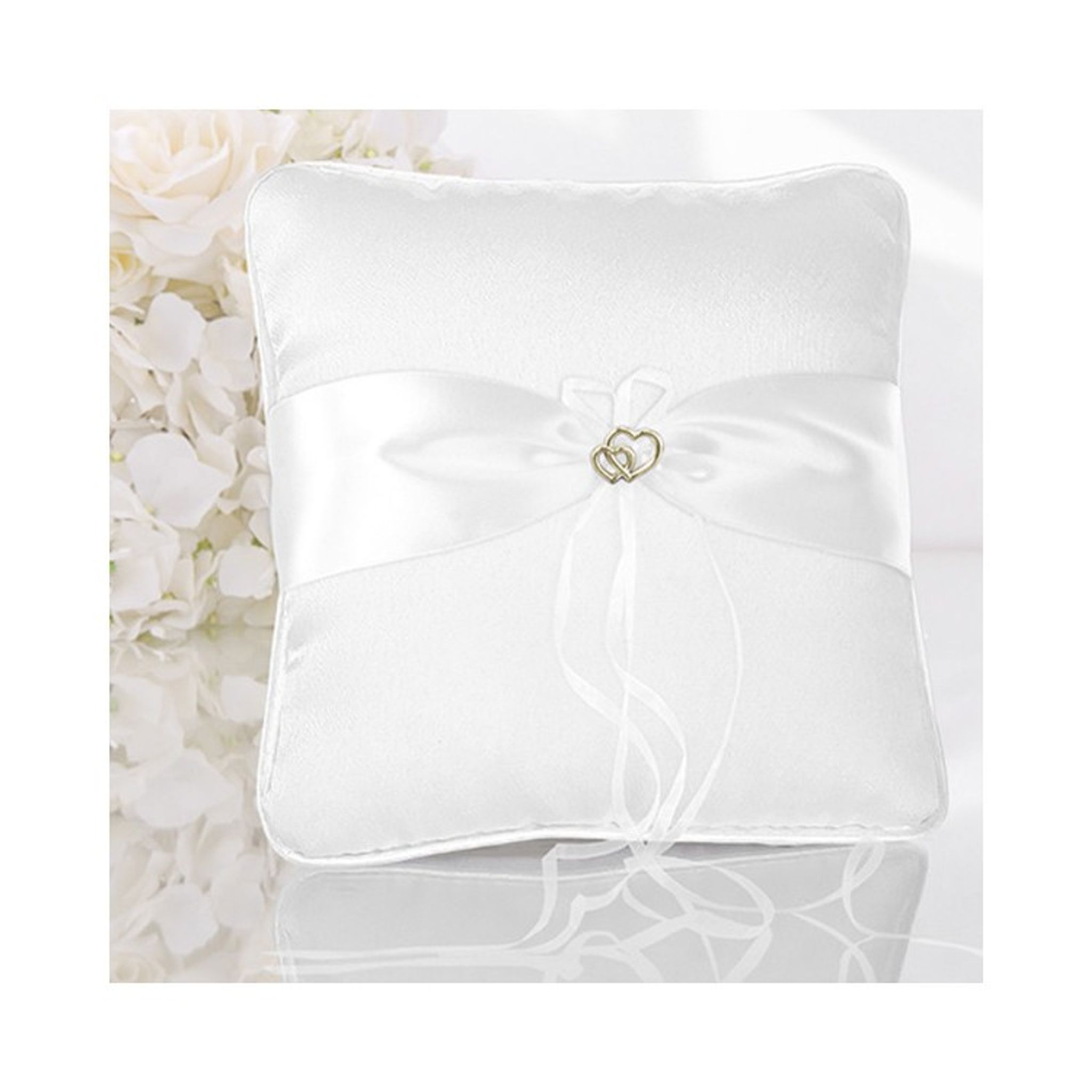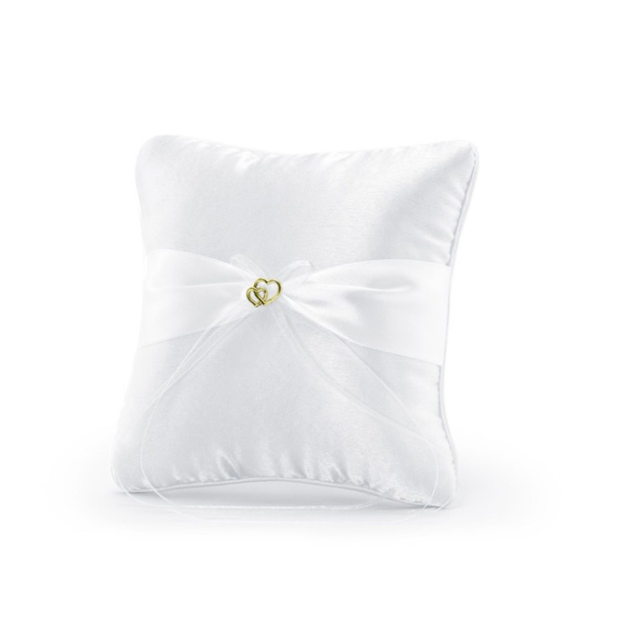 Vit ringkudde med fina detaljer såsom spets, två små vita rosor och en vit rosett. Ringkuddens rosett avslutas med längre snören där ringarna kan knytas fast. Med denna bröllopsdekoration sätter du extra guldkant på den stora dagen.
