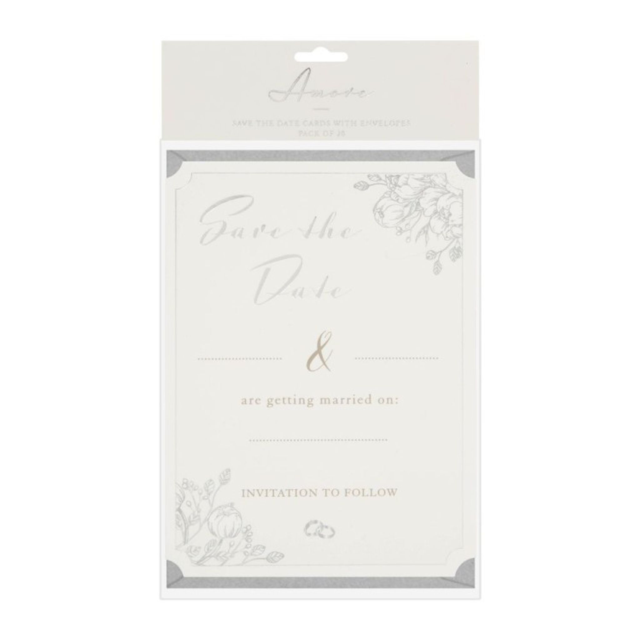 Dessa snygga vita kort har subtila pastellgrå blommönster, skalade hörn och silverfolie präglat 'Save the Date' och kantdetaljer. Korten innehåller plats för era namn och datum och ett "inbjudan att följa" -meddelande.