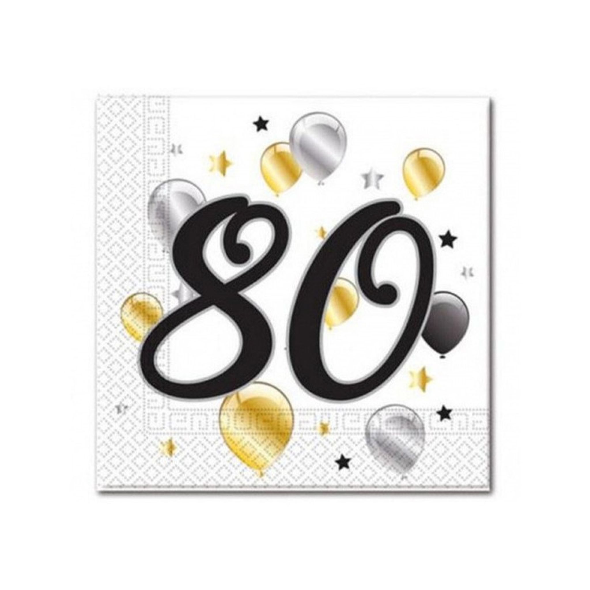 Servetter med 80, ballonger och stjärnor är perfekta till dukningen. Snygga tillsammans med våra andra kalasdekorationer i vitt, guld, svart och silver.