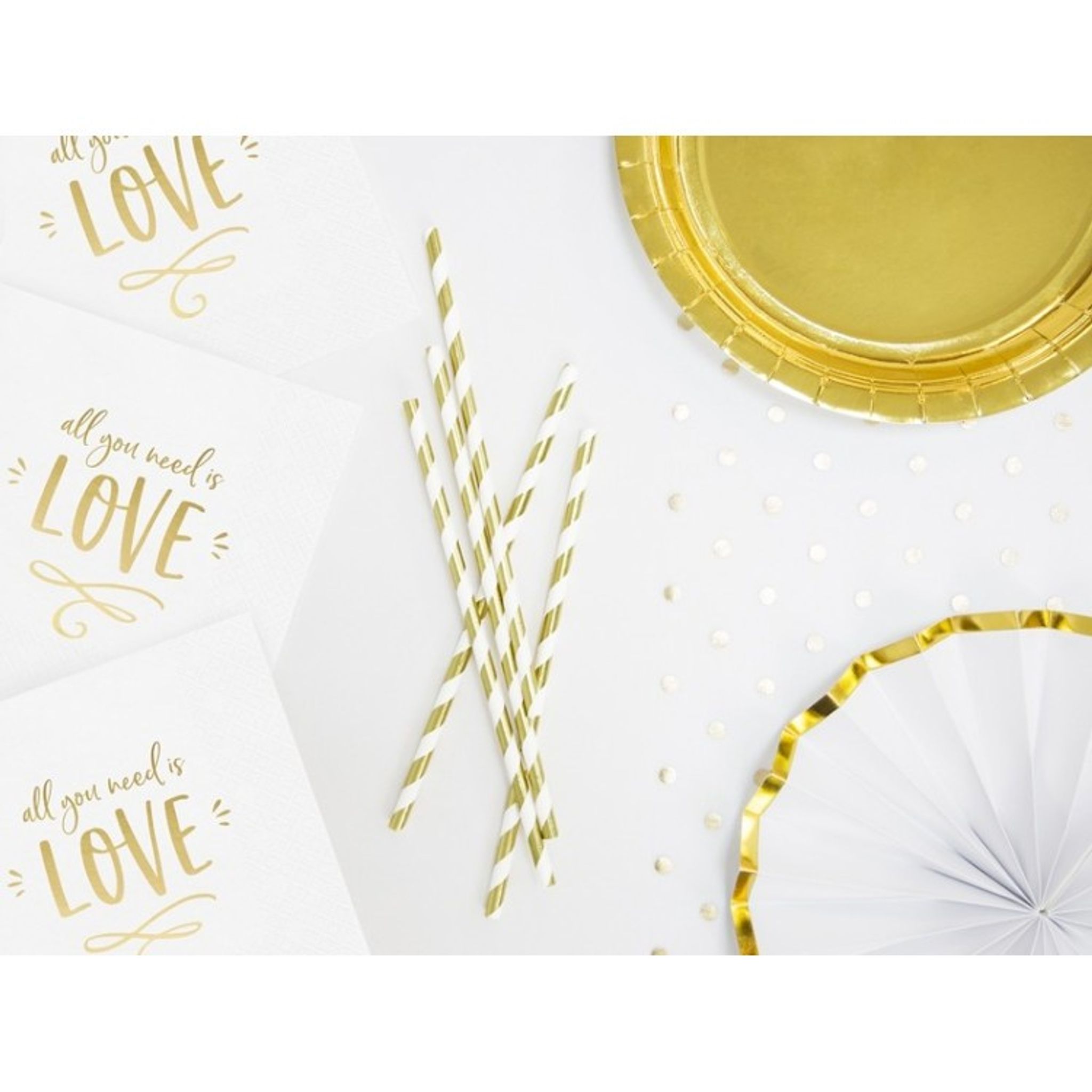 Vita servetter med texten "all you need is LOVE!" i guldskimmer. Passar lika bra till bröllopsmiddagen som till alla hjärtans dag fikat med familjen.