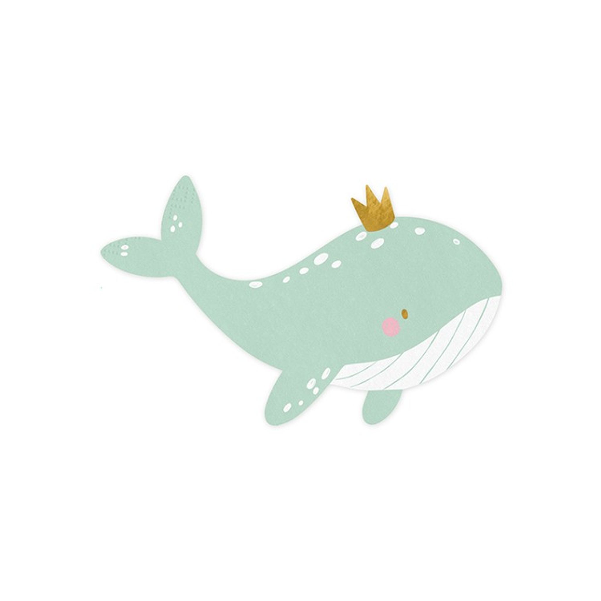 Pappersservetter i form av en blåval med guldkrona. Matcha gärna med pappersassietter Blåval i samma serie och dekorera med Folieballong Blåval Storlek: 16 x 10 cm Priset avser en förpackning med 20 stycken servetter.