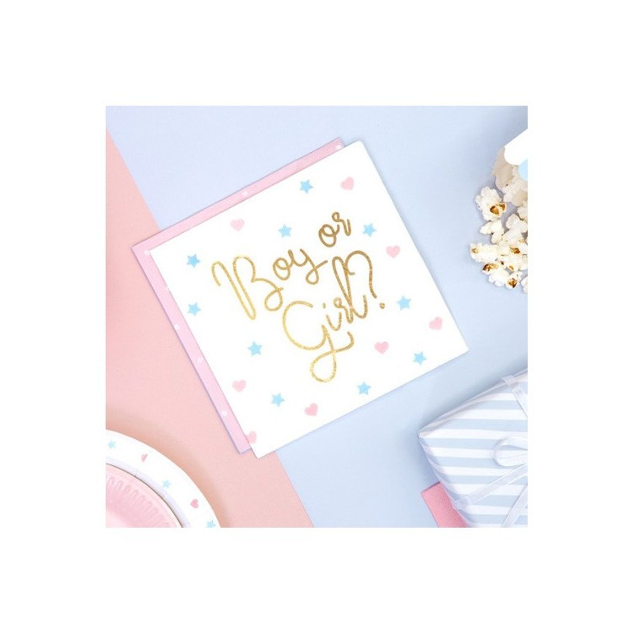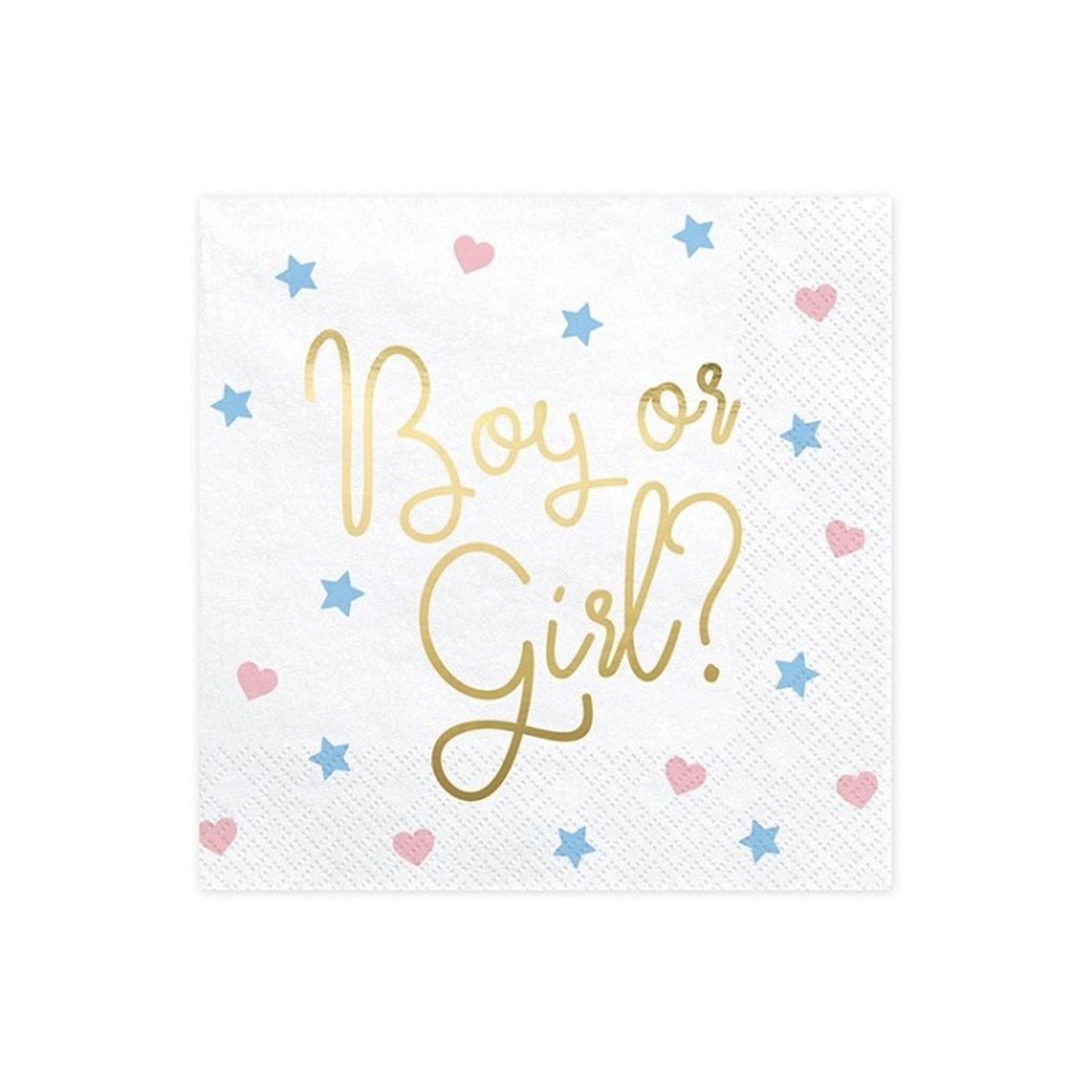Här får du vita servetter med texten "Boy or Girl?" i guld. Servetterna har även detaljer av rosa hjärtan och ljusblåa stjärnor. Mixa och matcha gärna med övriga produkter i samma temat för att skapa en helhet.