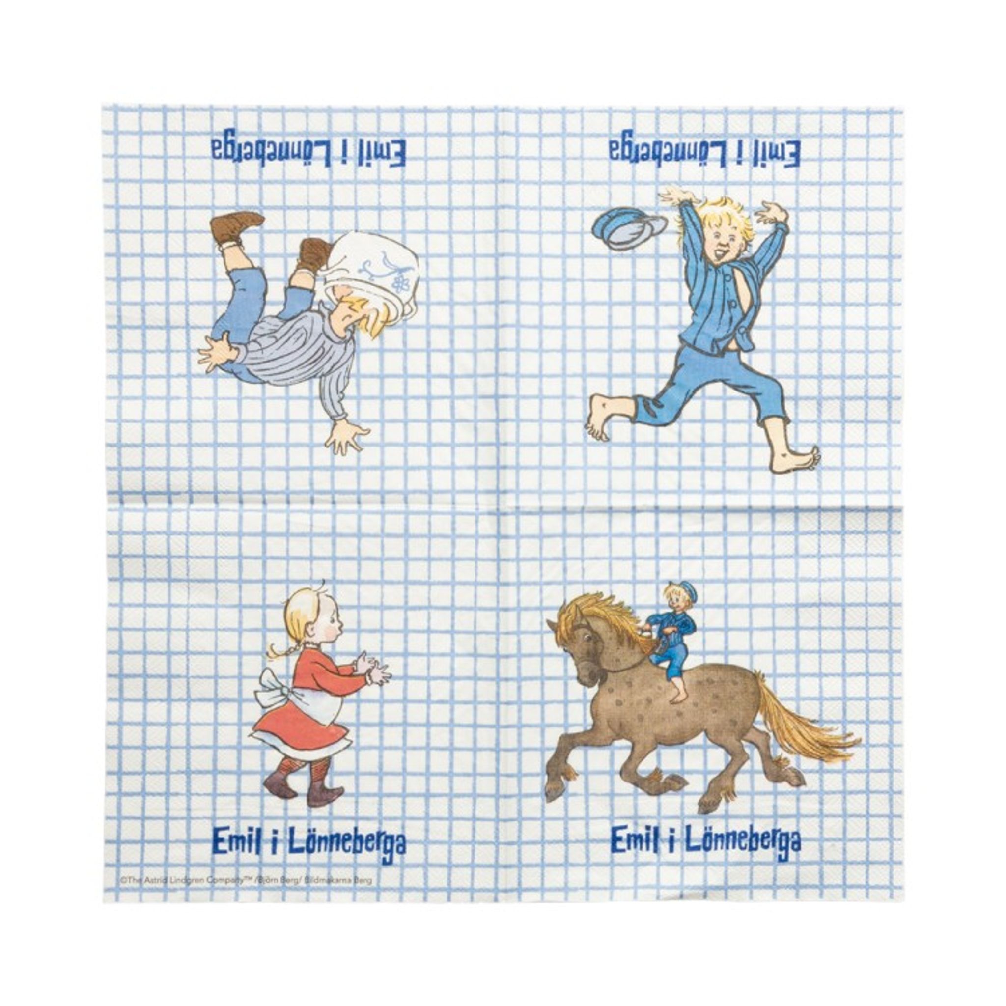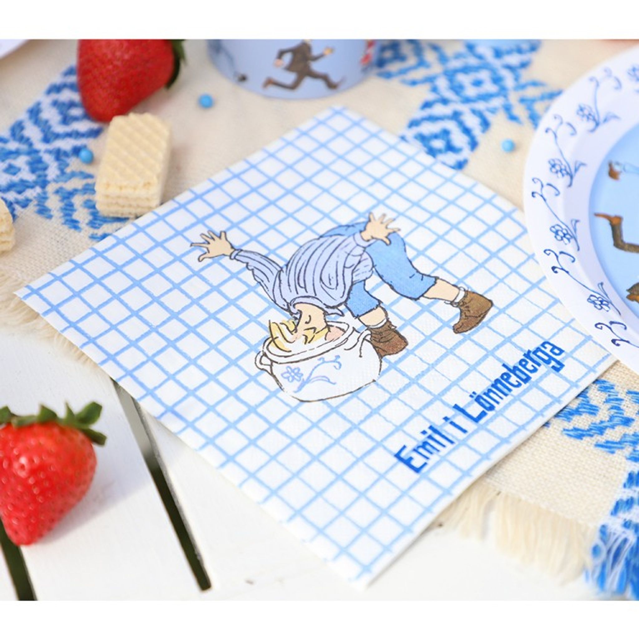 Servetterna är vita i grunden, blårutiga och pryds av kända hyss och karaktärer från Emil i Lönneberga, bland annat Emils häst och lillasyster Ida.