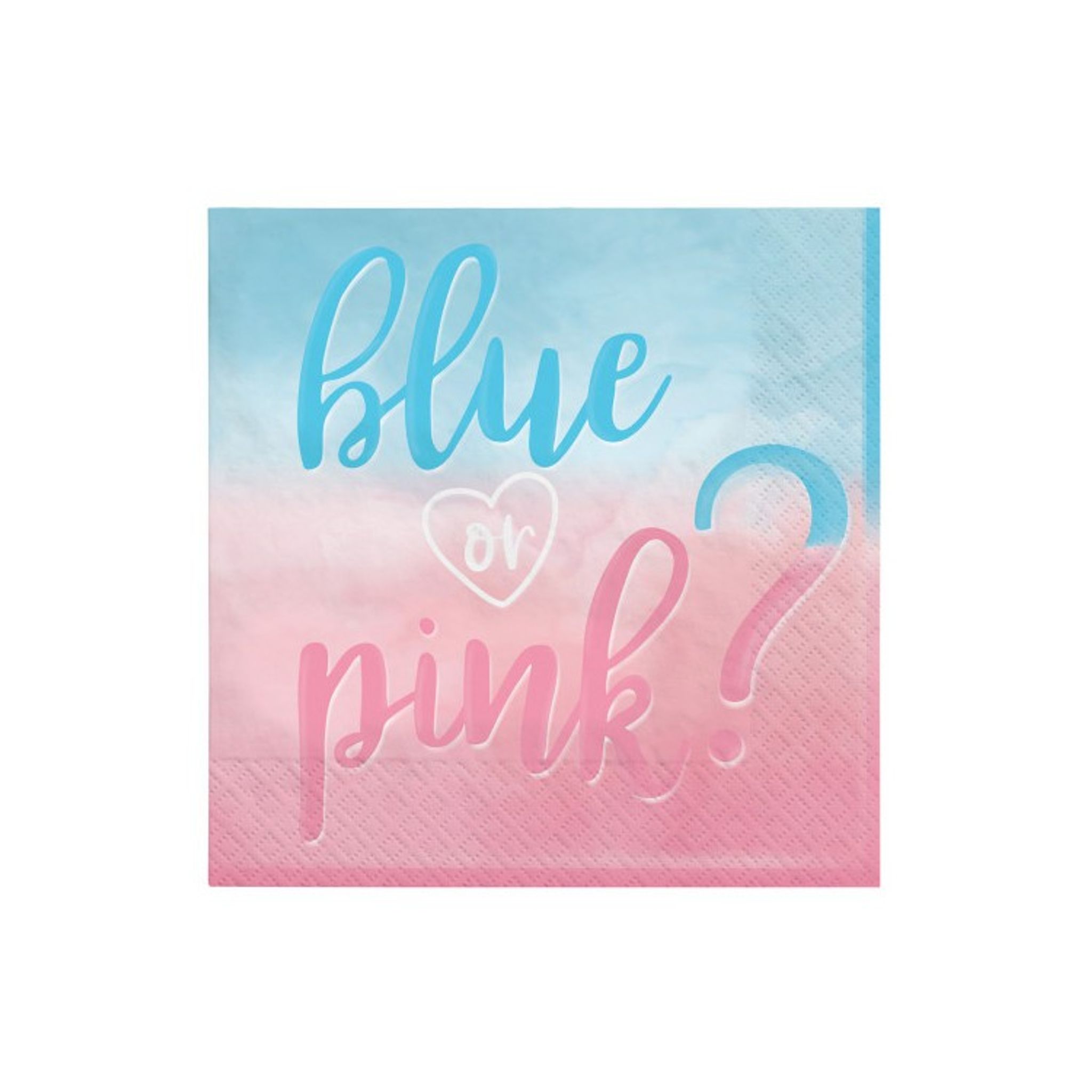 Servetter som är perfekta att använda vid dukningen på Gender Reveal-festen eller babyshowern. Servetterna är i rosa och blått med texten "blue or pink?"