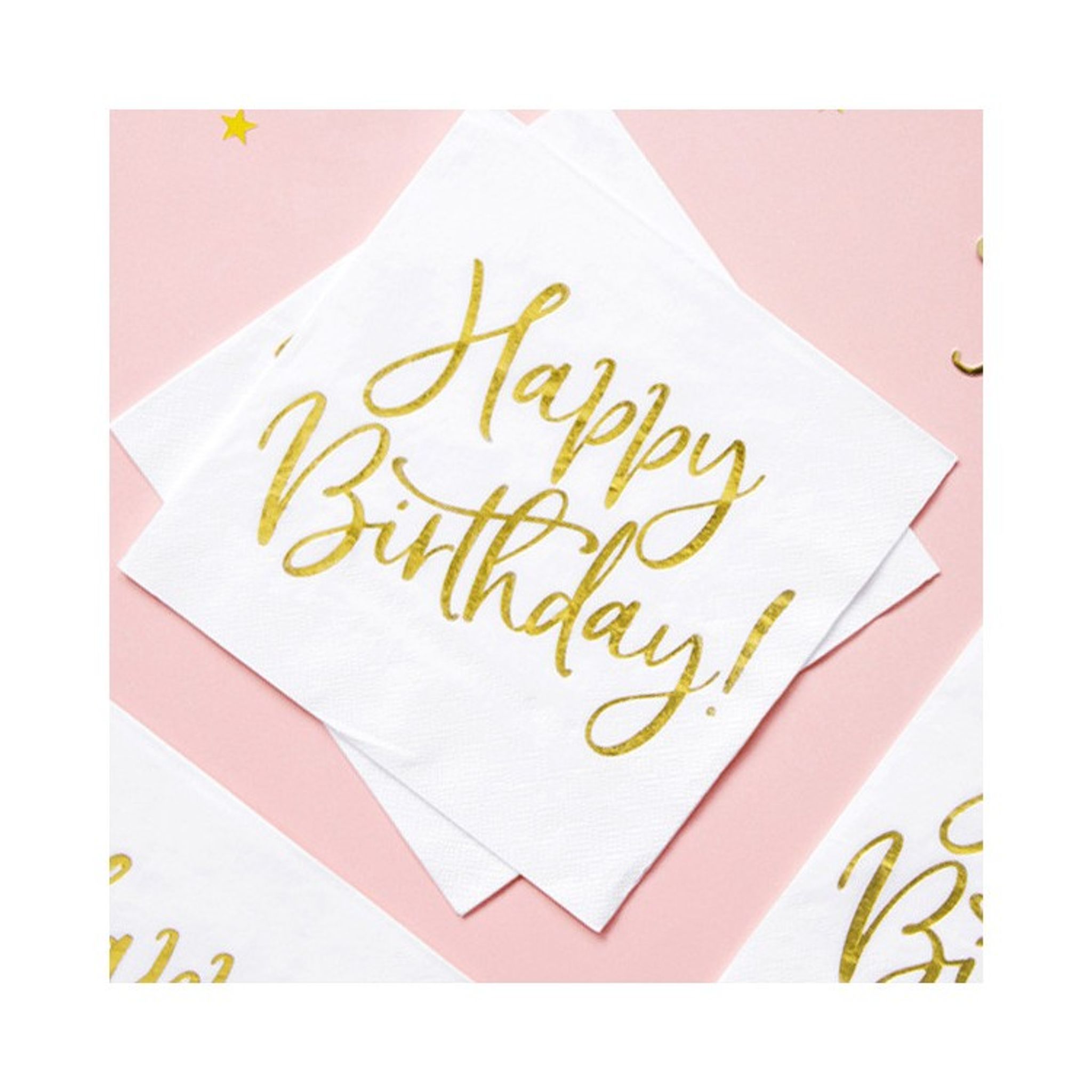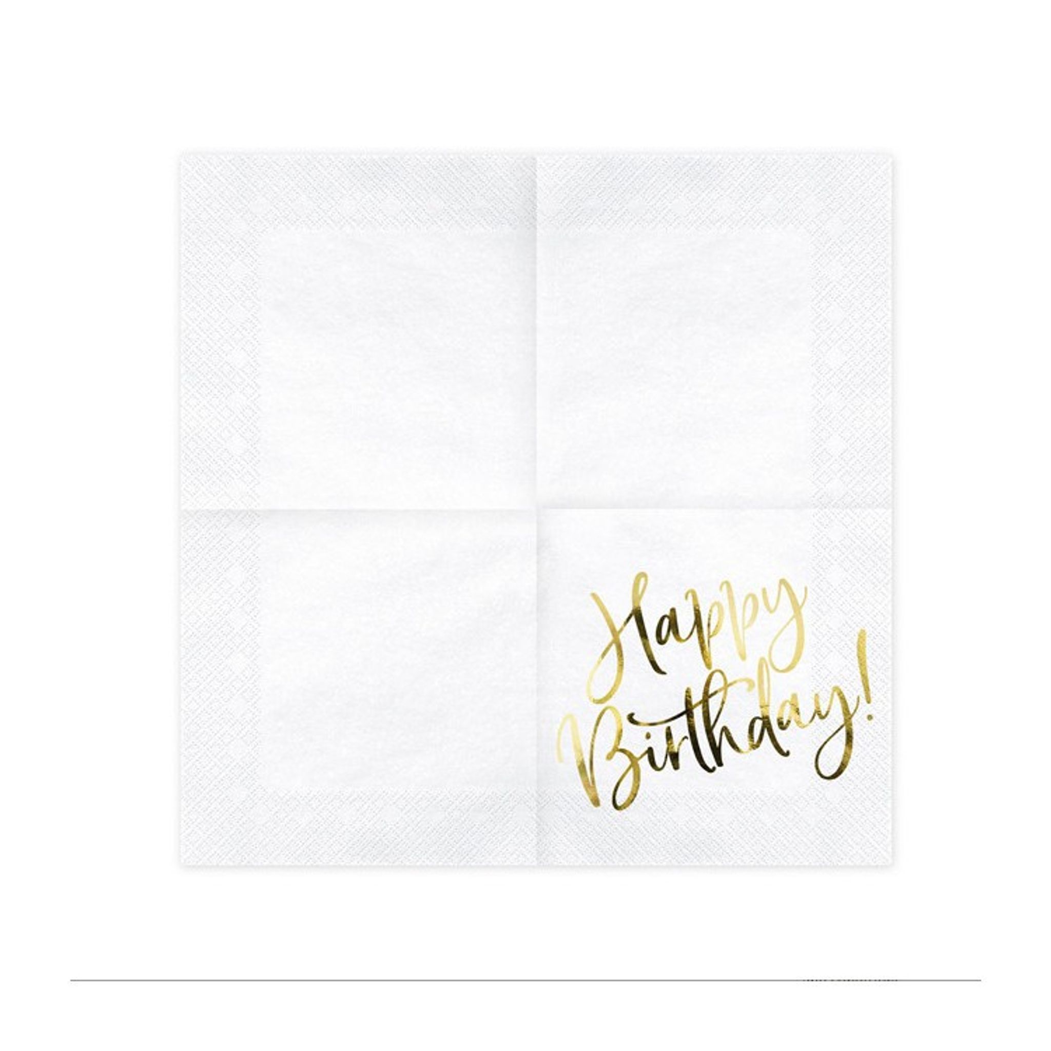 Mycket snygga och stilrena lunchservetter i vitt med text i guld. På servetten står det "Happy Birthday".