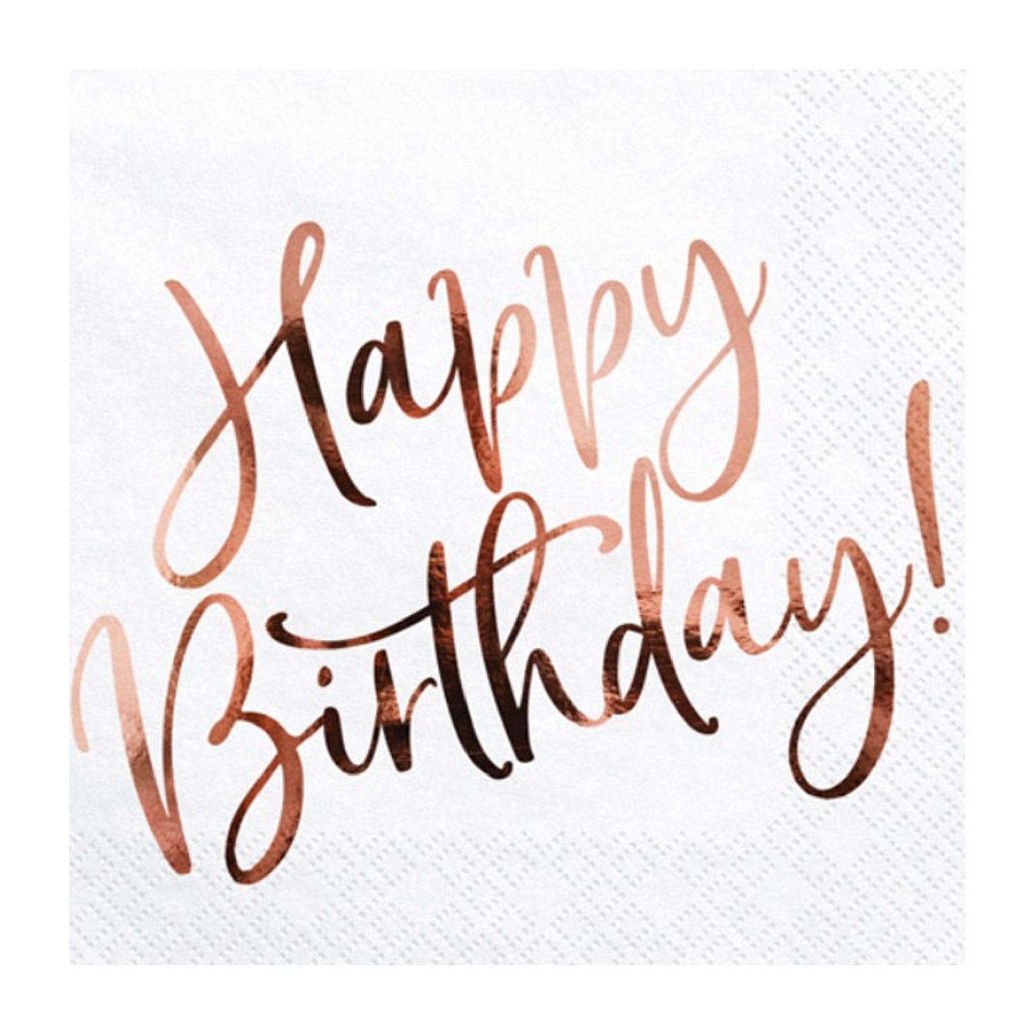 20 st snygga vita lunchservetter med texten Happy Birthday! med folierat tryck i roséguld. Storlek: 33 x 33 cm i utvikt mått Antal: 20 st