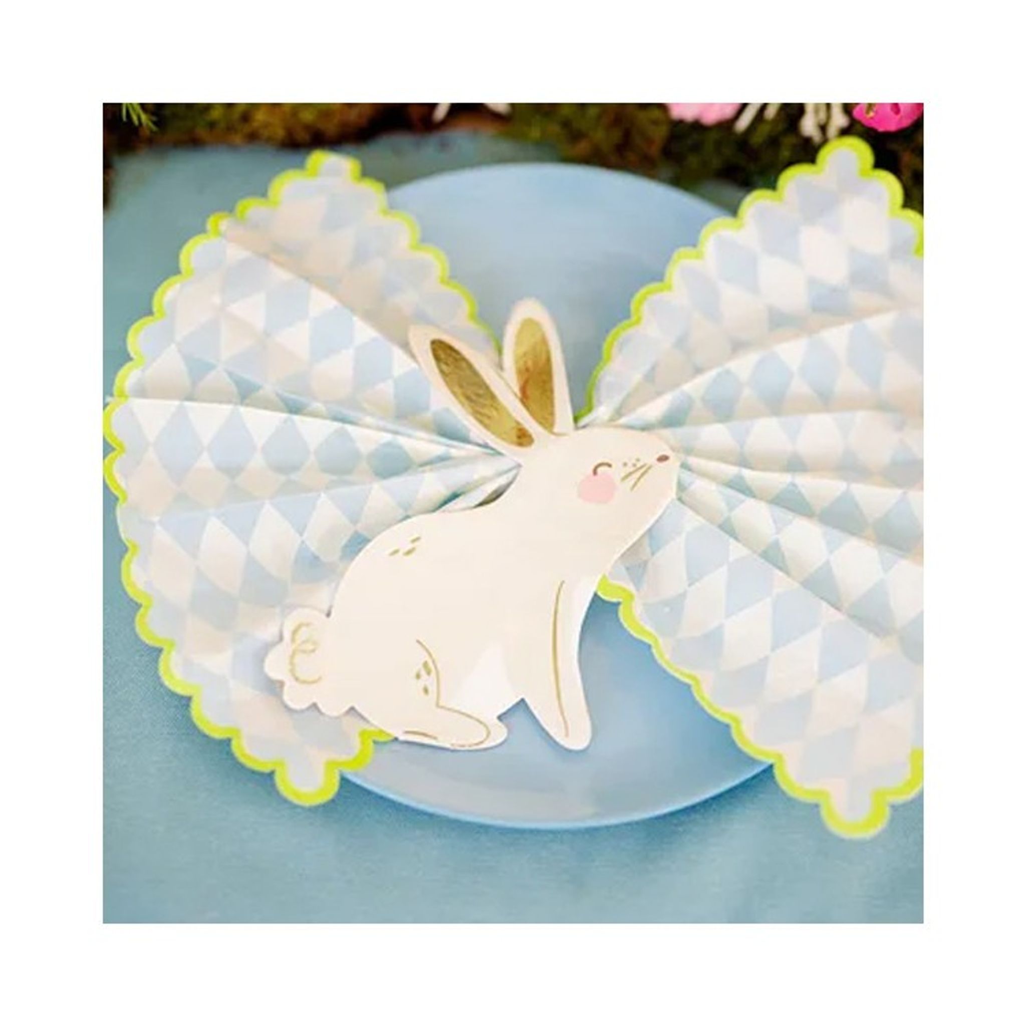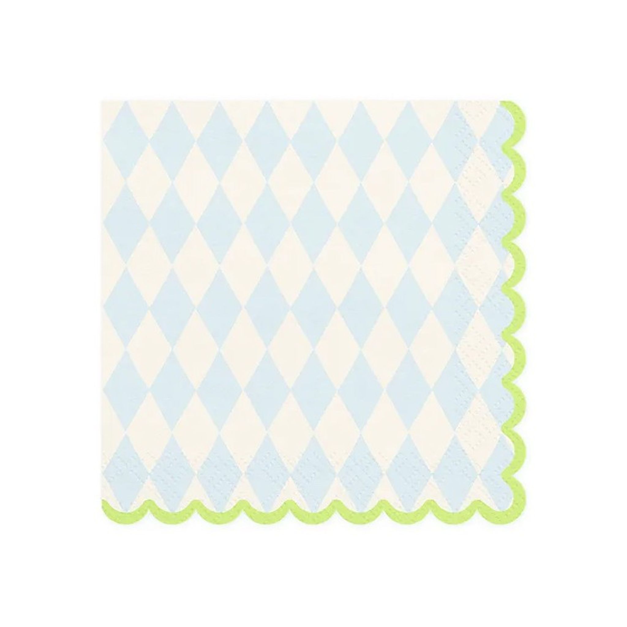 Servetter med ljusblå harlequin mönster och limegrön vågig kant. Fina att duka upp med till kalaset i pastellfärger, Påsklunchen eller andra tillfällen när du vill ha servetter som sticker ut.