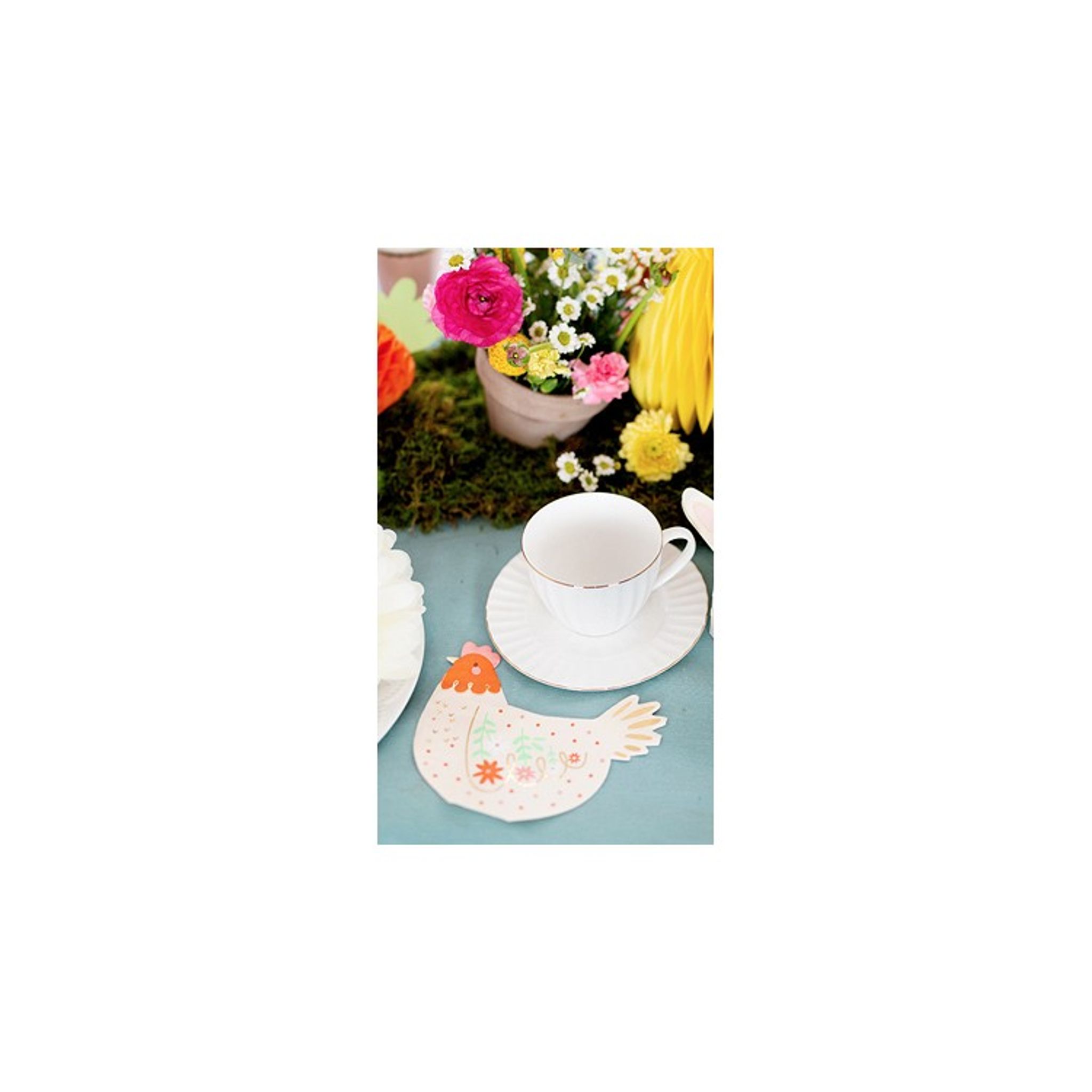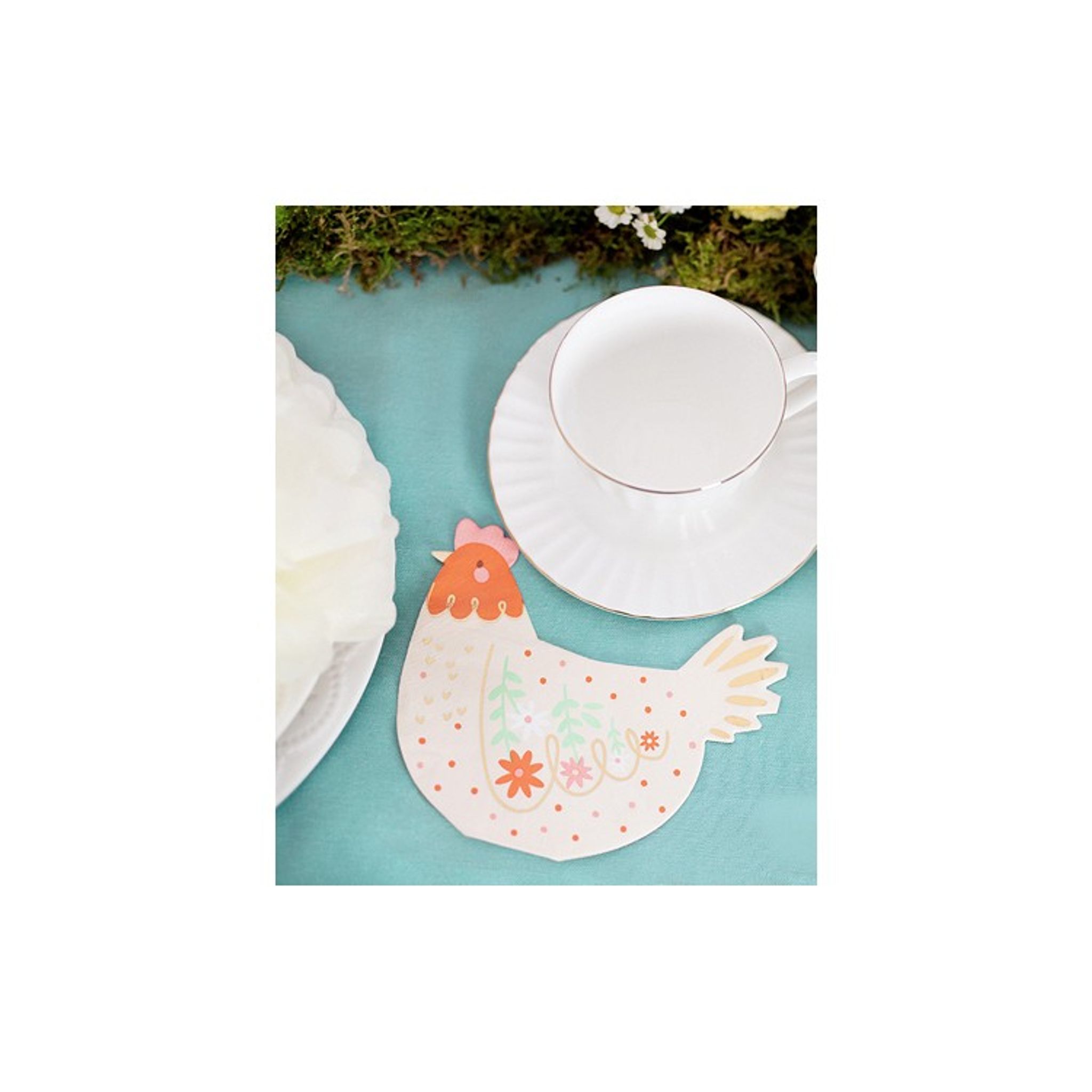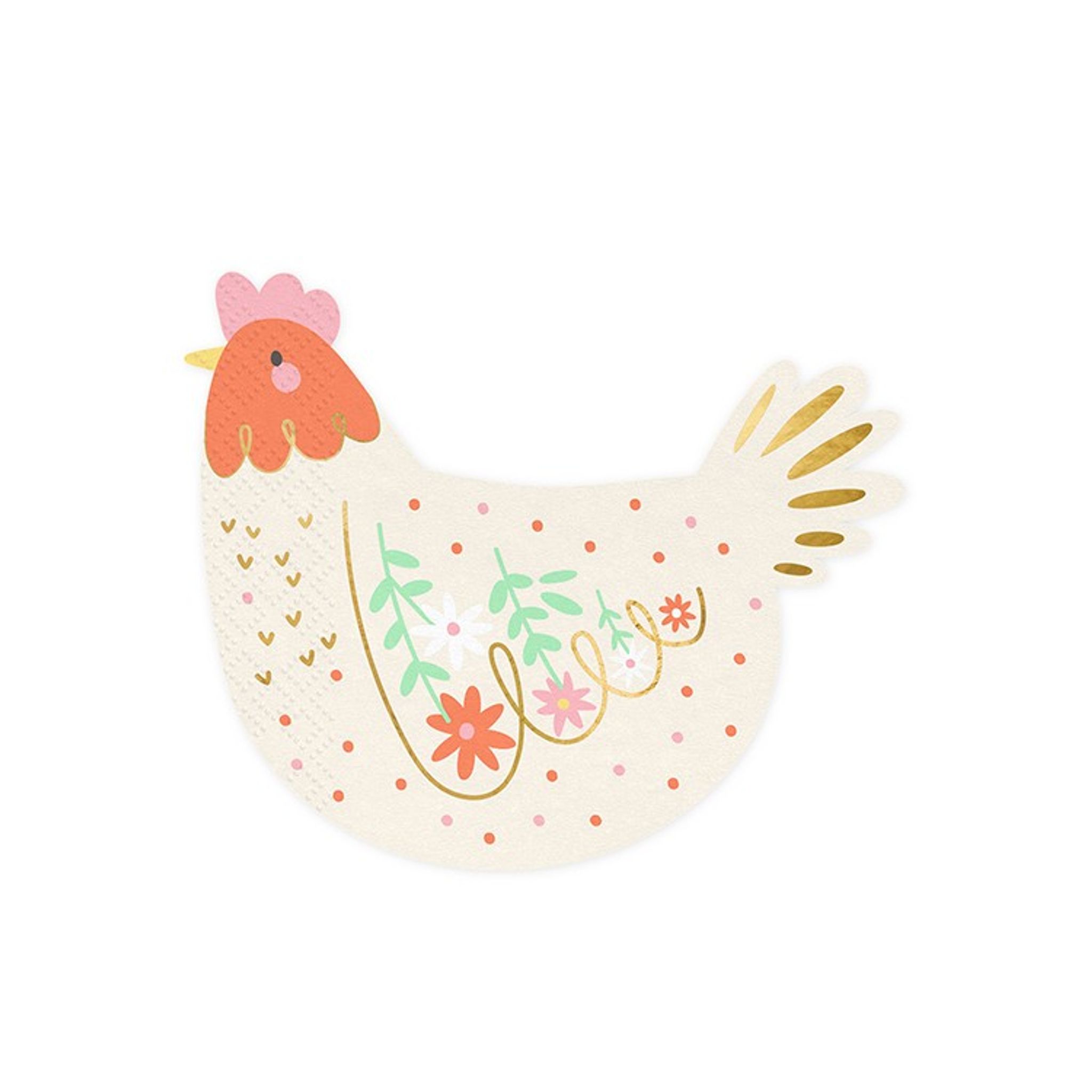 Med de här söta hönservetterna kan du få till en förtjusande dukning både inför kalas och till påsk. Servetterna är ljust beige i botten och pryds av detaljer i folierad guld sam färgglada blommor och prickar.