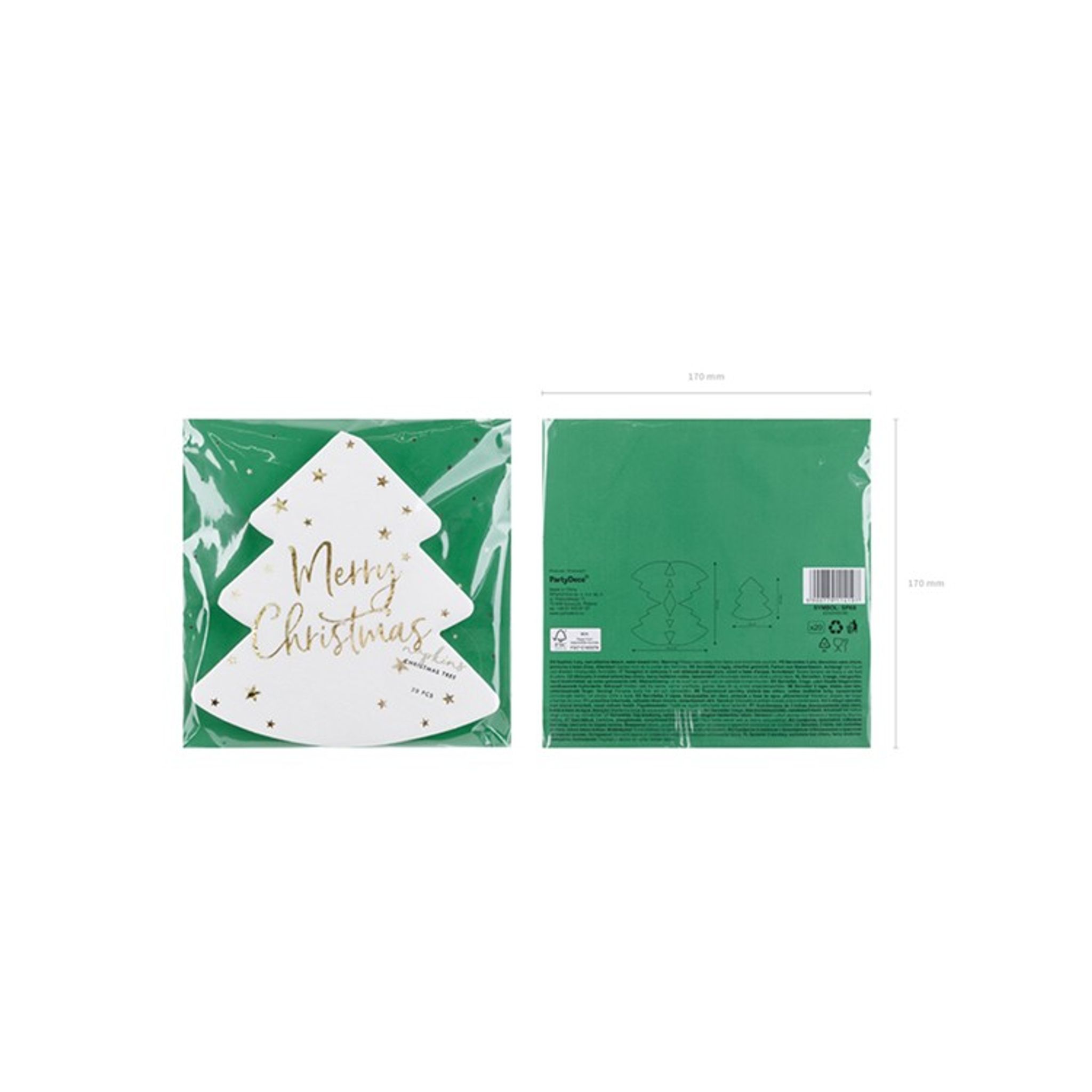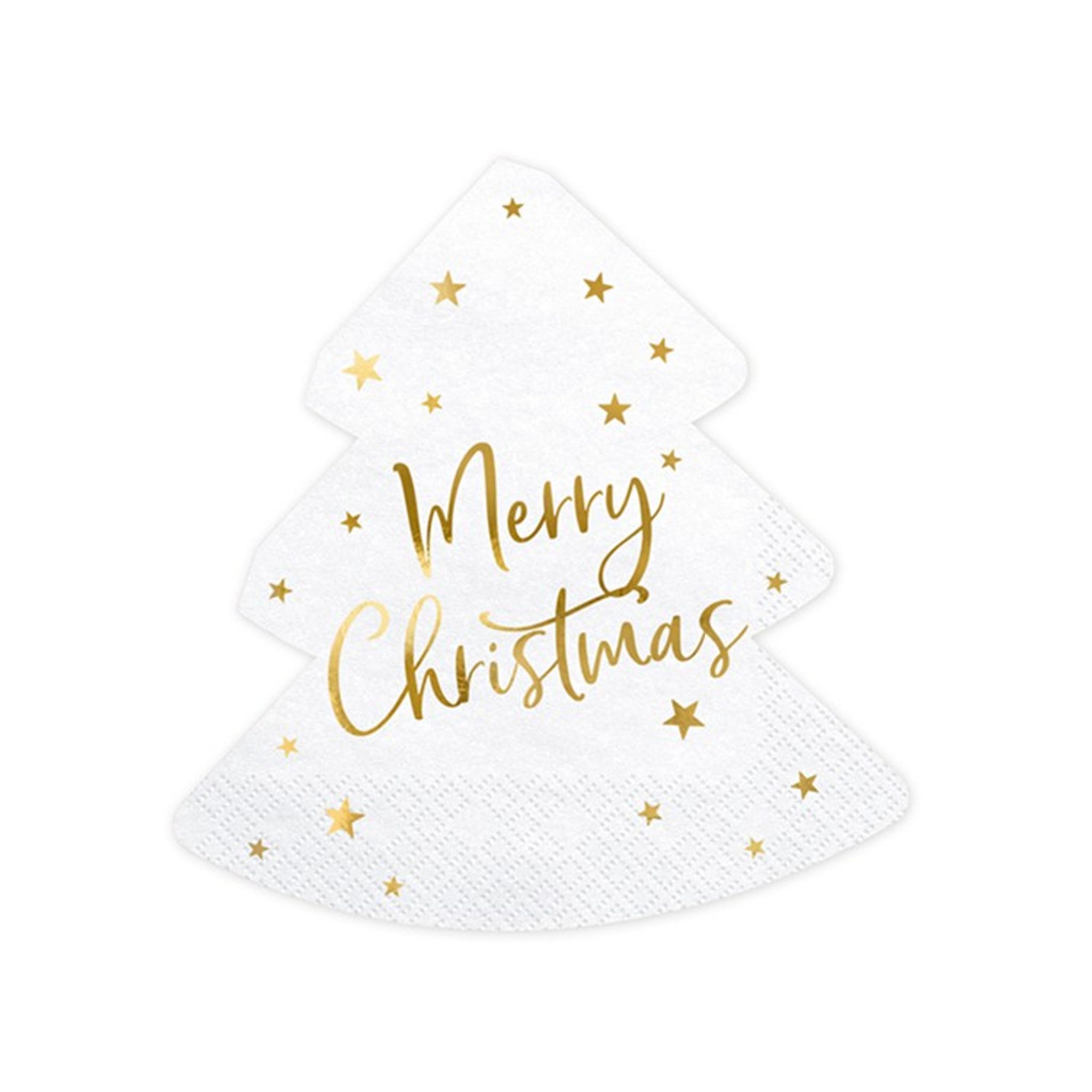 Pappersservetter med formen som en gran i vitt och texten Merry Christmas. Snygg detalj till juldukningen. Priset avser 20 st servetter. Storlek: 16 x 16,5 cm.