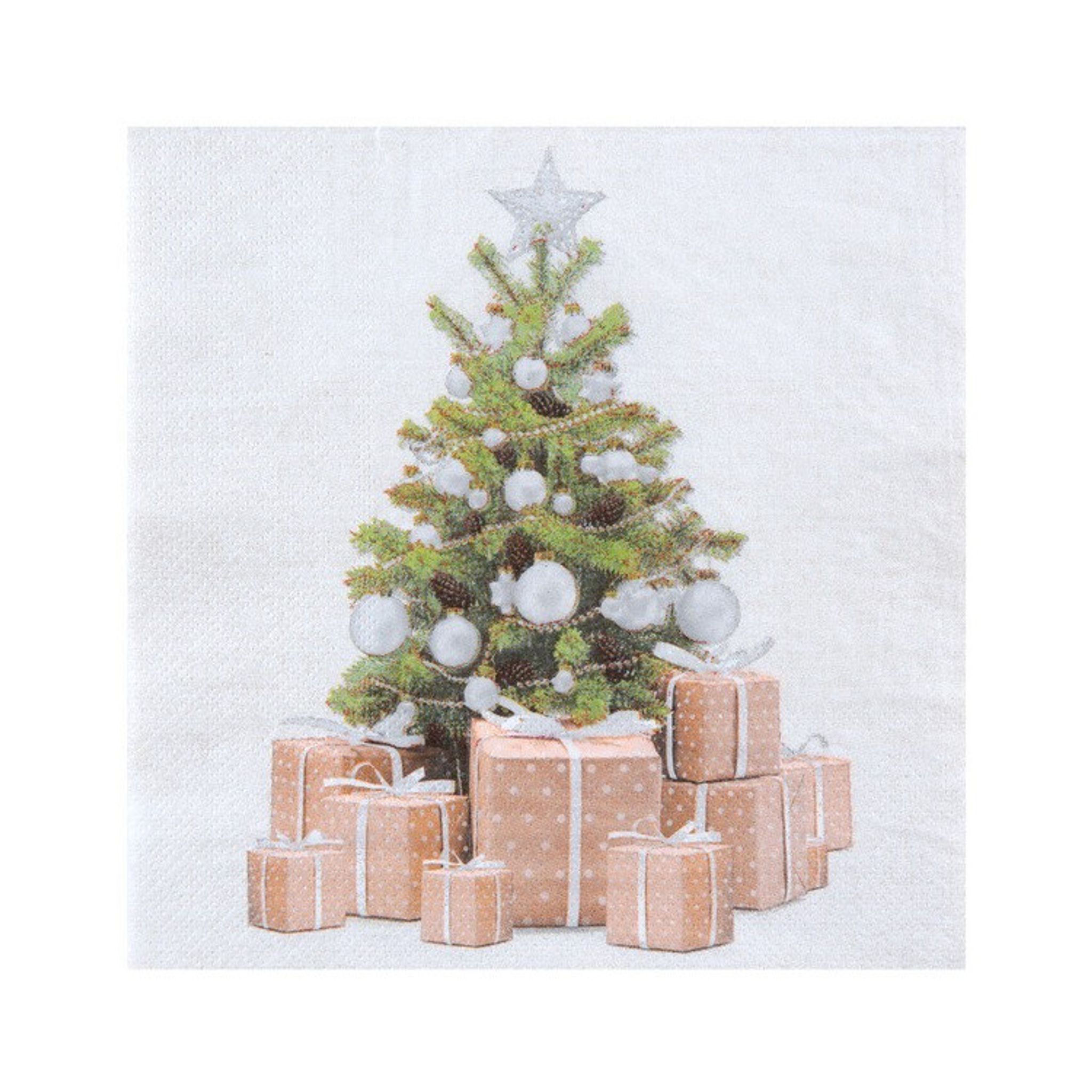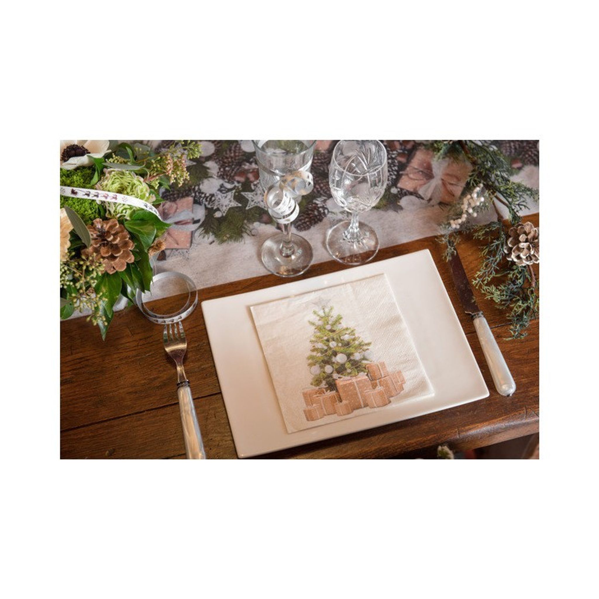 Snygga lunchservetter som passar perfekt att använda till julbordet. Servetterna har en beige/gråaktig nyans i bakgrunden och sedan motiv av en pyntat julgran med naturfärgade julklappar.
