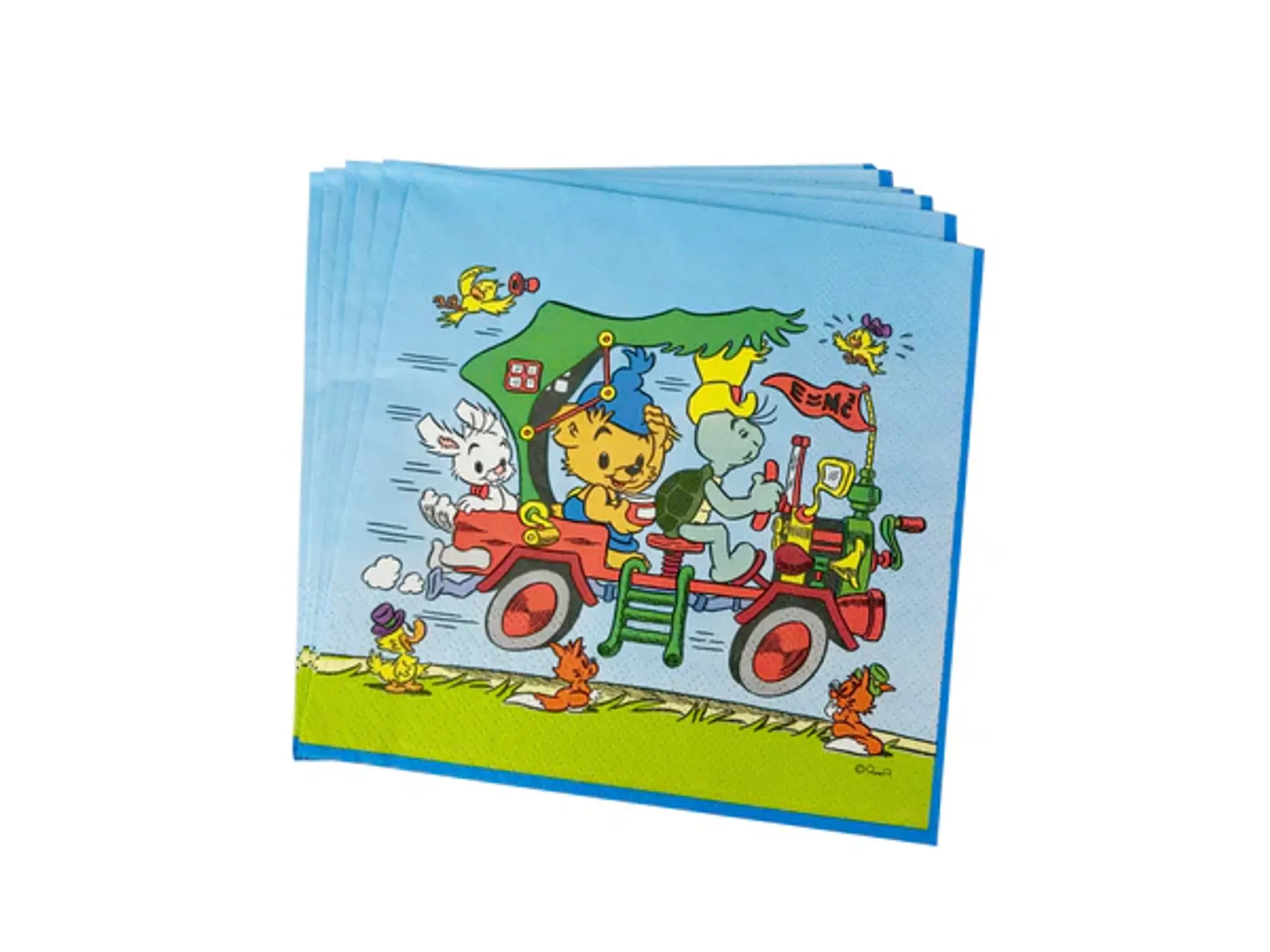 Dessa charmiga servetter med motiv av Bamse och hans vänner är ett perfekt tillskott till ett kalas i Bamse-tema. De är både dekorativa och praktiska – perfekta för att torka kladdiga händer eller duka upp ett färgglatt fikabord. Servetterna är 3-lagers, mäter 33 x 33 cm när de är helt utvikta och levereras i 16-pack.
