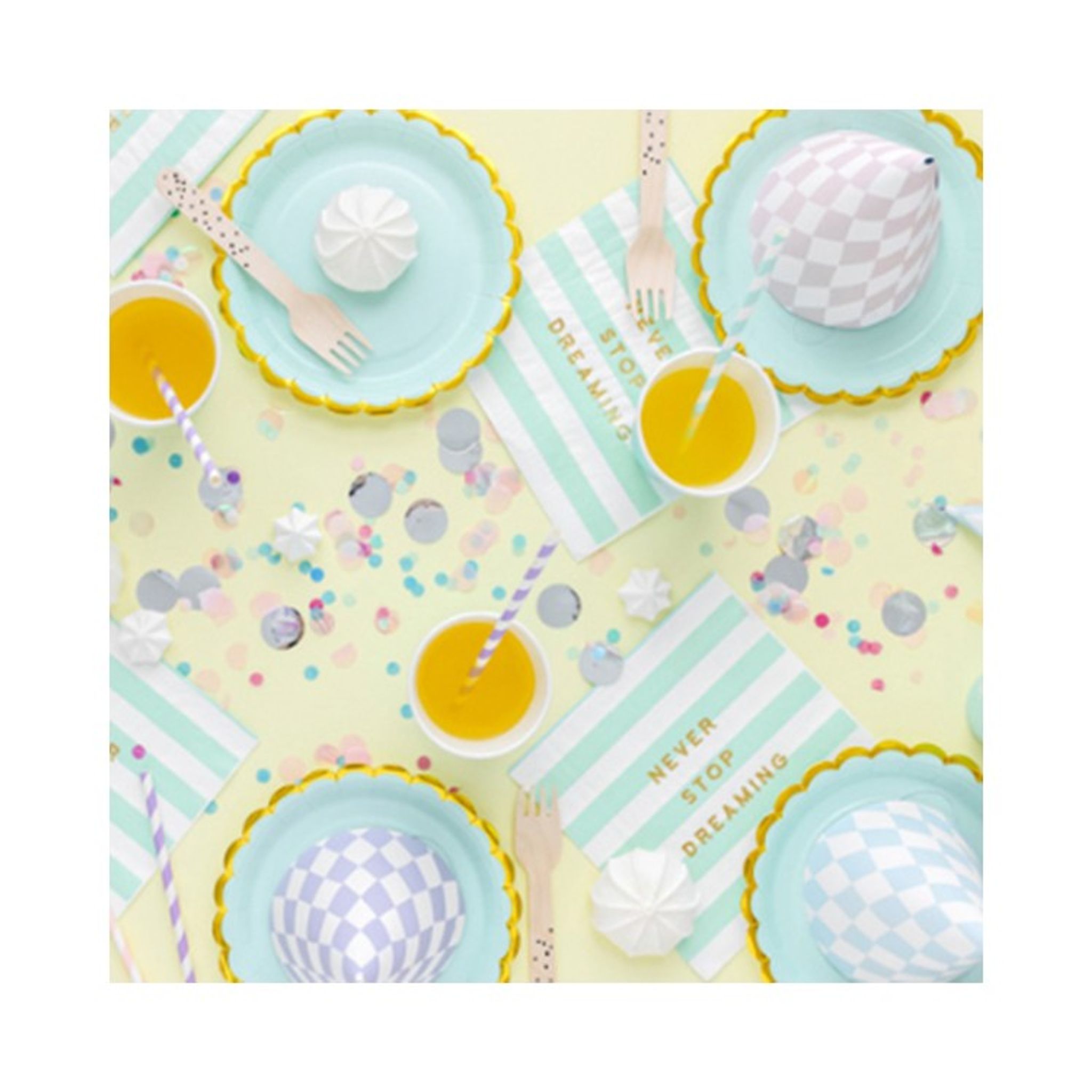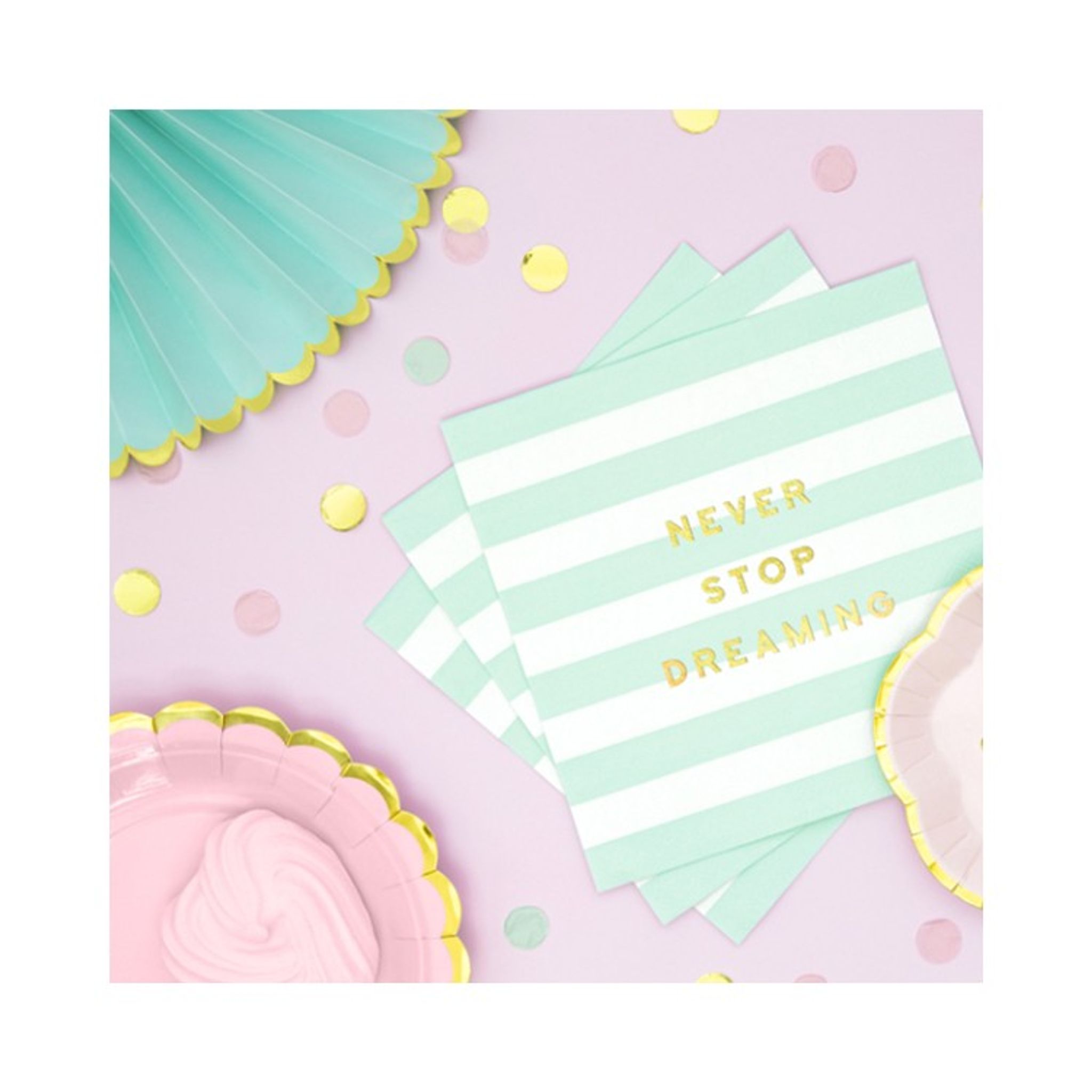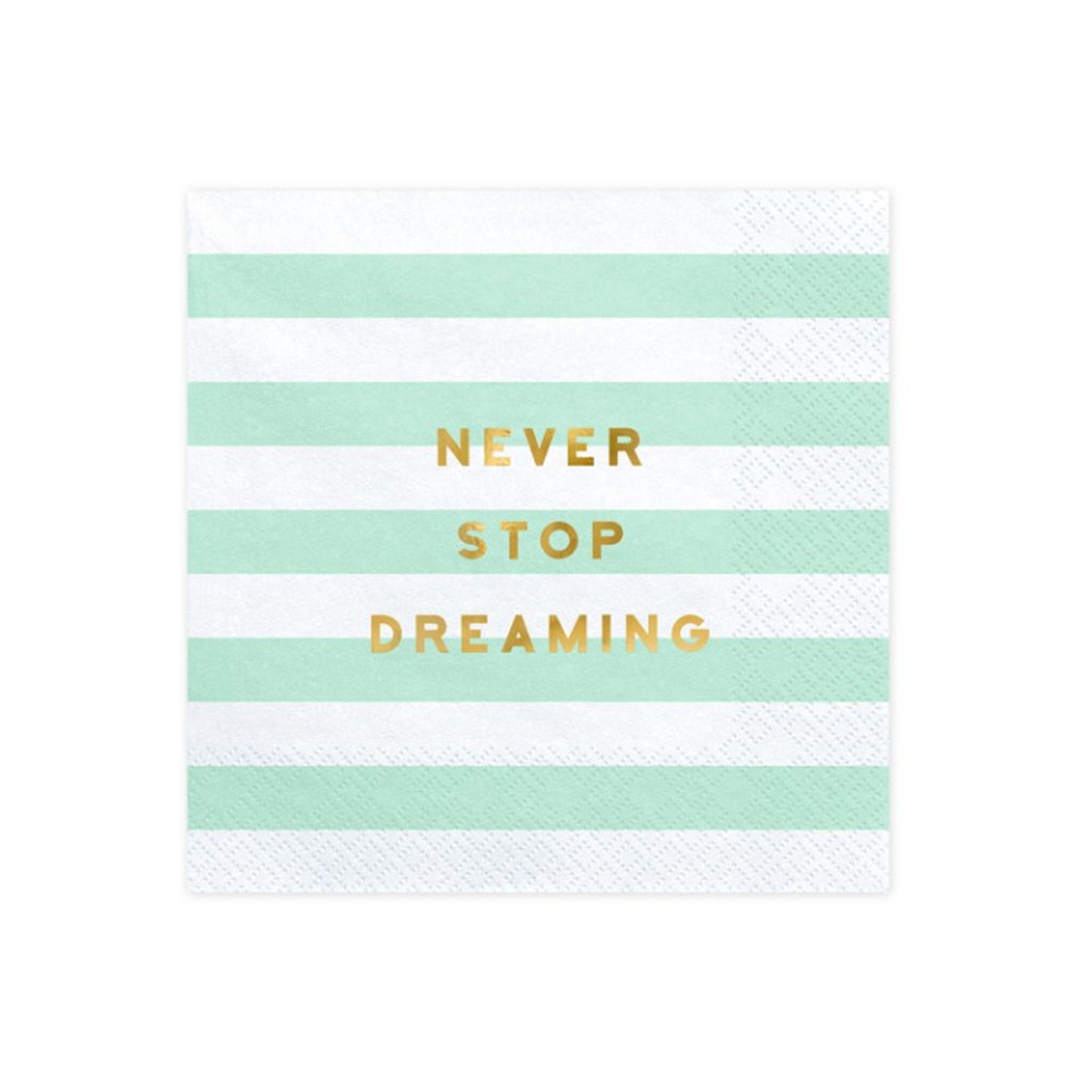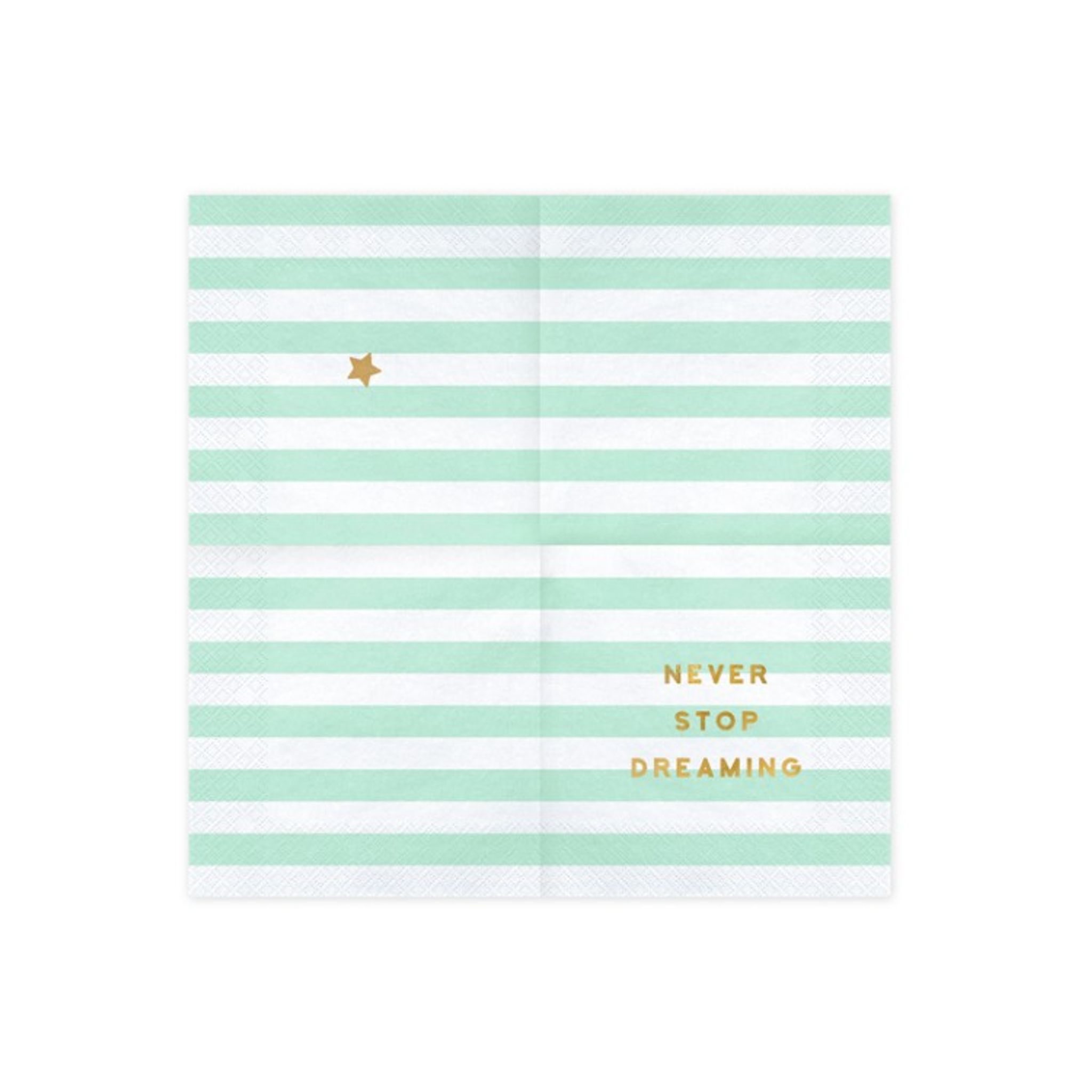 Randiga servetter i vit och mintgrön med texten Never stop dreaming. Storlek: 16,5 x 16,5 cm. Förpackningen innehåller 20 stycken servetter.