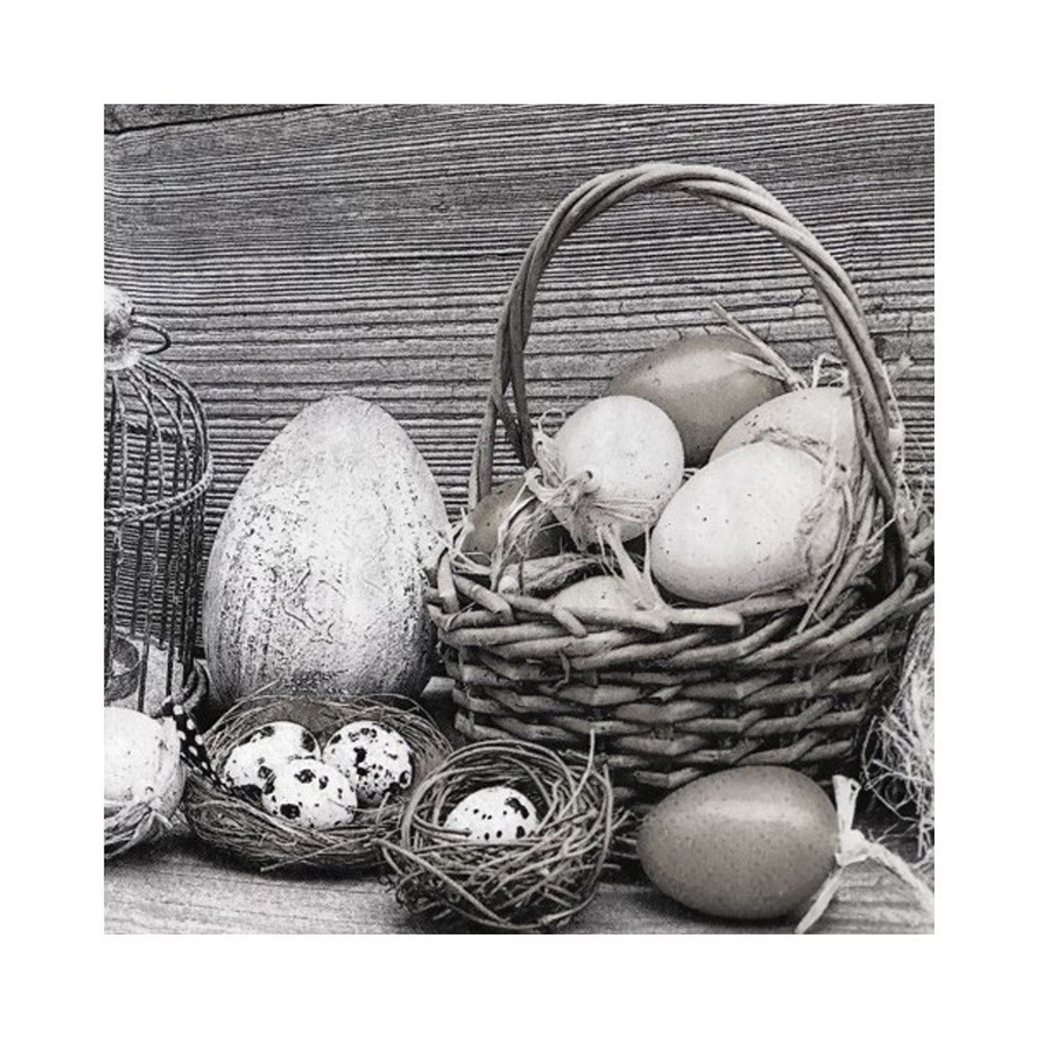 Härliga servetter med ena sidan i gråa nyanser med motiv av påskägg samt baksida med ett fång färgglada tulpaner. På så sätt kan du välja om dukningen ska innehålla en mix av fina färger eller om du hellre önskar en stilren, dov dukning. Dessa passar perfekt att använda vid dukningen vid påsk.