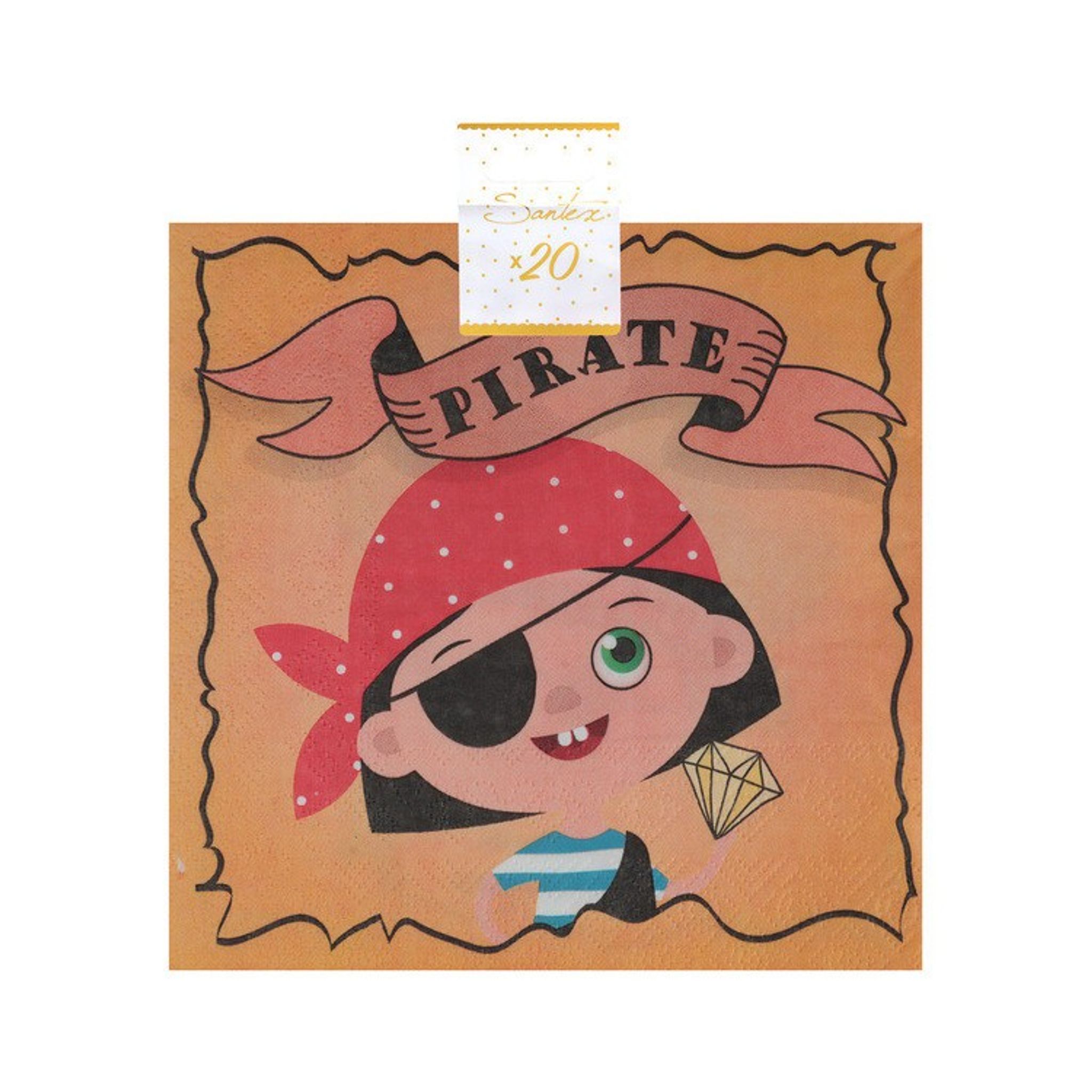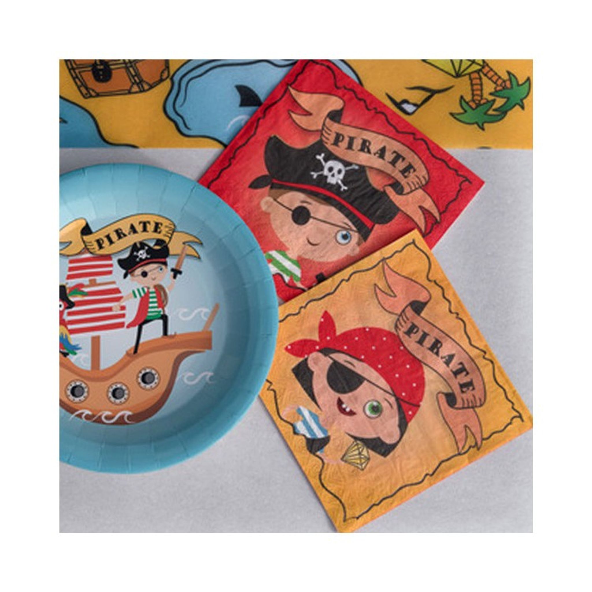 Piratservetter till piratkalaset. Duka upp för piratkalas! Färgglada piratservetter är utmärkt på barnkalaset för den lilla piraten. Duka med på gästernas platser vid kalasbordet eller lägg ut på kakfaten. Servetterna har motiv av glada små pirater med pirathatt samt texten "Pirate" i en banderoller. Fina servetter med pirattema när det vankas födelsedagskalas för piratfantasten!