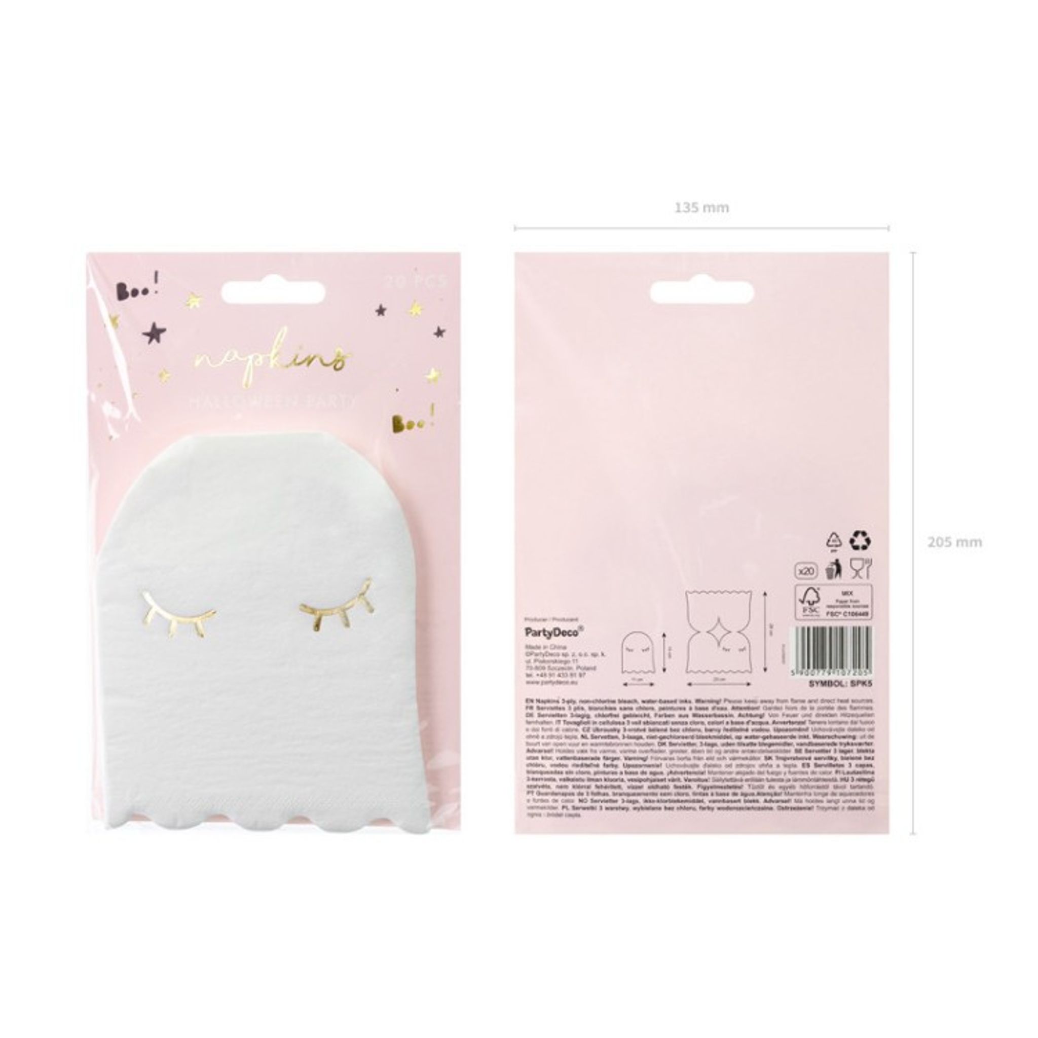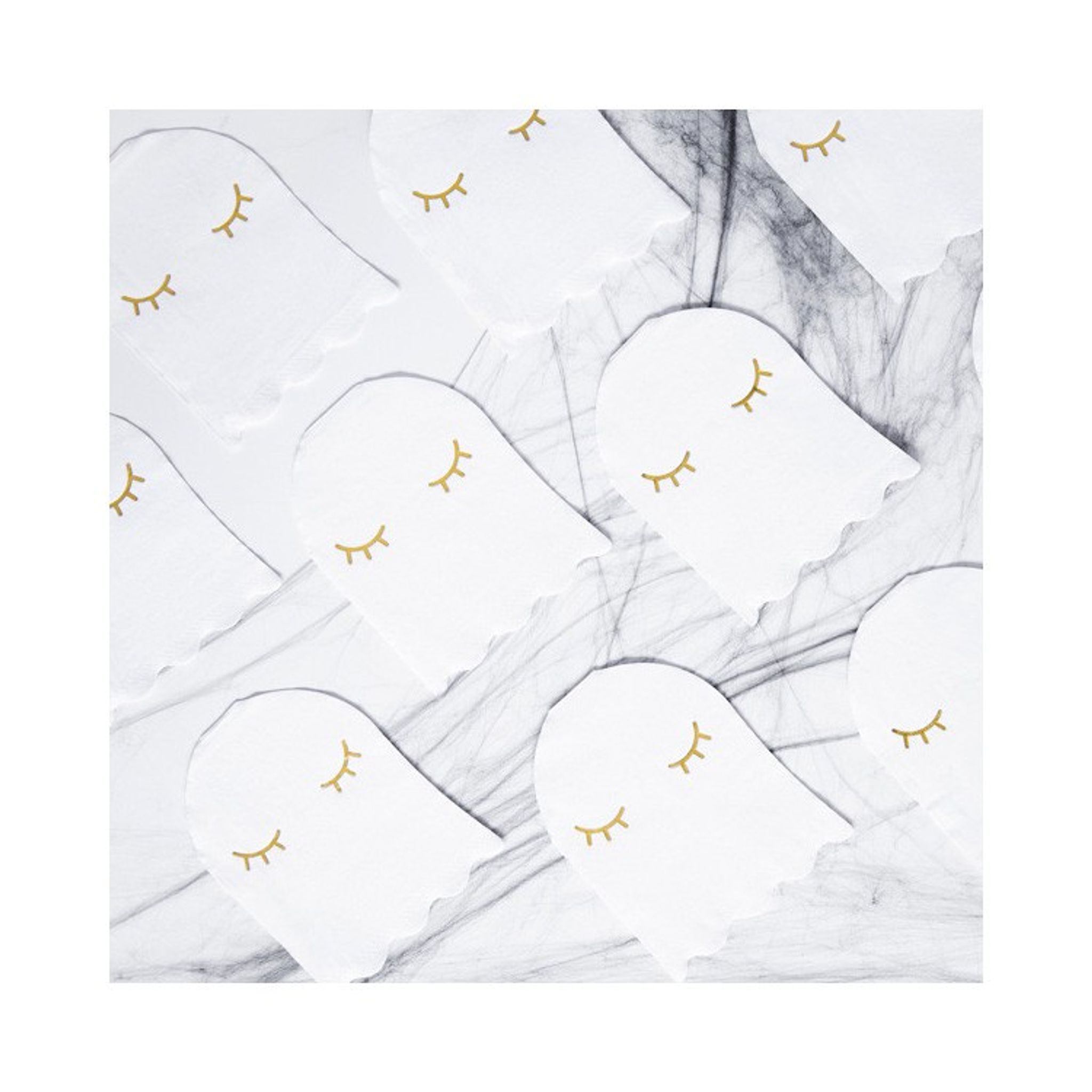 Duka upp till halloweenfest eller kalas med dessa snygga servetter. De är formade som vita små spöken med stängda ögon i guld. Mycket läcker detalj vid dukningen och även praktiskt då det lätt blir lite extra kladdigt när det är kalas!