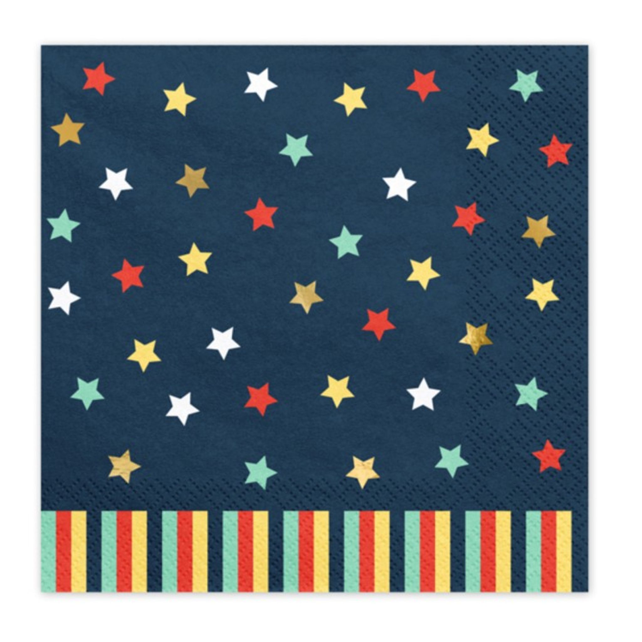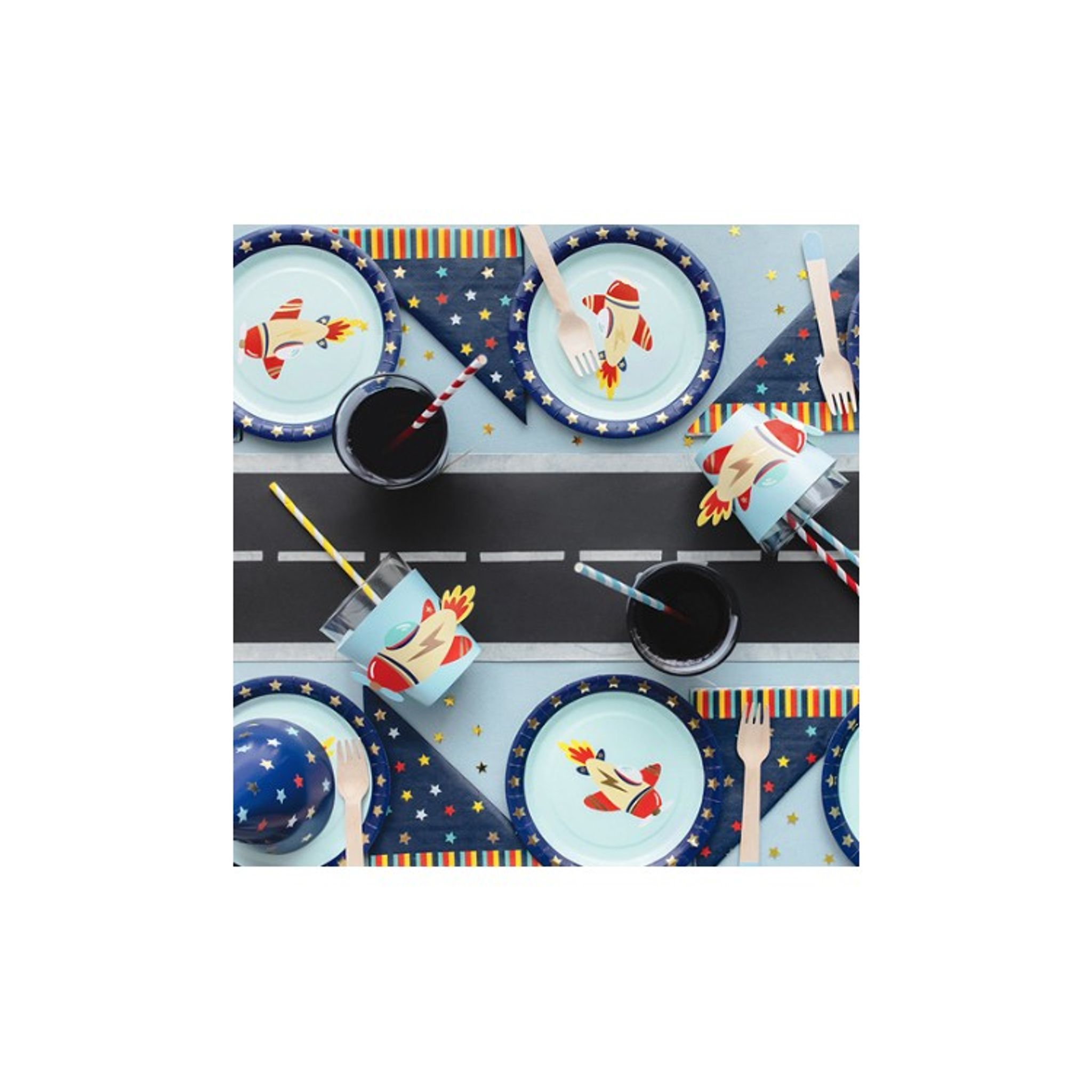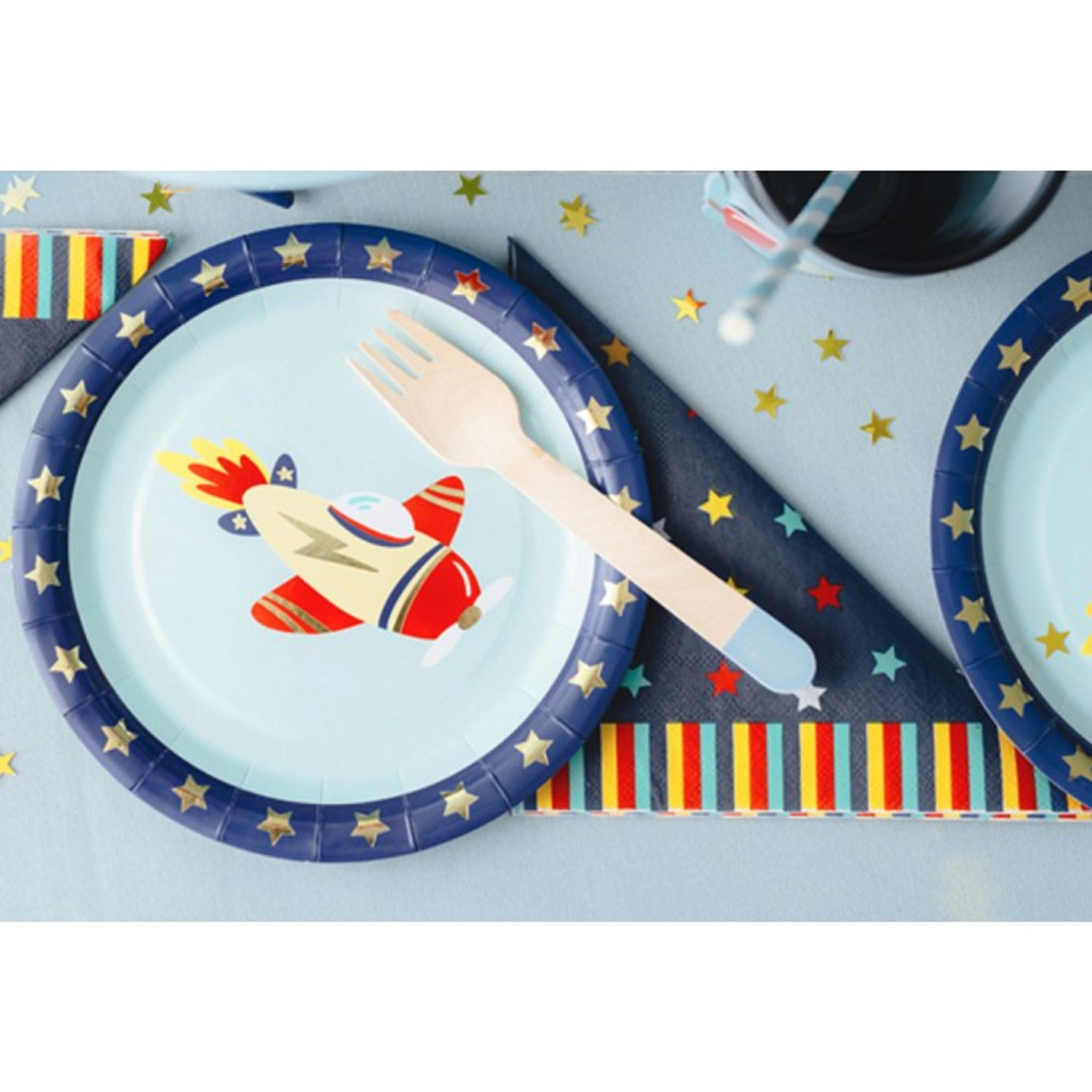 Pappersservetter med motiv med färgglada stjärnor mot mörkblå bakgrund. Härliga att duka tillsammans med ditt kalas med flygplanstema. Servetterna har två lager och är 16,5 x 16,5 cm.