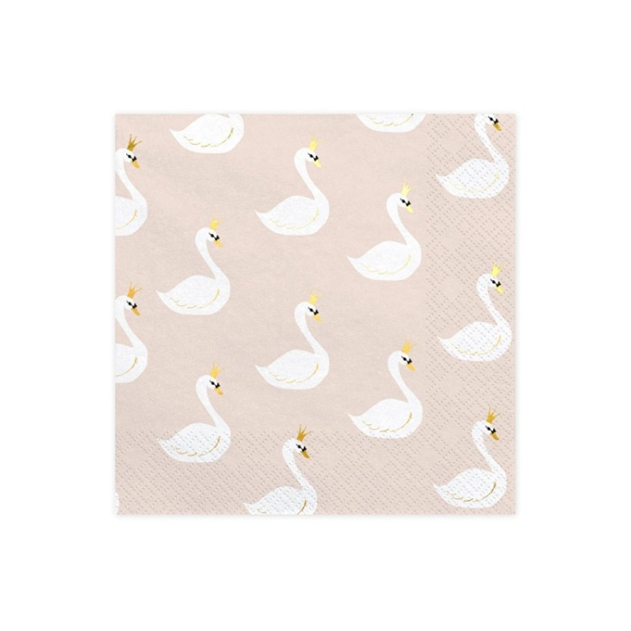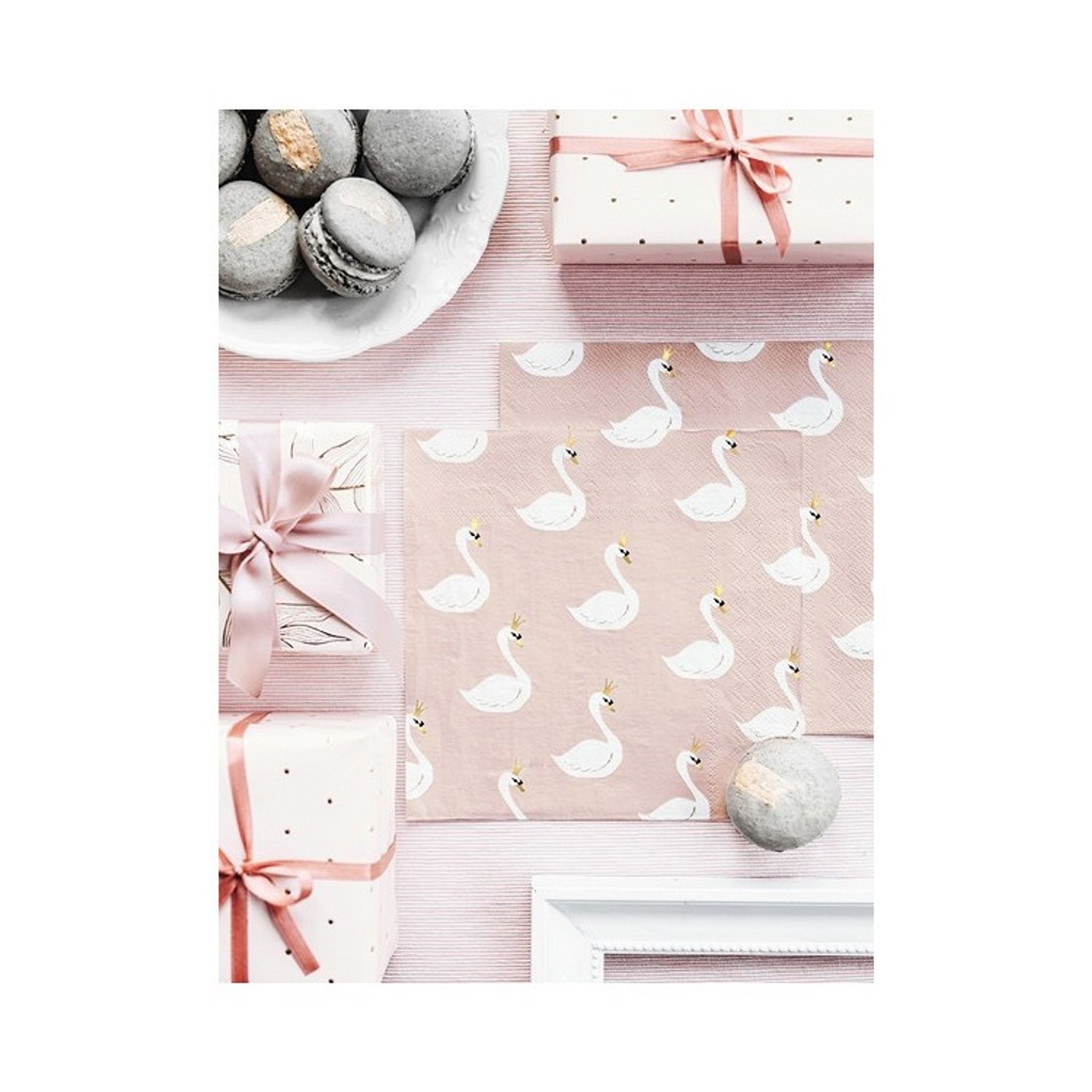 Lunchservetter i en härlig gammelrosa färg med motiv av vita svanar med guldkronor. Blir en mycket snygg detalj vid dukningen på t.ex dopet eller namngivelsen. Mixa och matcha gärna med övriga svanprodukter om du vill skapa ett härligt svantema.