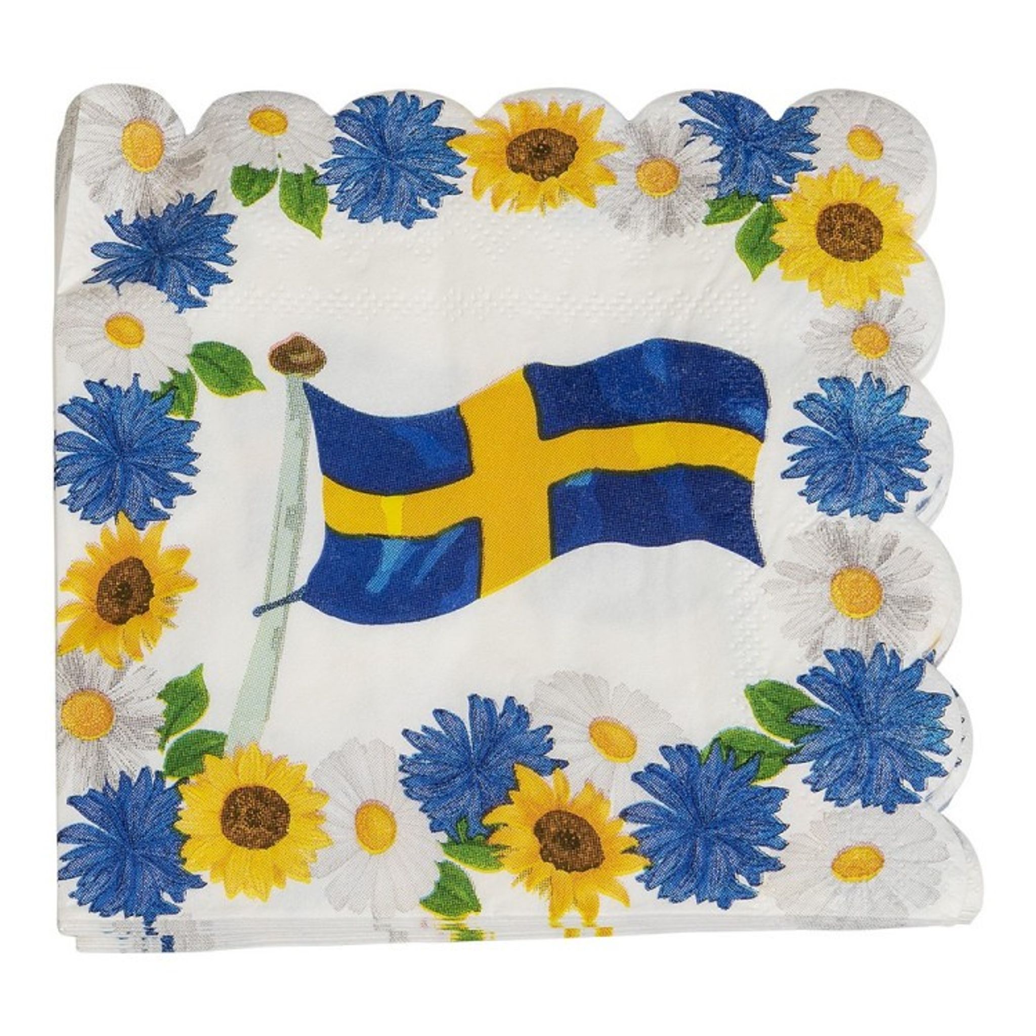 Servetter Svenska Flaggan Blommor. Klassiska servetter med en finurlig touch av fint utskurna sidor. Passar perfekt tillsammans med din midsommar dekoration eller till vilken varm sommardag som helst. Med den svenska flaggan i topp och vackra sommarblommor sätter du nivån på middagsstämningen redan vid dukningen. Tillsammans med andra somriga dekorationer som ängsblommor och färgglada serpentiner kommer du komma långt.