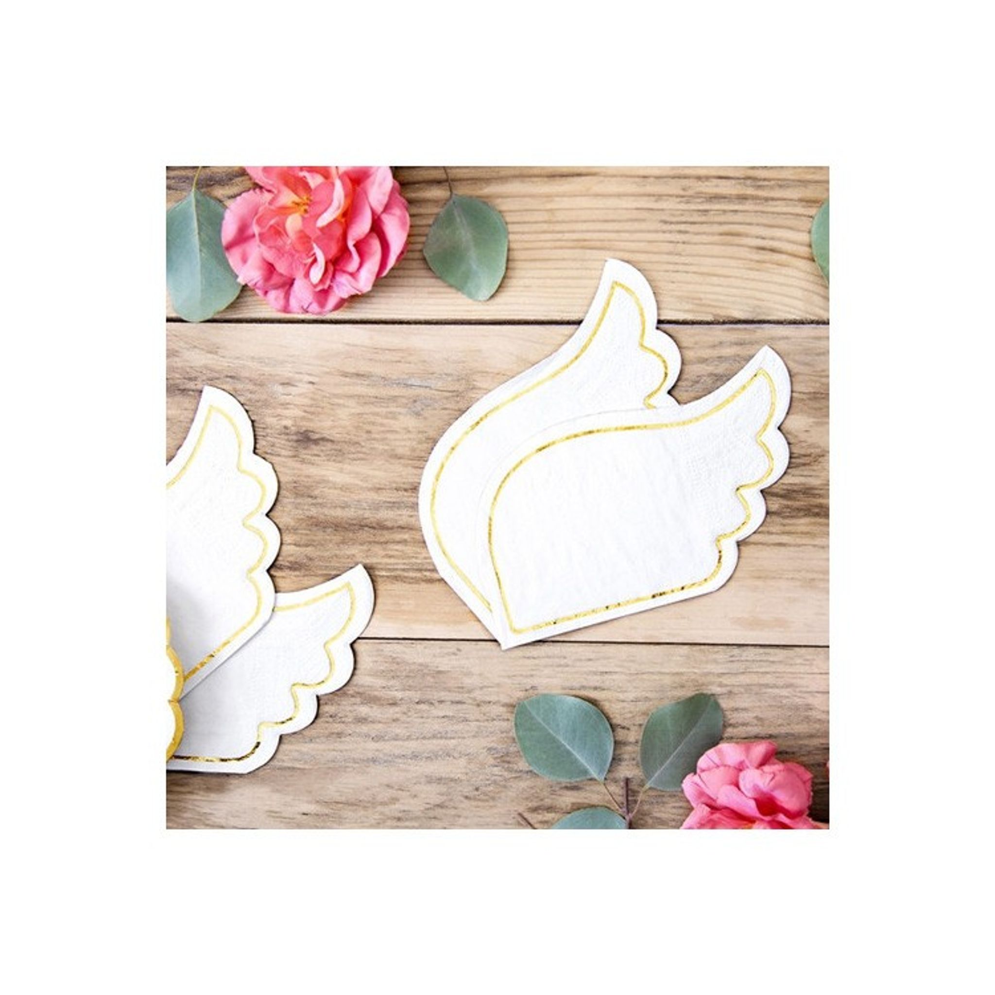 Dop, babyshower, konfirmation eller barnkalas - dessa servetter är perfekta vid alla möjliga tillfällen! Servetterna är formade som vingar, med guldig ram, och känns därför extra lyxiga och fina att duka med. Kombinera med vita kalastillbehör eller varför inte vackra pastellfärger?