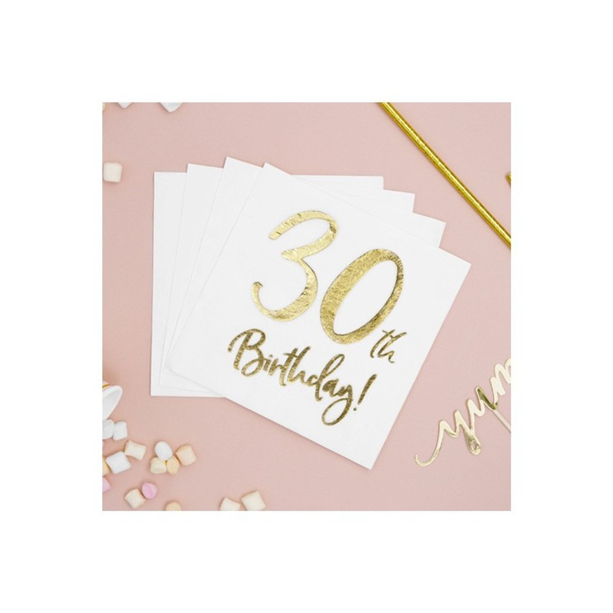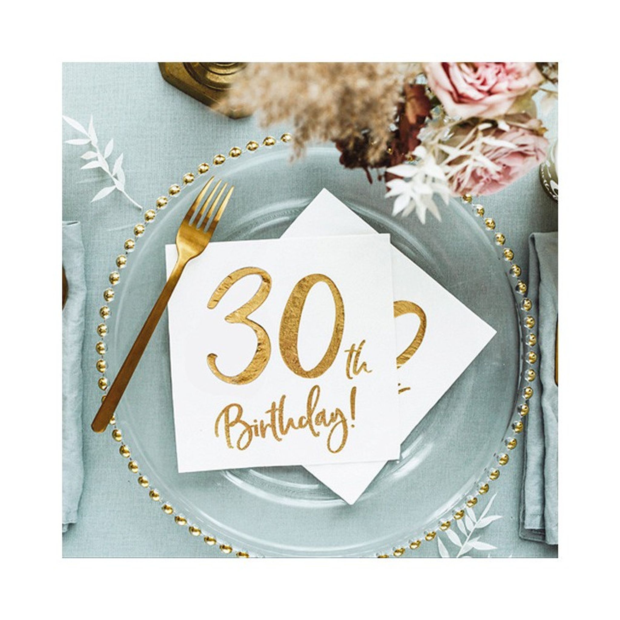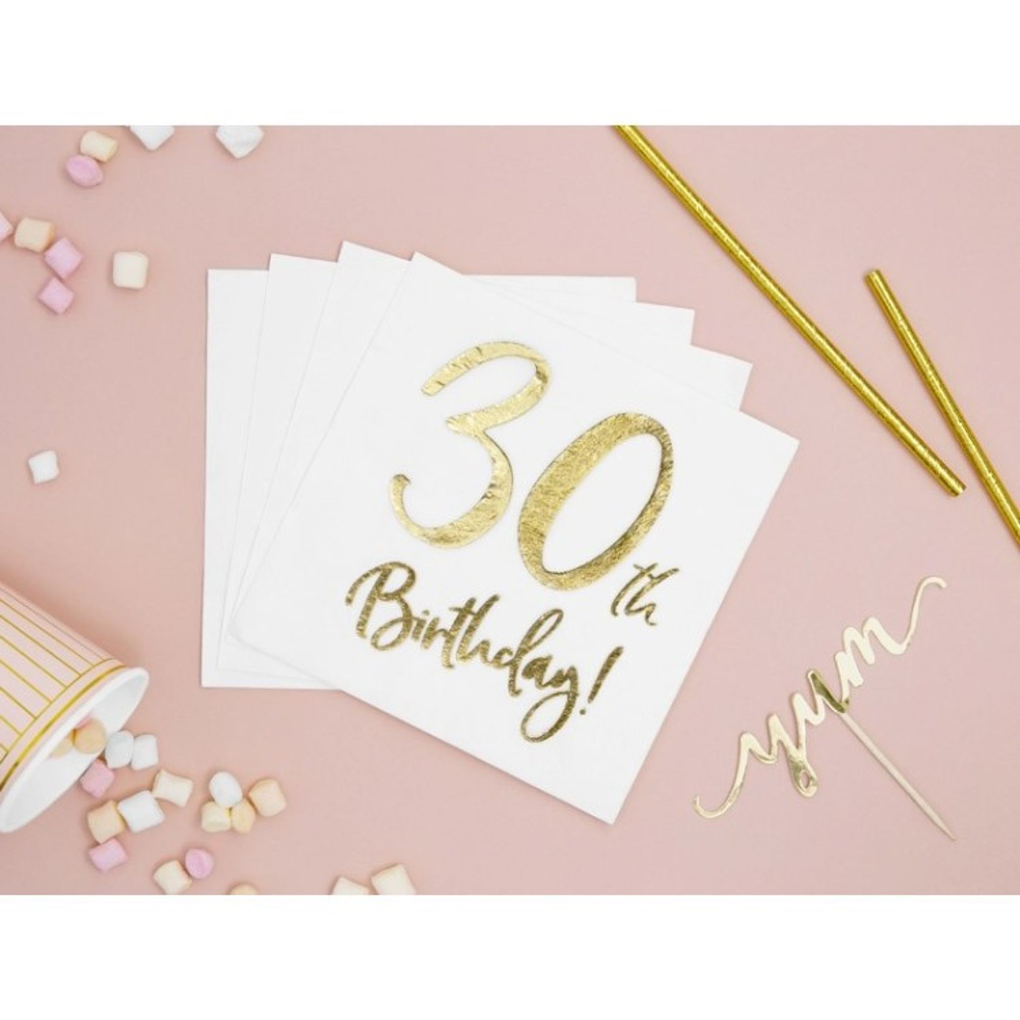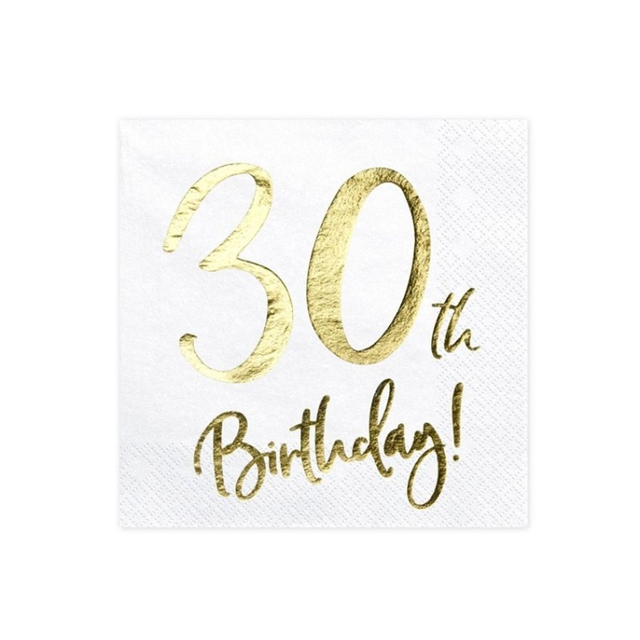 Skall du bjuda in dina vänner till ett 30 års kalas? Då vill du säkert duka riktigt fint och varför inte duka med snygga servetter som har siffran 30 i guld som dekor? Dessa snygga lunchservetter passar perfekt till 30 års-festen och du kan enkelt matcha dom med våra övriga partytillbehör, tex våra vita snygga engångsprodukter med guldkant.