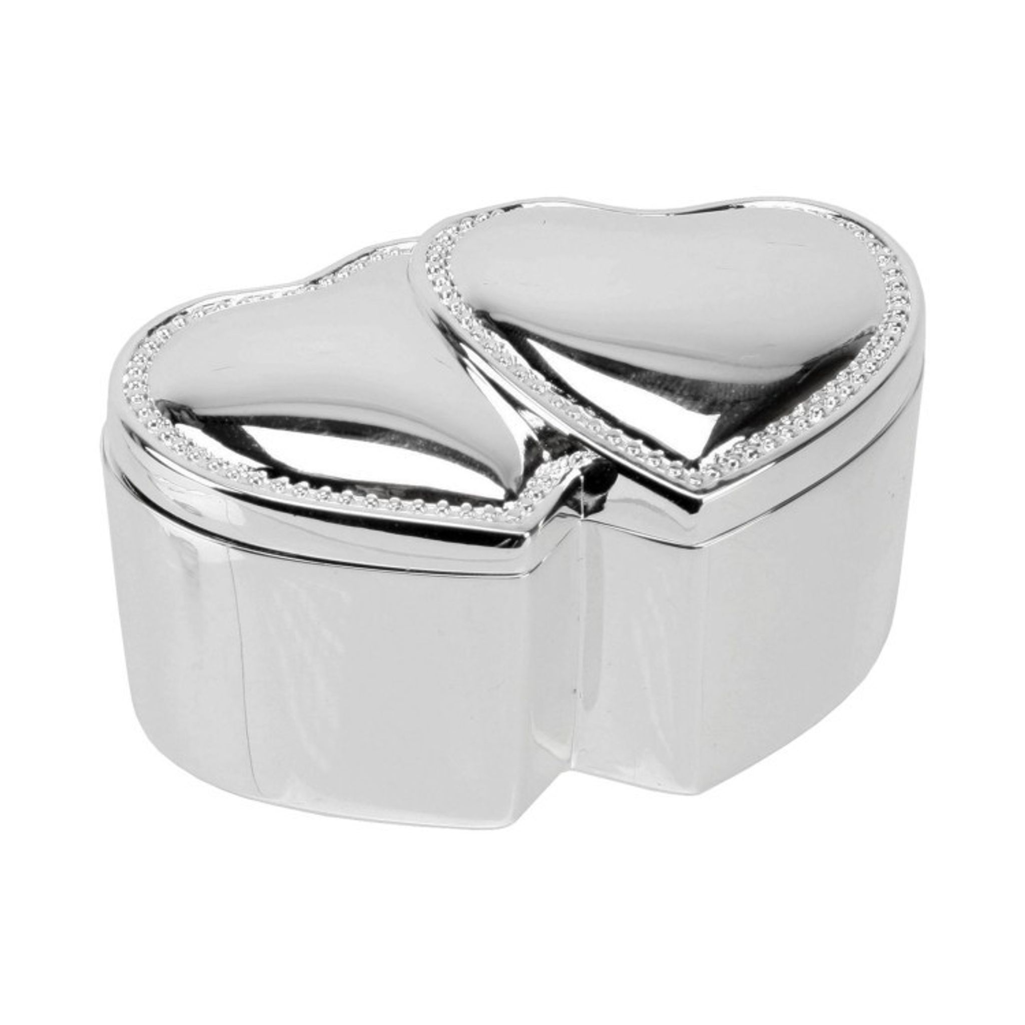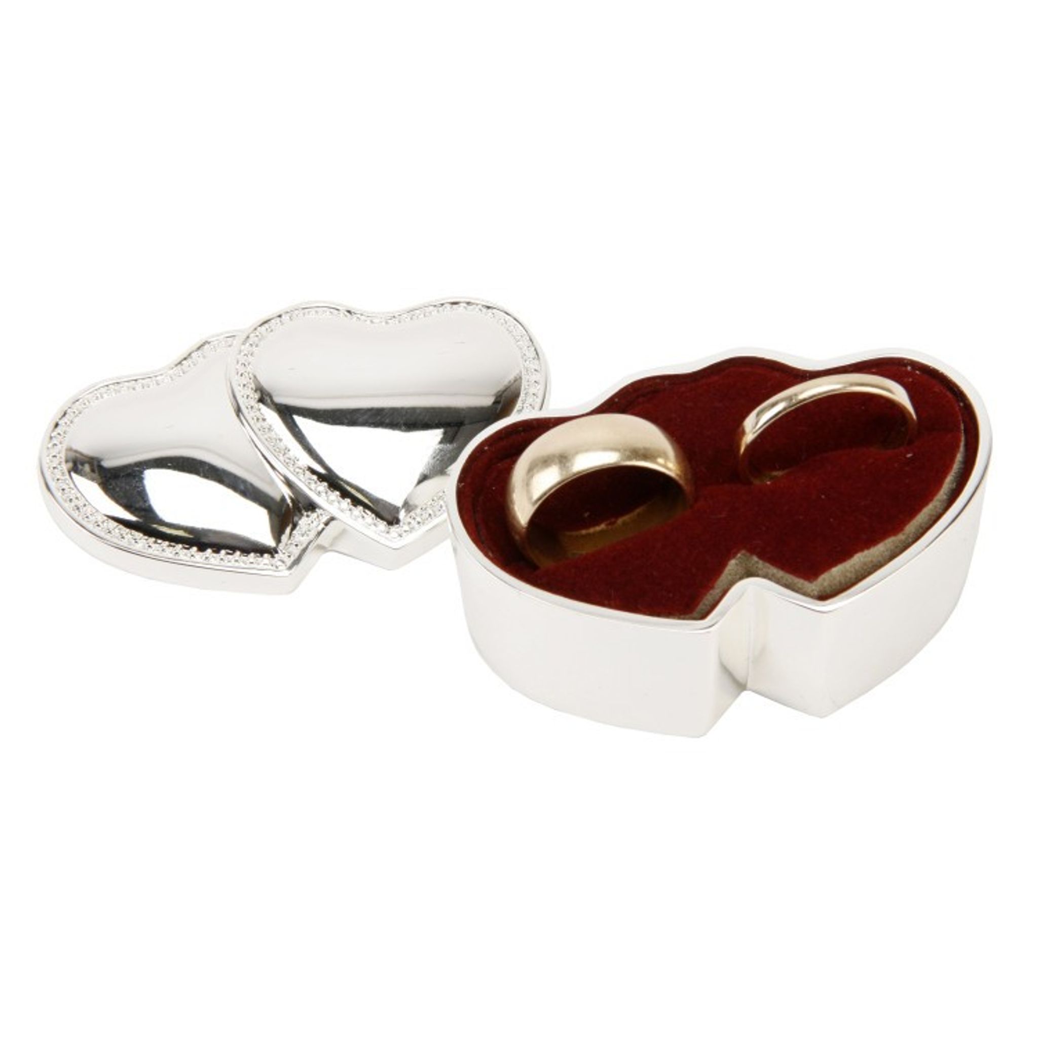 Supersöt liten silverpläterad ringask som är formad som två hjärtan. Perfekt att använda vid t.ex vigseln eller förlovningen för att förvara ringarna i. Insidan 'är klädd i mörkröd sammet och har två små springor som används för att snyggt placera ringarna.