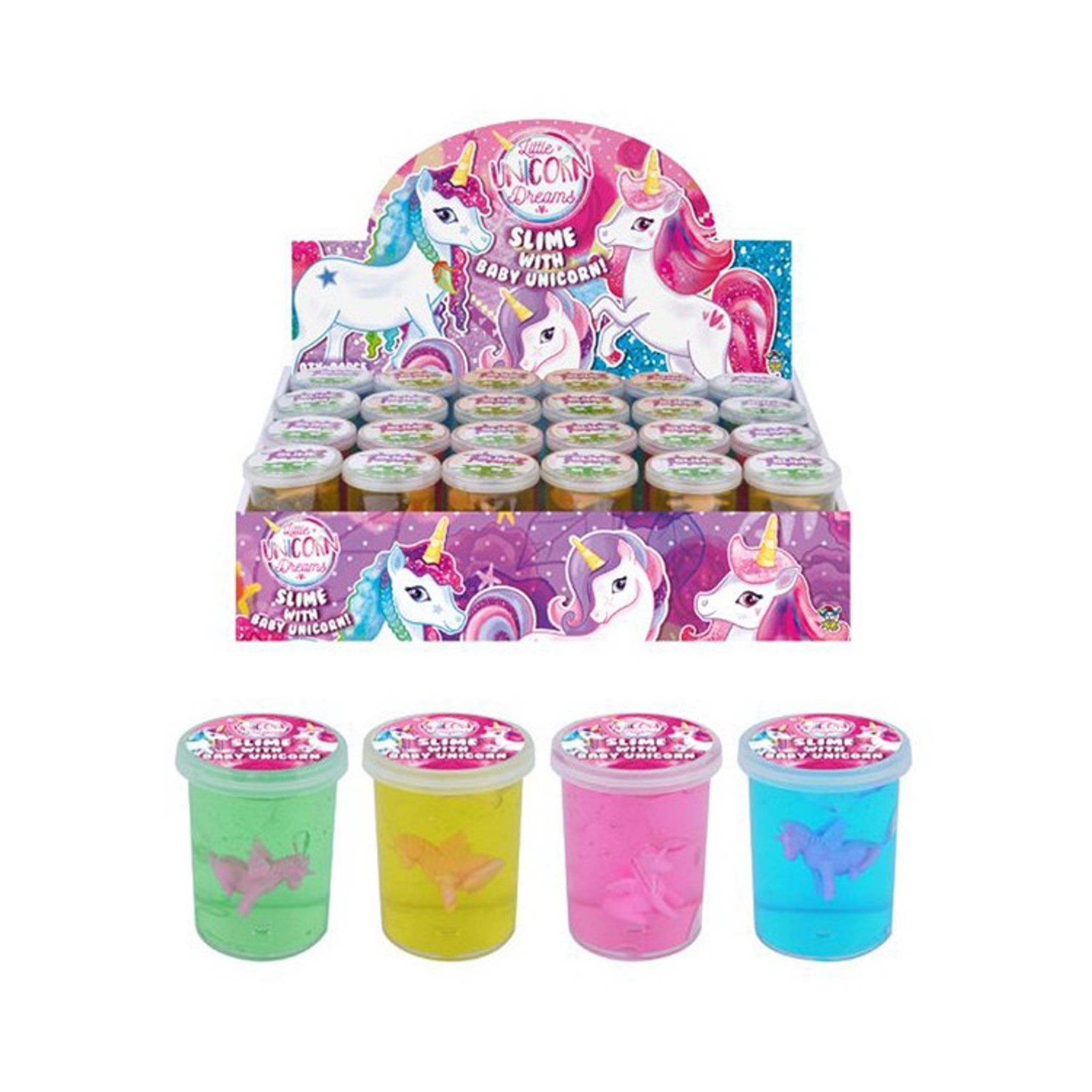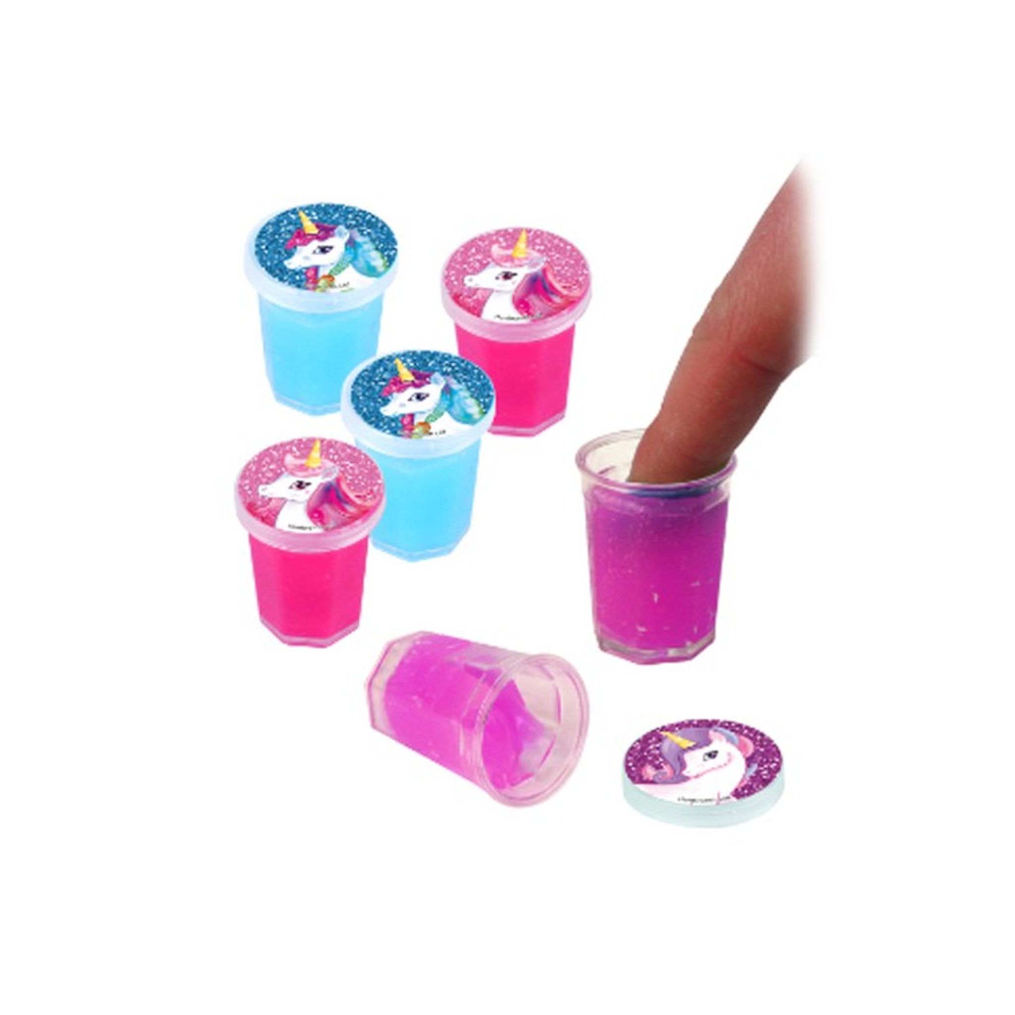 Miniburkar med färgglatt slime och enhörningsmotiv på locket.