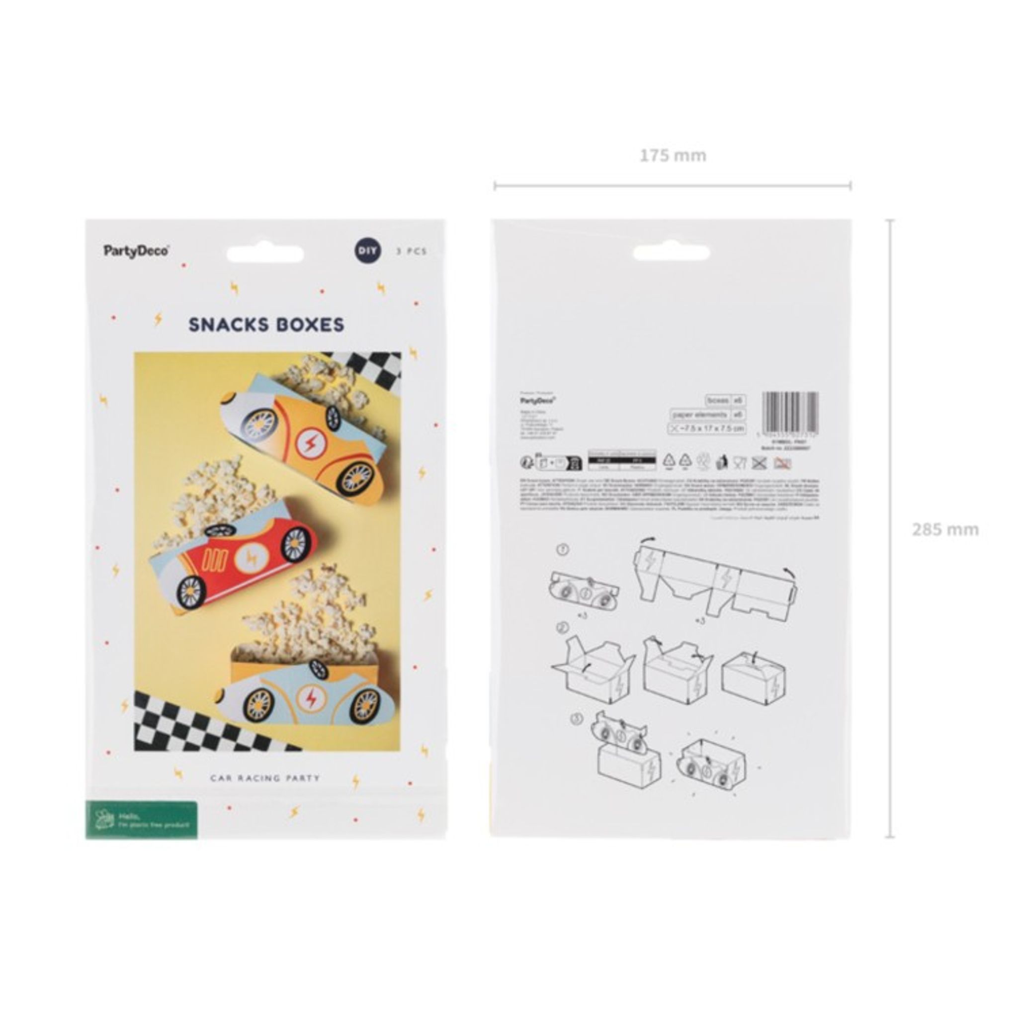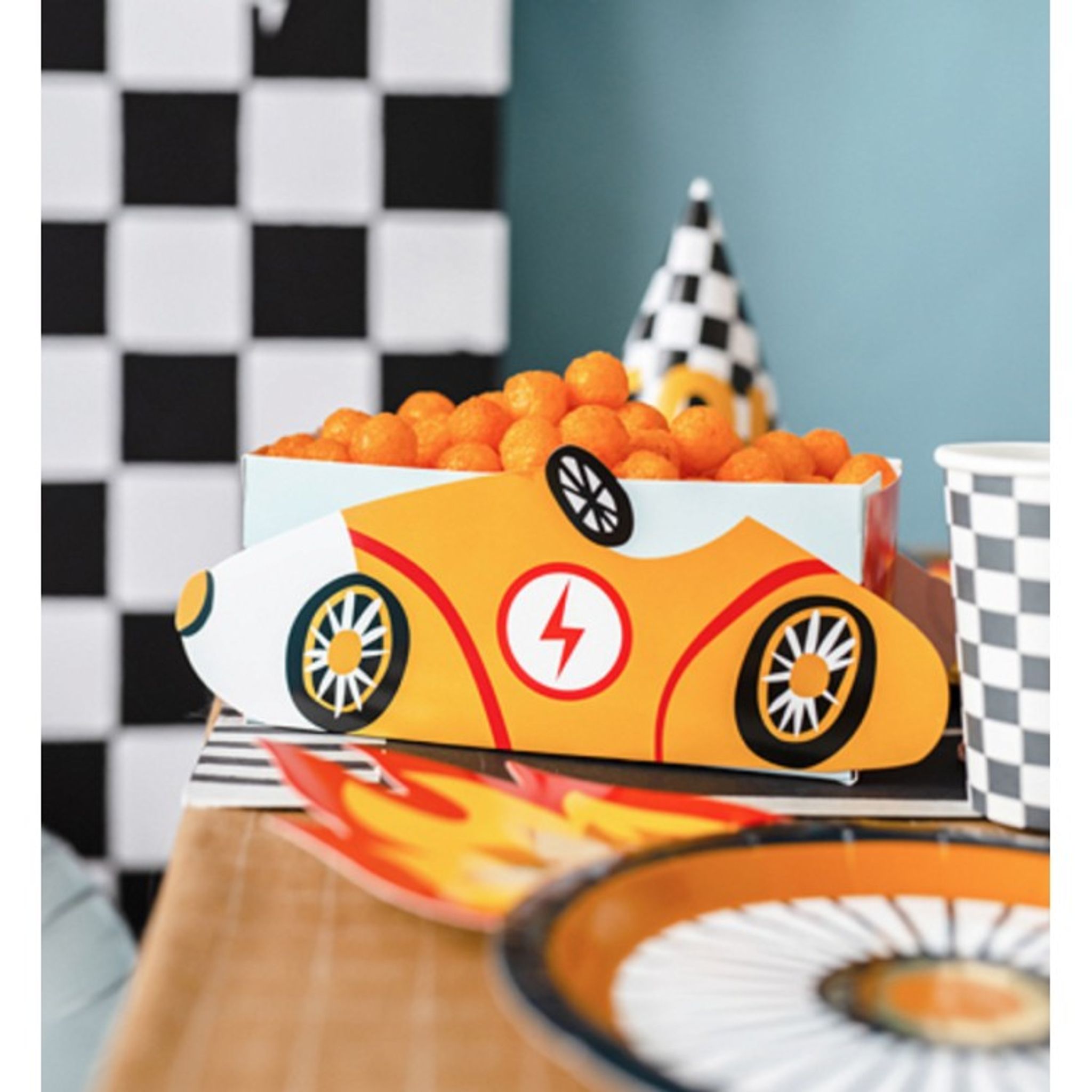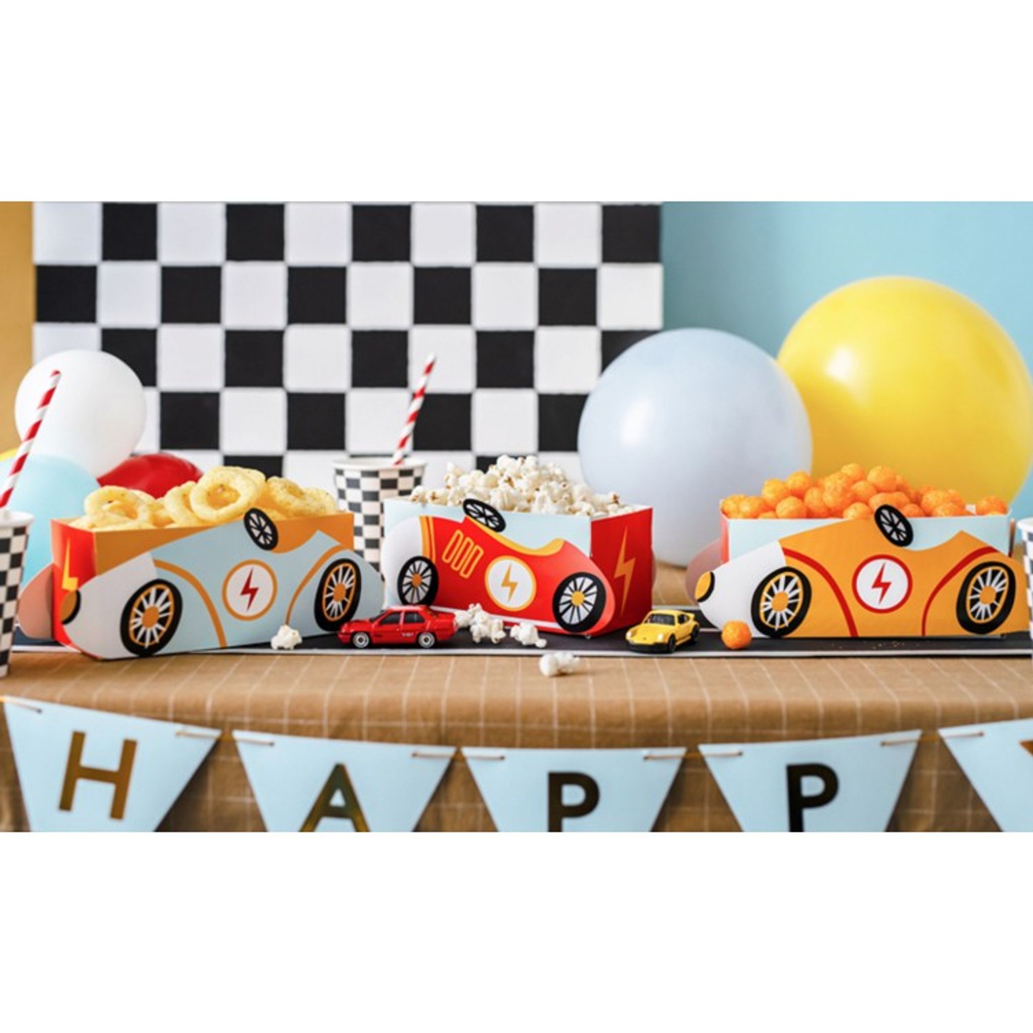 Dekorera bilkalaset med dessa coola snacksboxar som har formen av racerbilar. Säljes i 3-pack. Servera snacks eller kakor i bilarna och få till en extra kul dukning om du köper till bordslöpare Racerbana. Storlek: 7,5 x 17 x 7,5 cm. Tillverkade av papp.