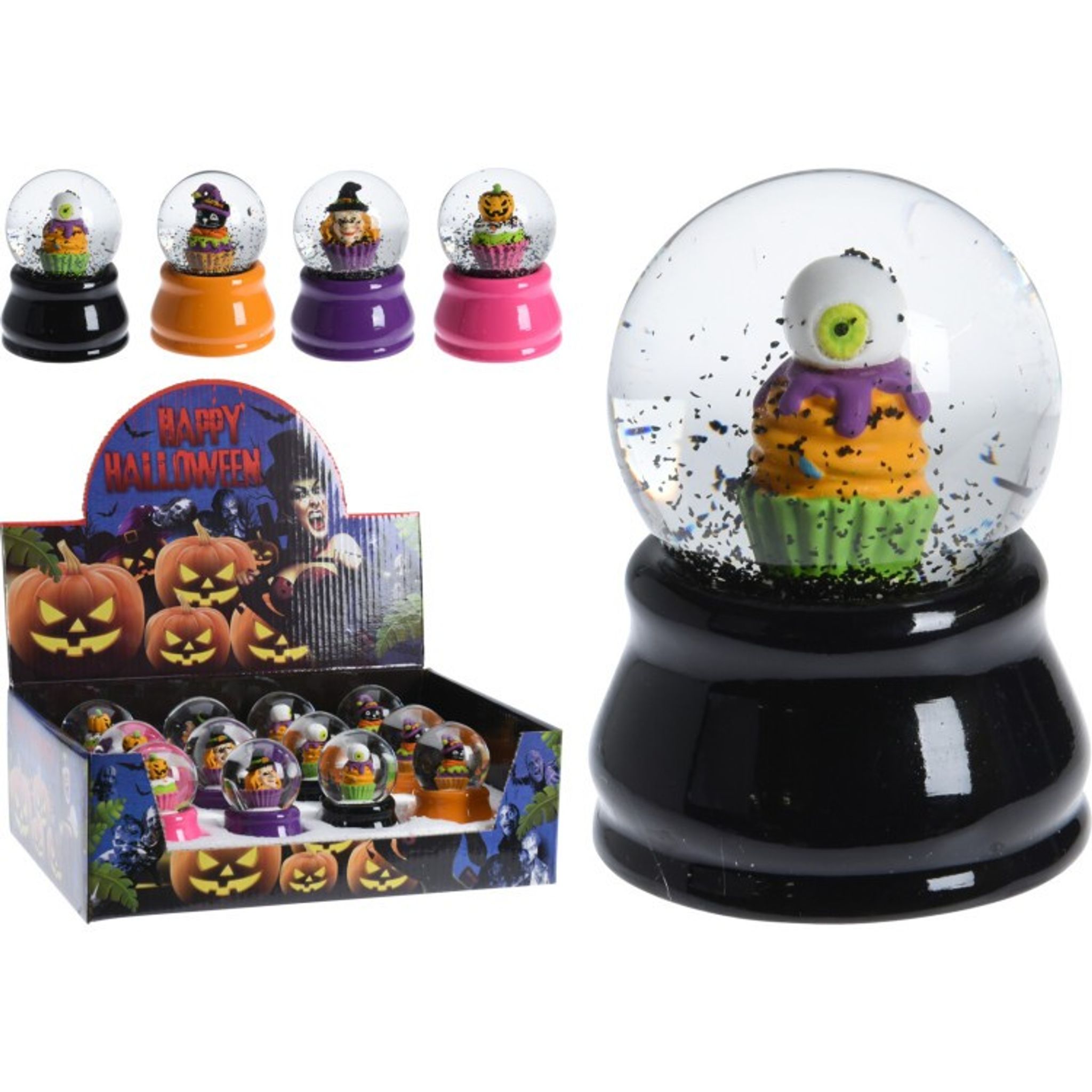 Gullig snöglob med motiv av en cupcake med Halloween-tema. Skaka på glasgloben och det kommer att snöa svarta småflingor.