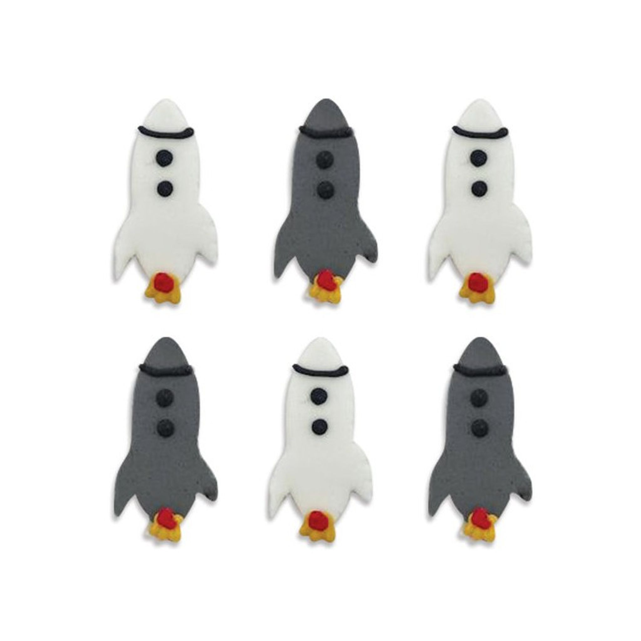 Planerar du ett spännande kalas med rymdtema? Dessa sockerdekorationer, i form av vita och gråa rymdraketer, är utmärkta till bakverken. Oavsett om födelsedagsbarnet önskar en läcker tårta eller goda muffins kan du med enkelhet få till något som passar temat.