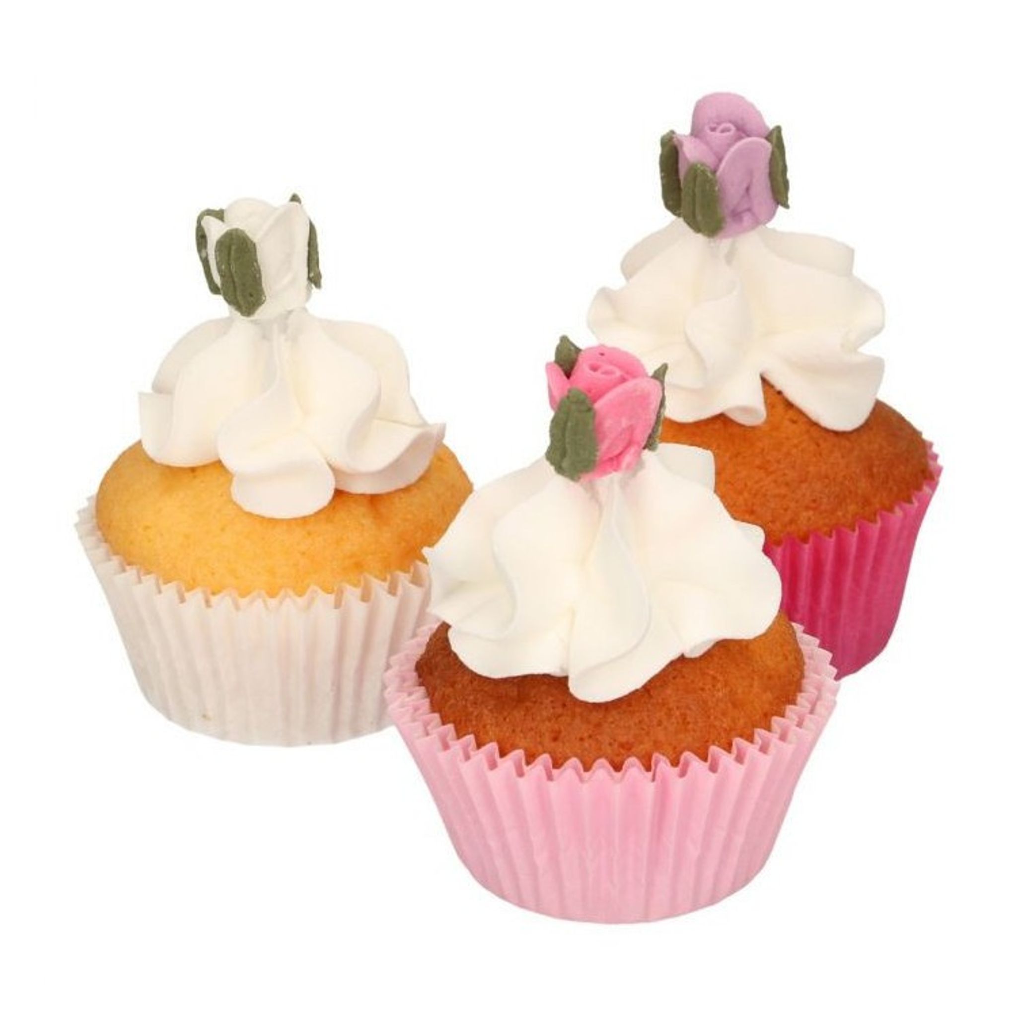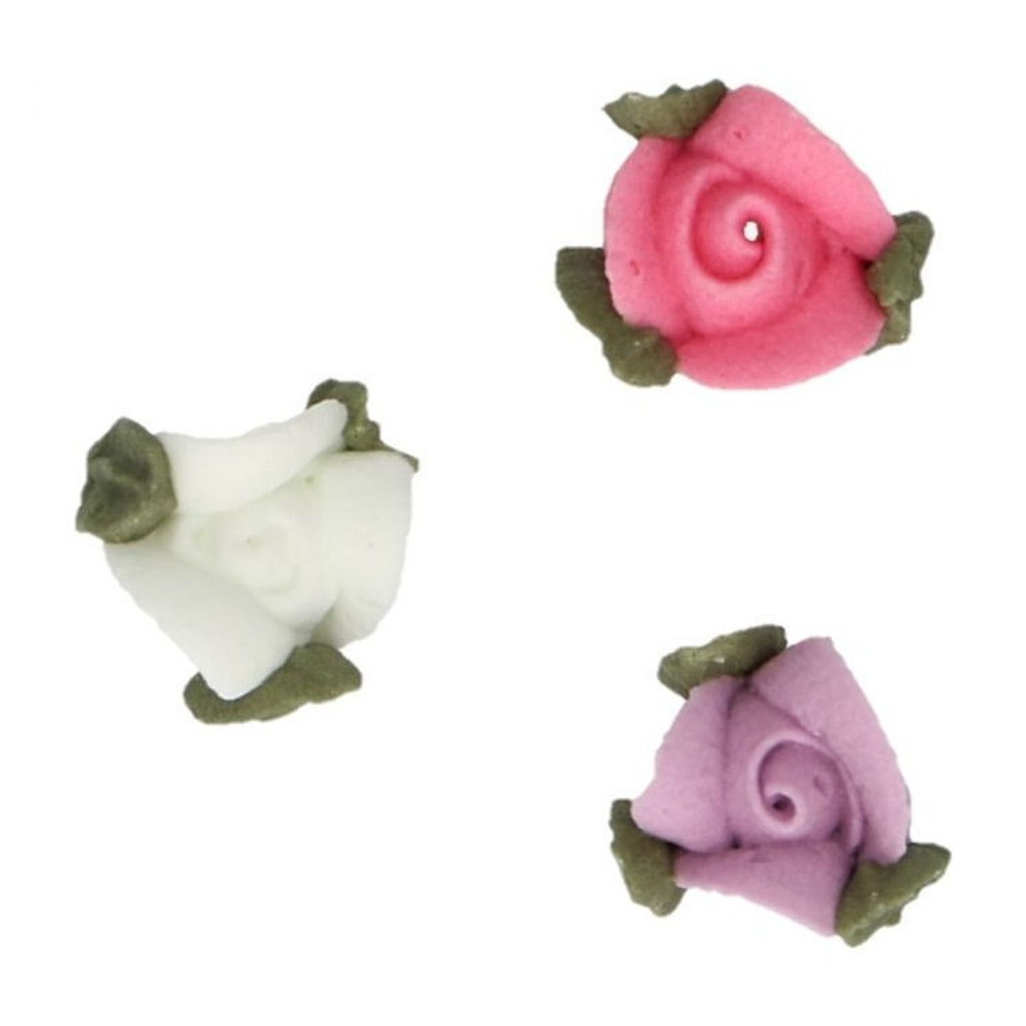 Nu kan du smidigt och enkelt dekorera dina bakverk! Totalt 16 st små sockerdekorationer i form av rosor med gröna blad. Förpackningen innehåller 8 st vita rosor, 4 st lila och 4 st rosa. Storlek: ca 1 x 1,5 cm Ingredienser, se nedan:
