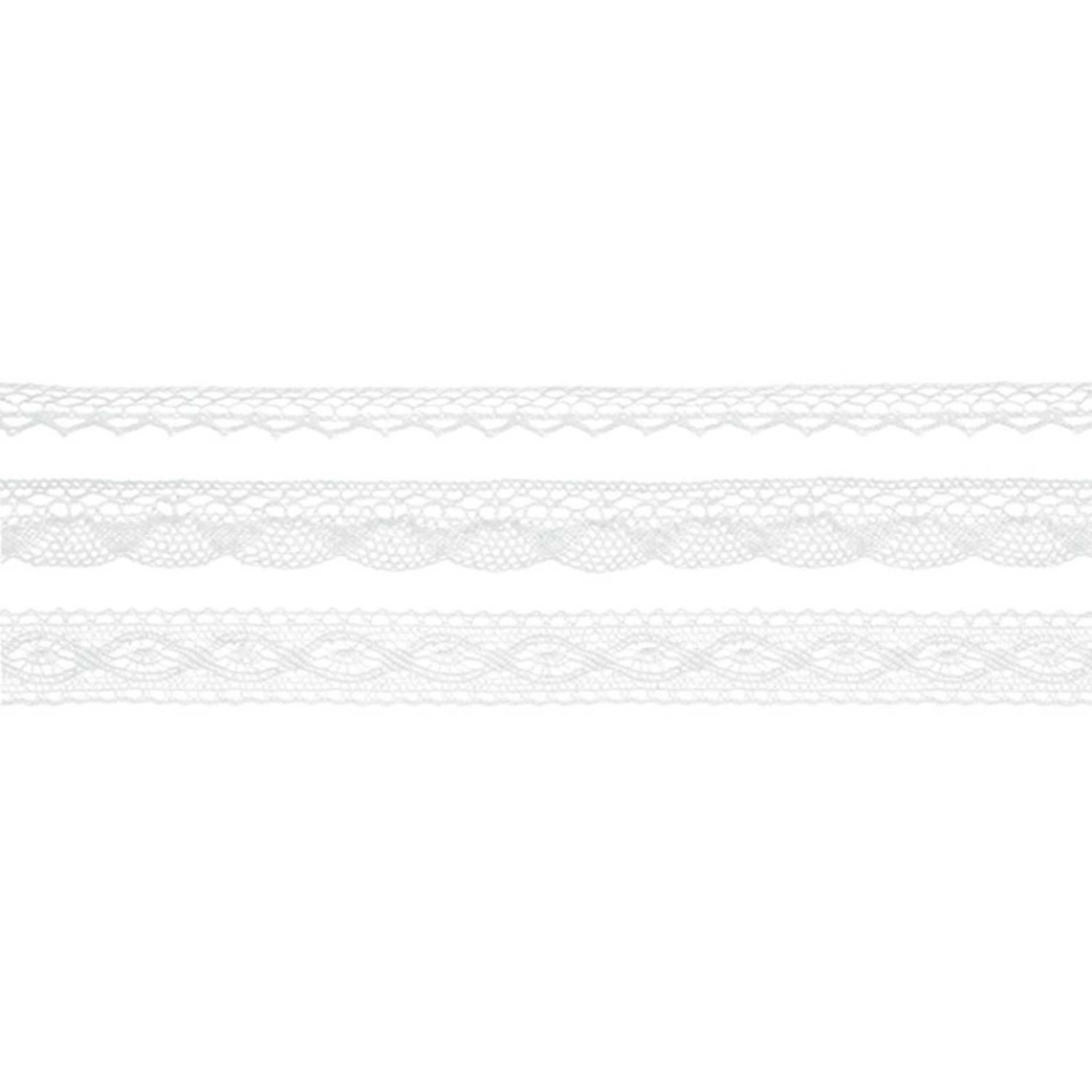 Tre olika spetsband i vitt.