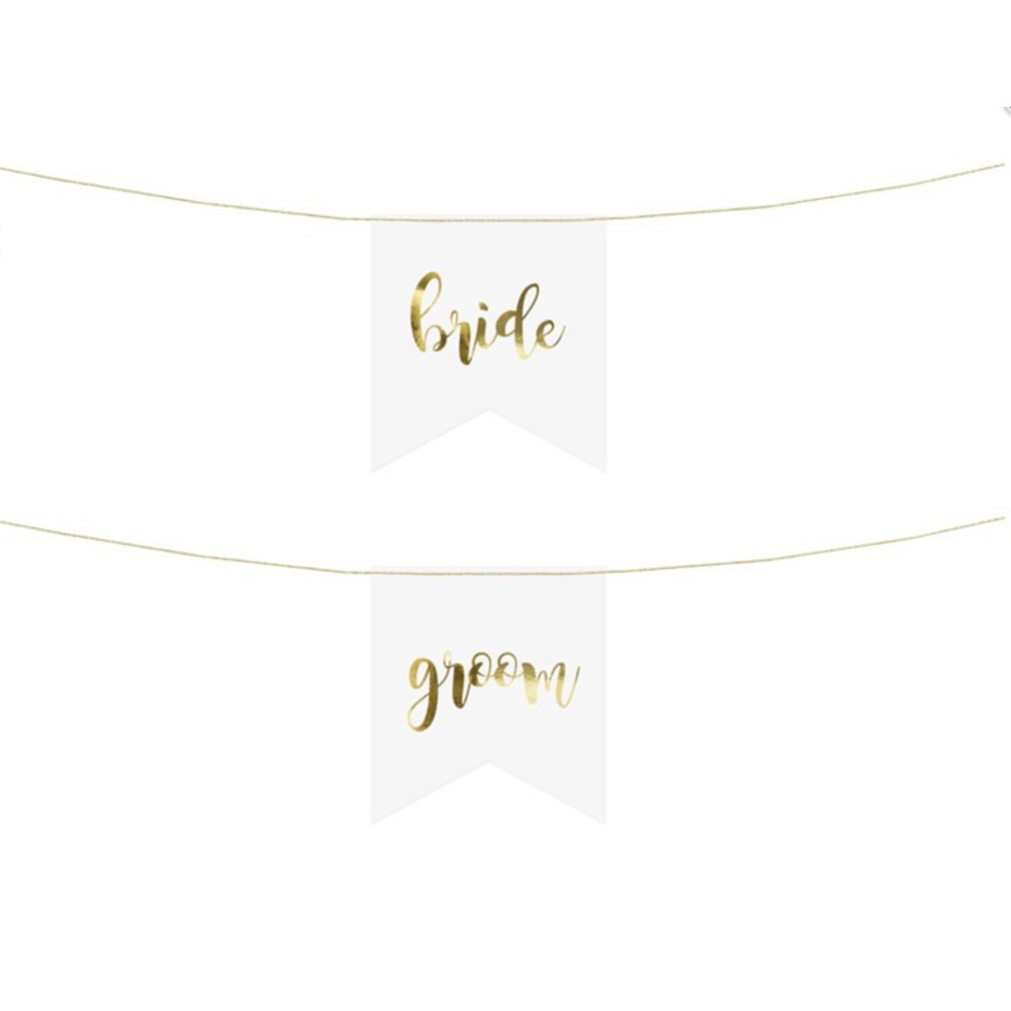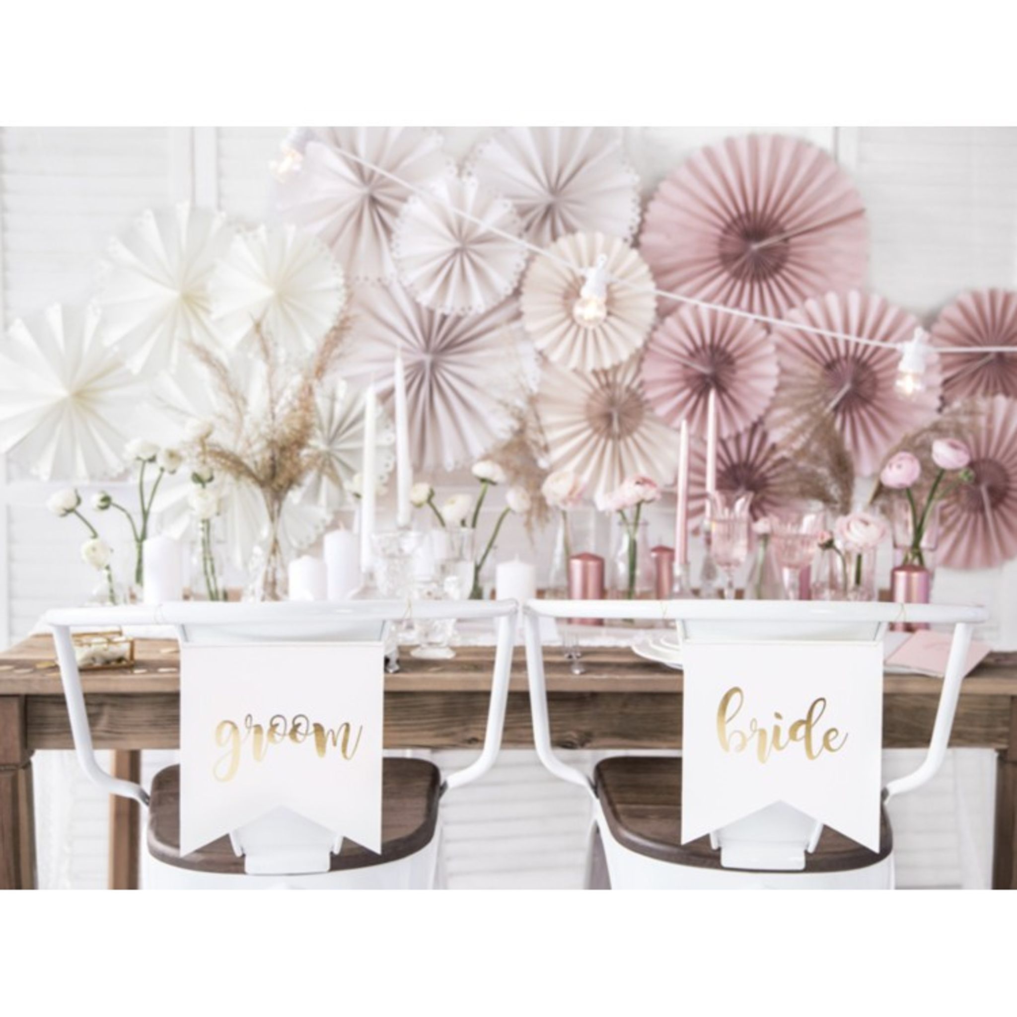 Dekorera brudparets stolar med hjälp av denna fina stolsdekoration i vitt och guld. Bordsdekorationen har texten Groom and Bride tryckt i guld.