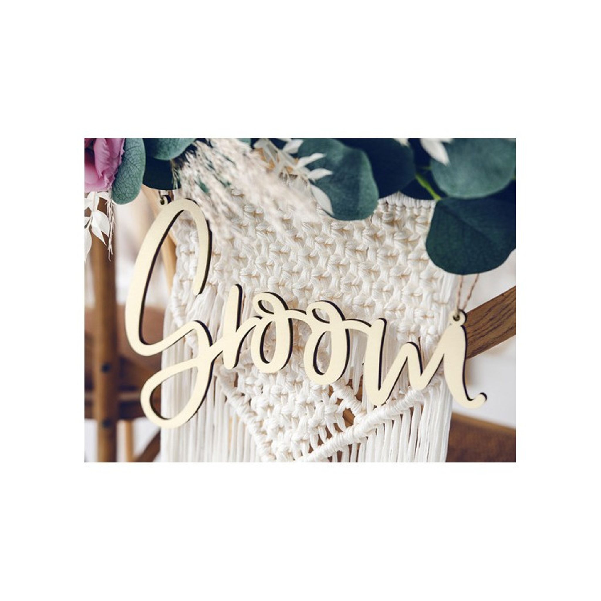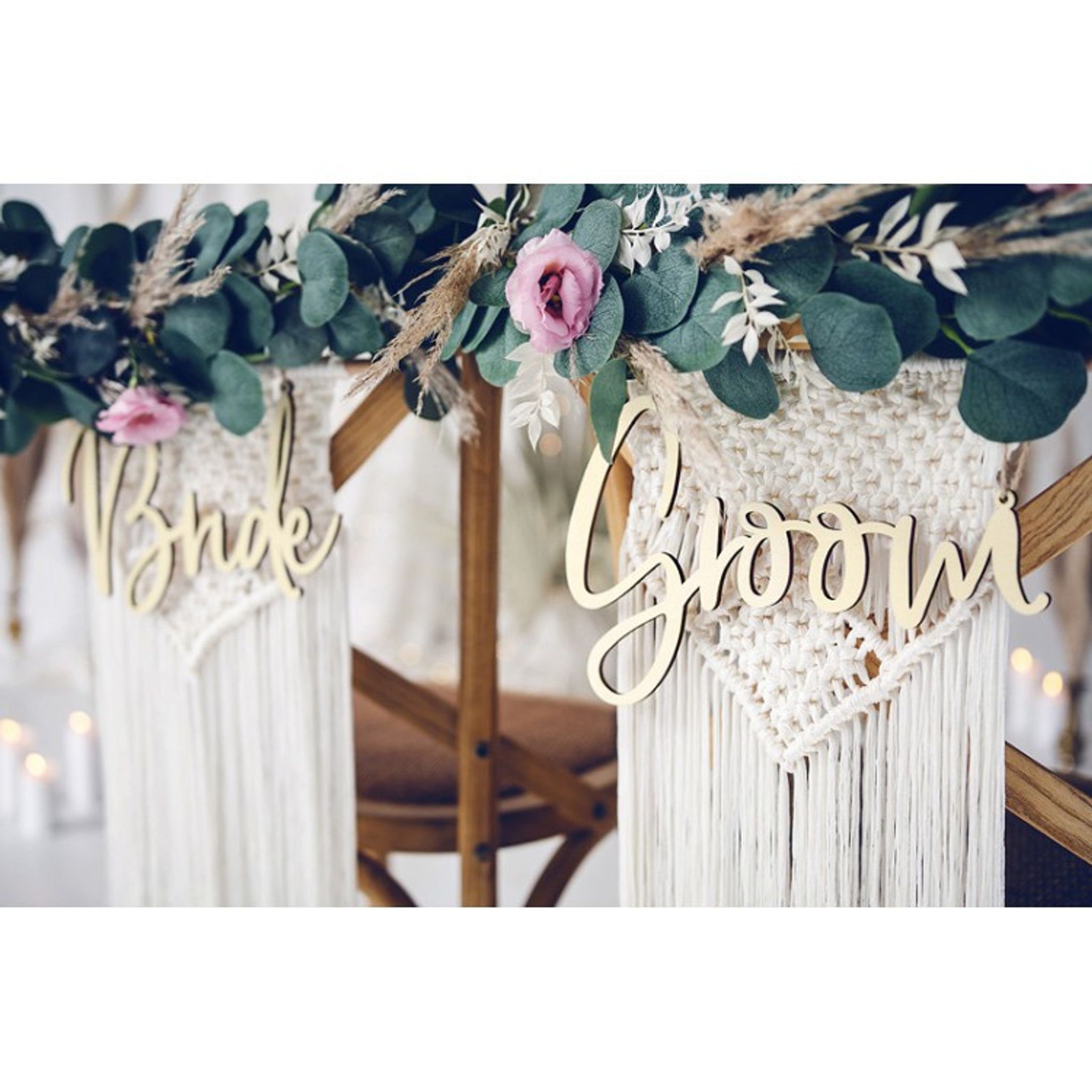 Skyltar av trä att fästa på Brudens och Brudgummens stolar. Snygg detalj till bröllopet och även ett mysigt minne att spara. Jutesnöre ingår! Storlek: 25.5 x 16 cm (Bride) and approx. 27.5 x 17.5 cm (Groom).