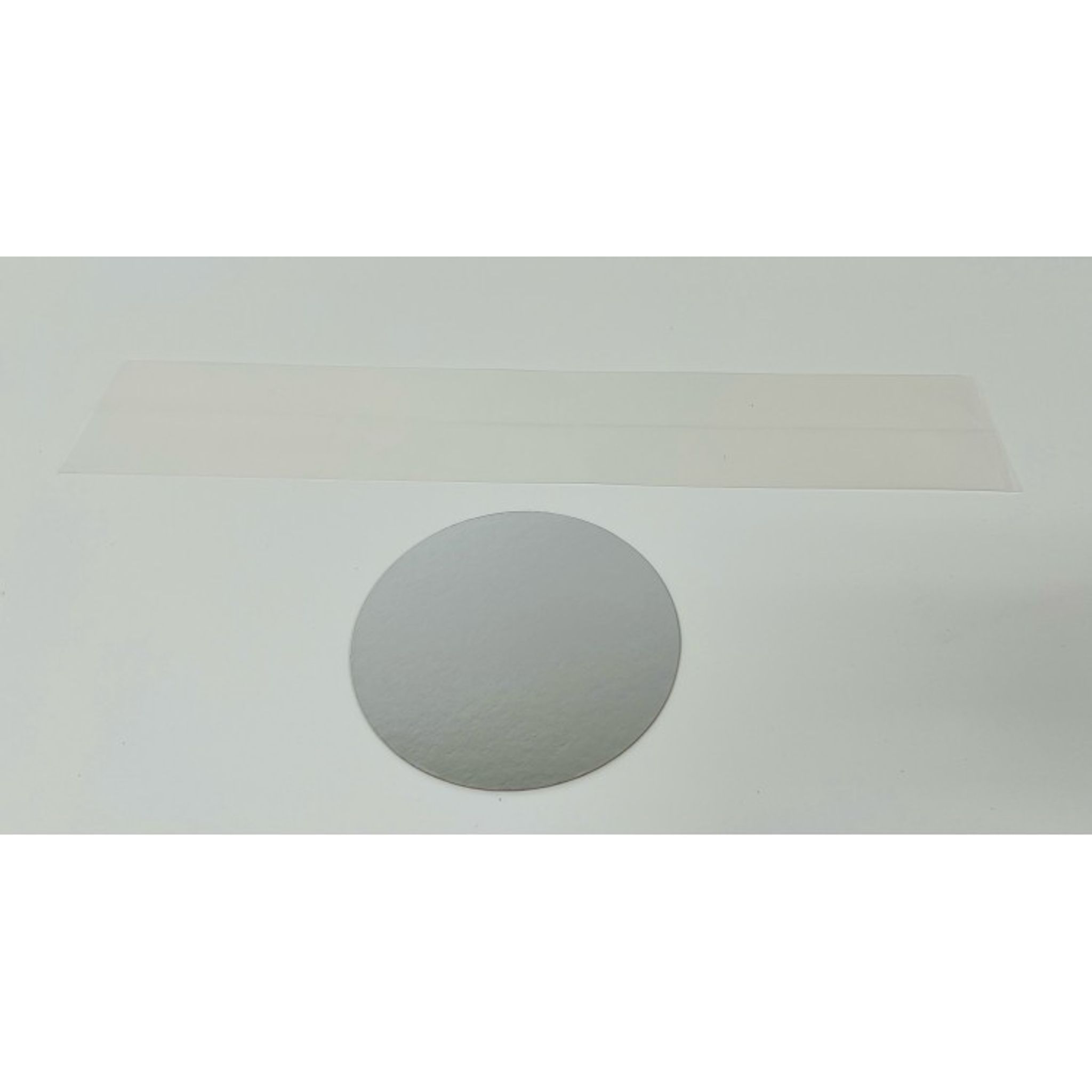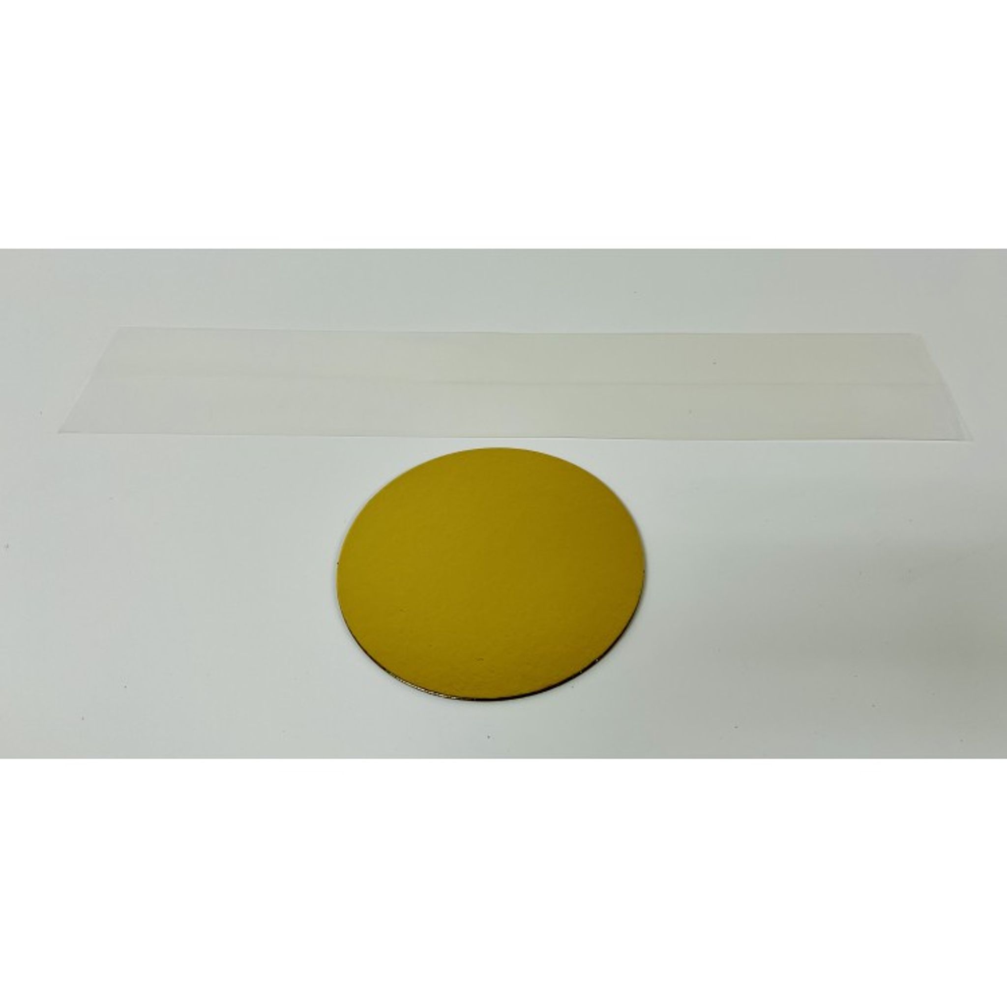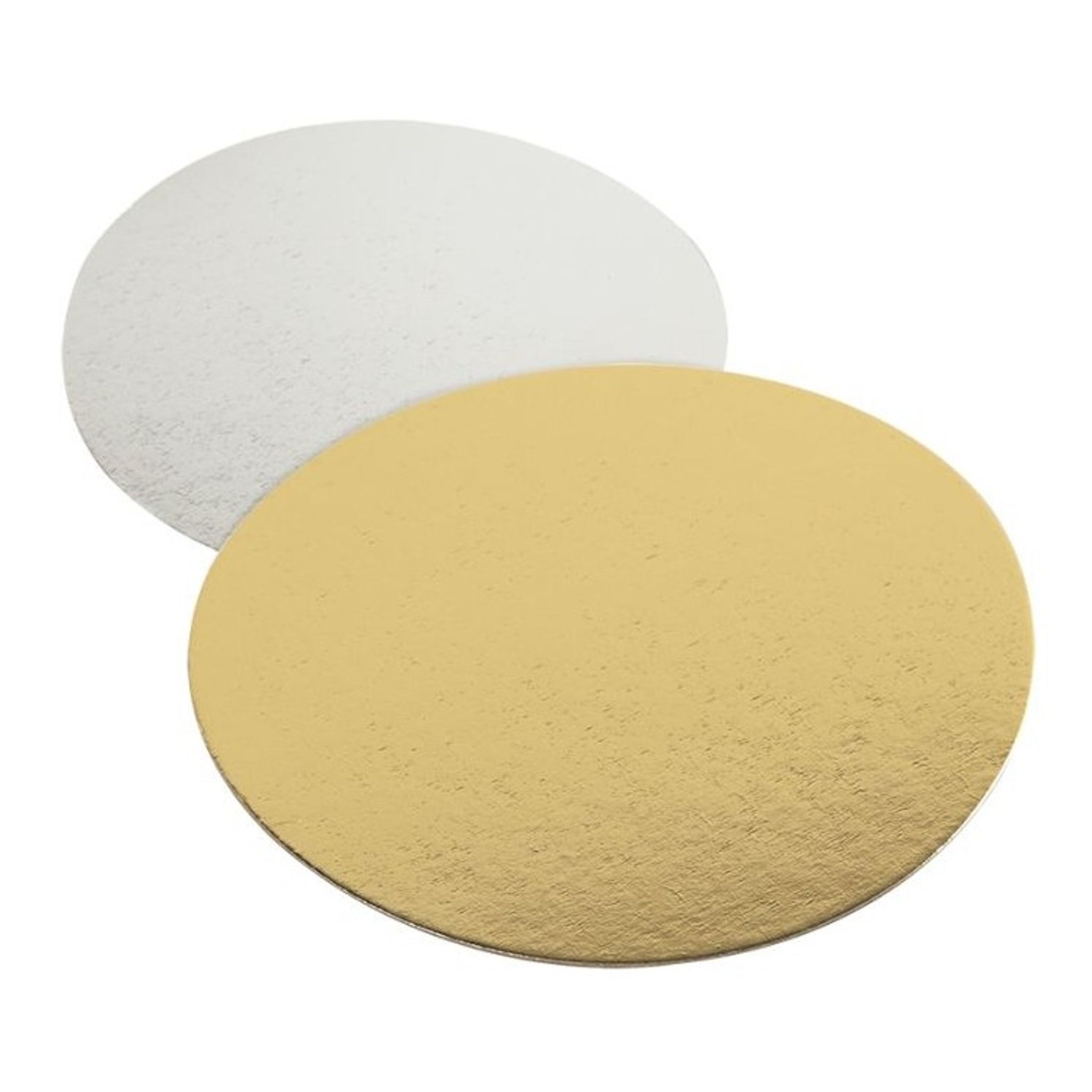 Bottenplatta/bricka har diametern 180 mm och är guldfärgad på ena sidan och silverfärgad på andra sidan.