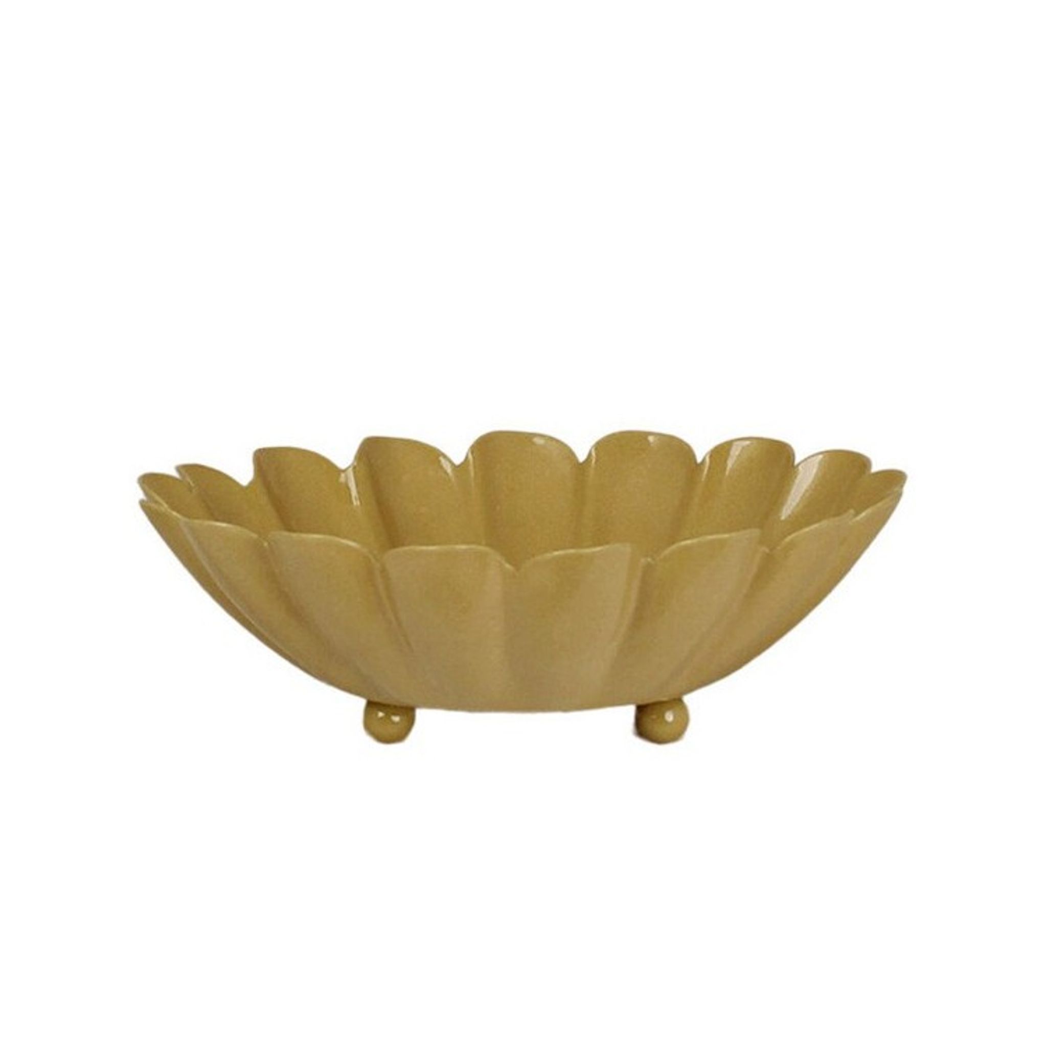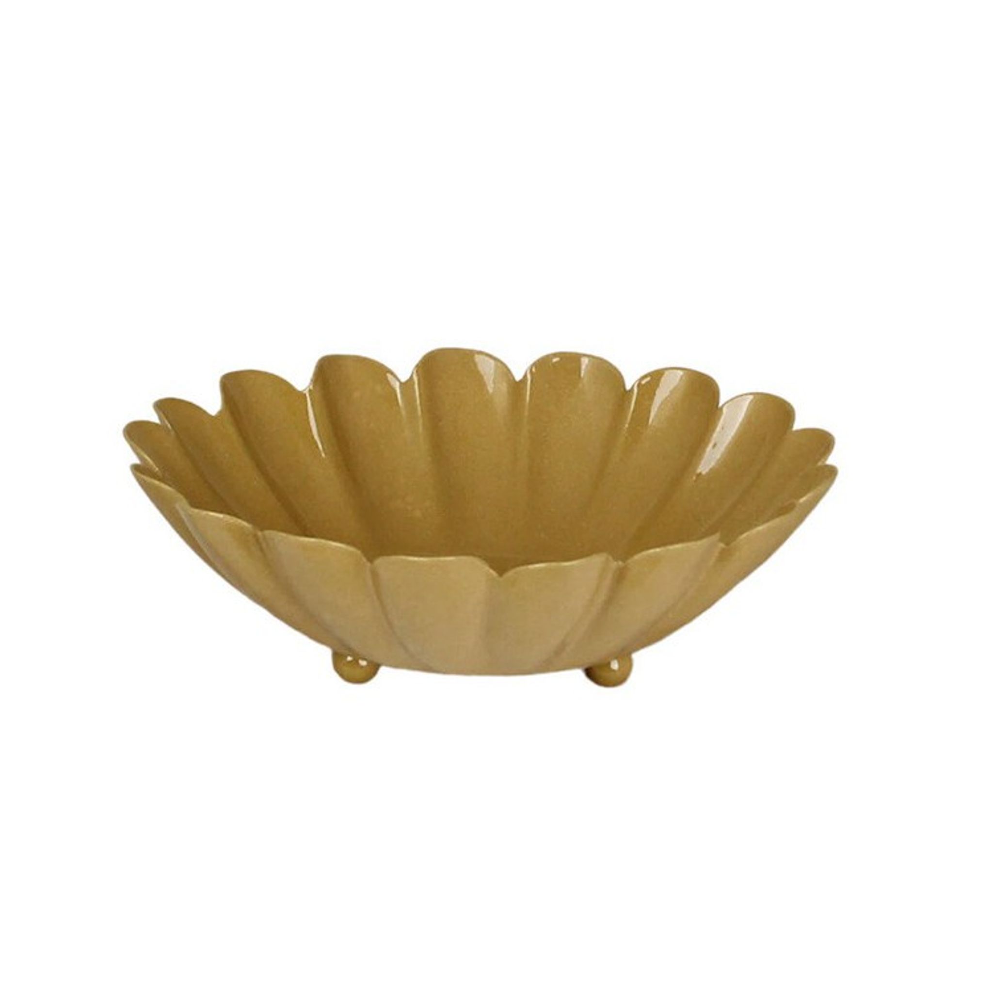 Liten gul skål i plåt med dekorativ kant som står på tre runda fötter.