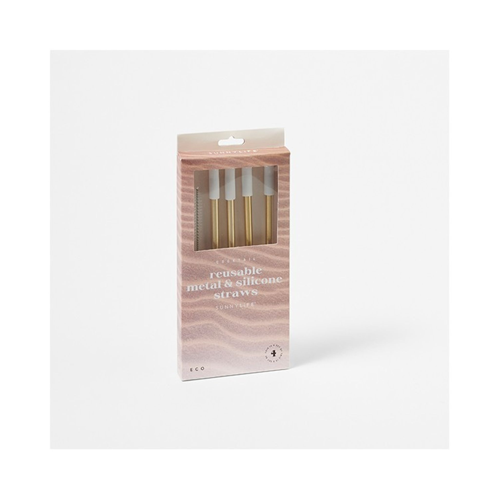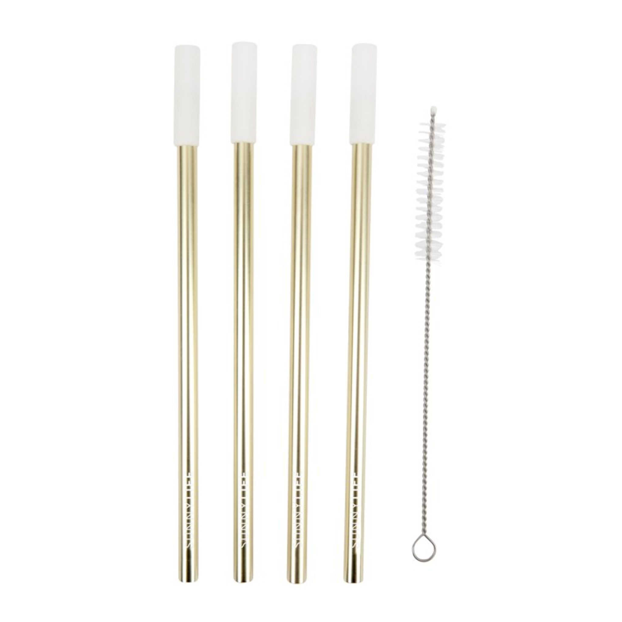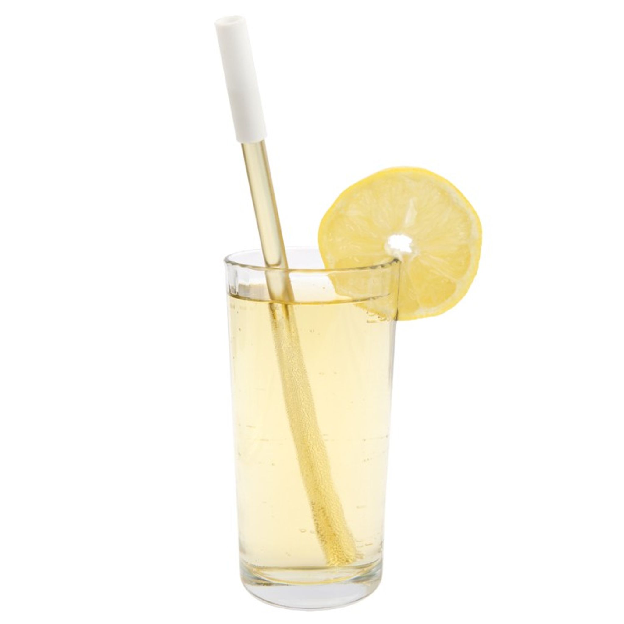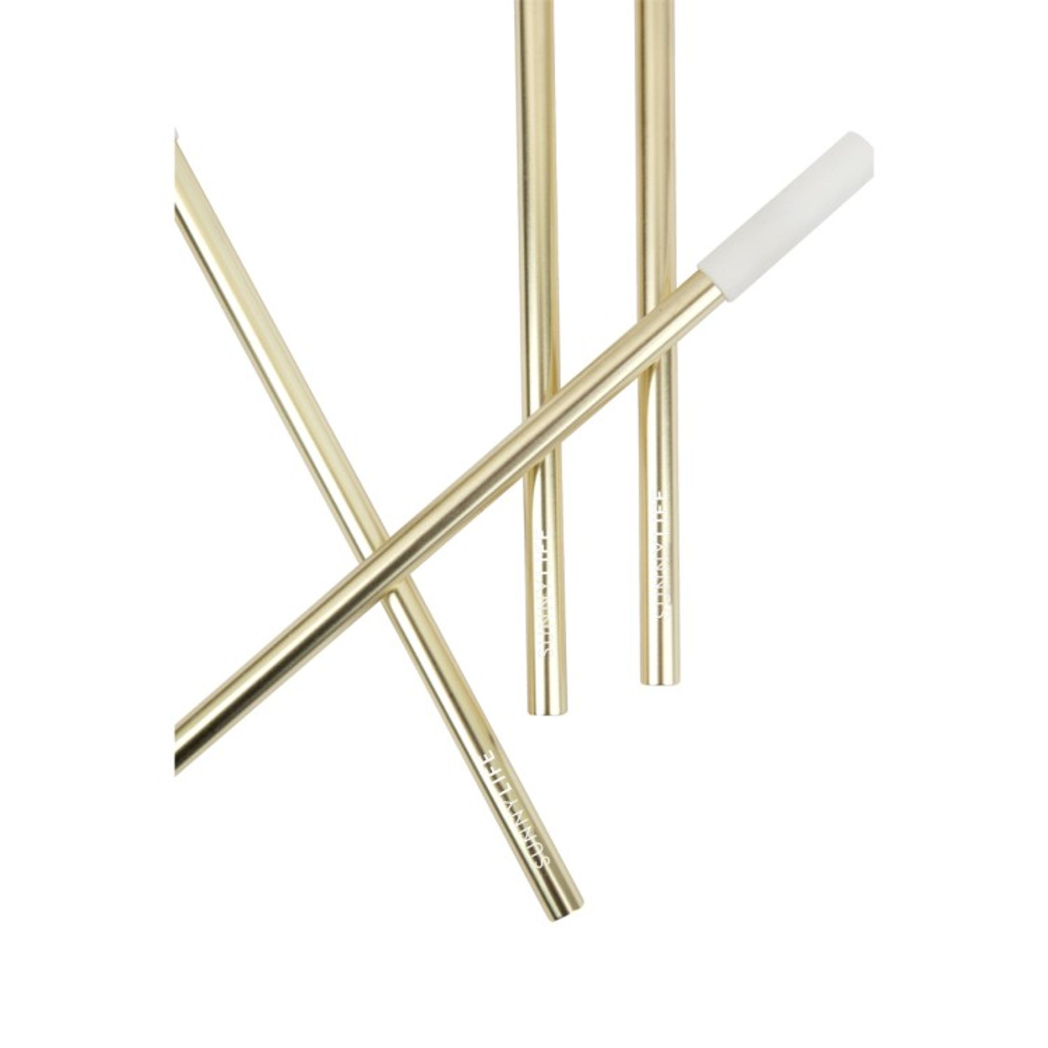Återanvändbara sugrör i metall. Sugrören ser extra lyxiga ut i sin guldfärg och med en silikontopp så att du inte fryser om läpparna av den kalla drycken.
