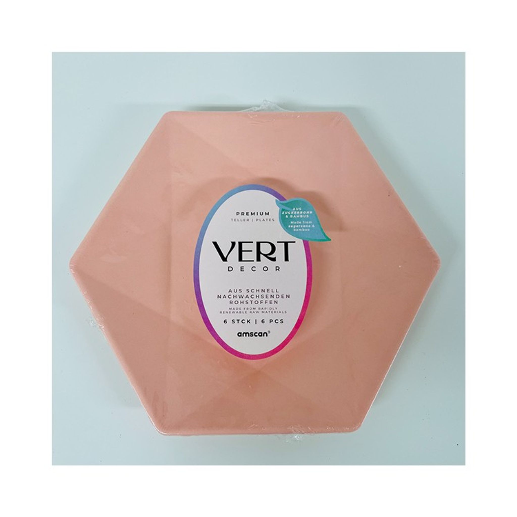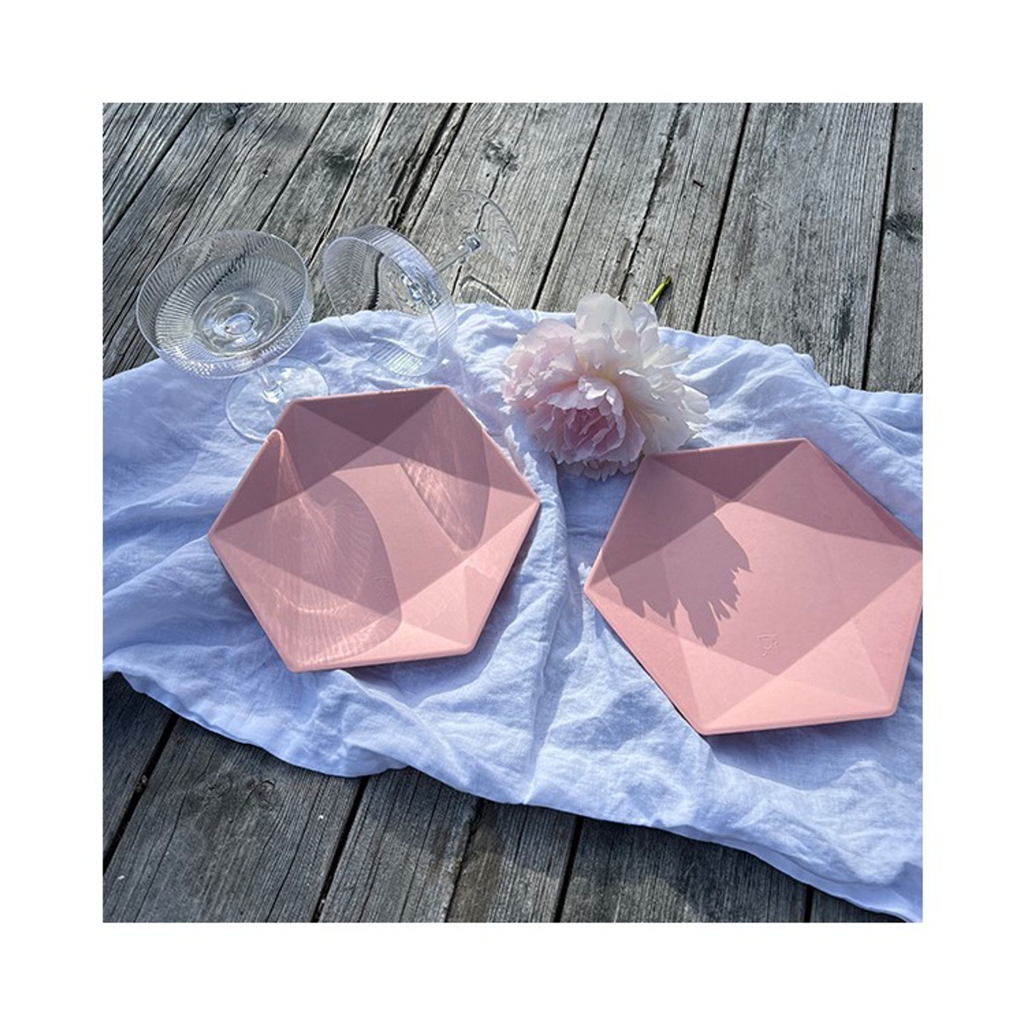 Skapa en härlig dukning med våra fina tallrikar i aprikos-rosa med formen av en hexagon. Tallriken ger en lyxig känsla och är tillverkade i förnybart material och innehåller inte någon plast.