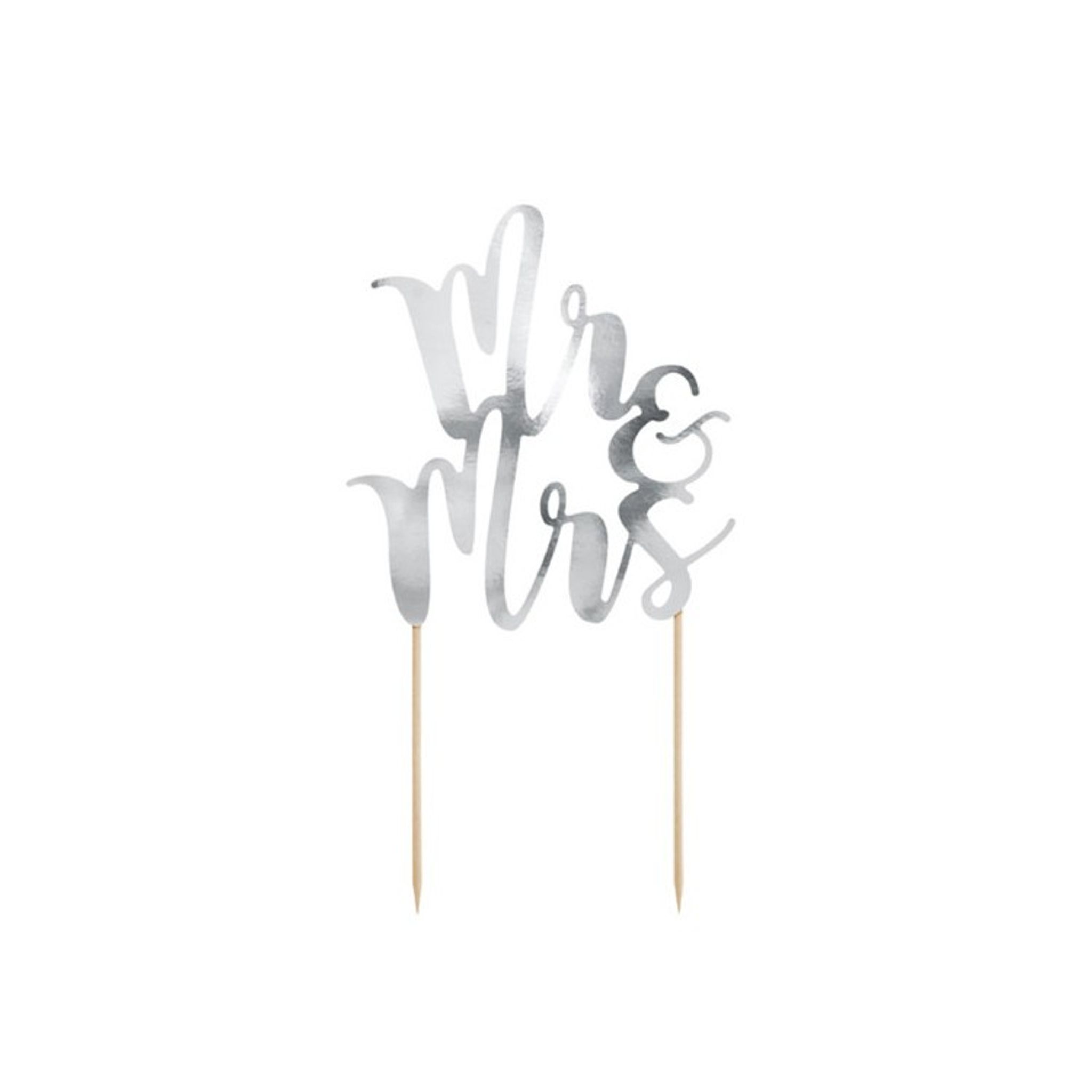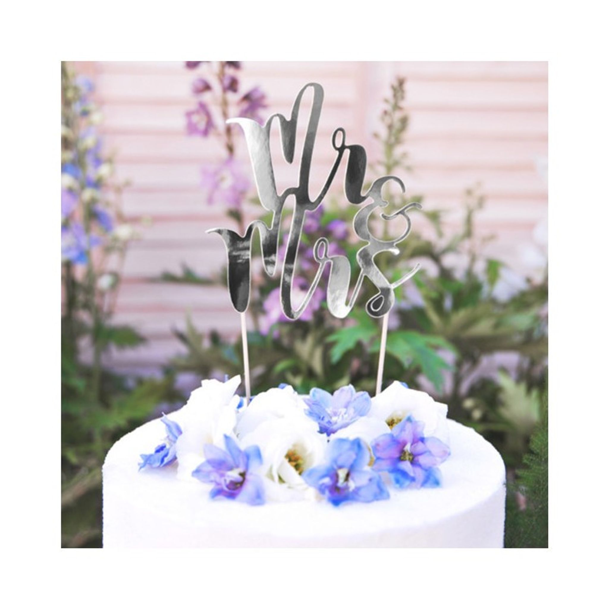 Såhär dekorerar du bröllopstårtan på bästa sätt! Denna tårtdekoration, gjord av spegelblankt papper i silver och med texten "MR & MRS", gör tårtan extra festlig. En klassisk cake topper som gör sig fin på alla möjliga bröllopsfester och bröllopsmingel.