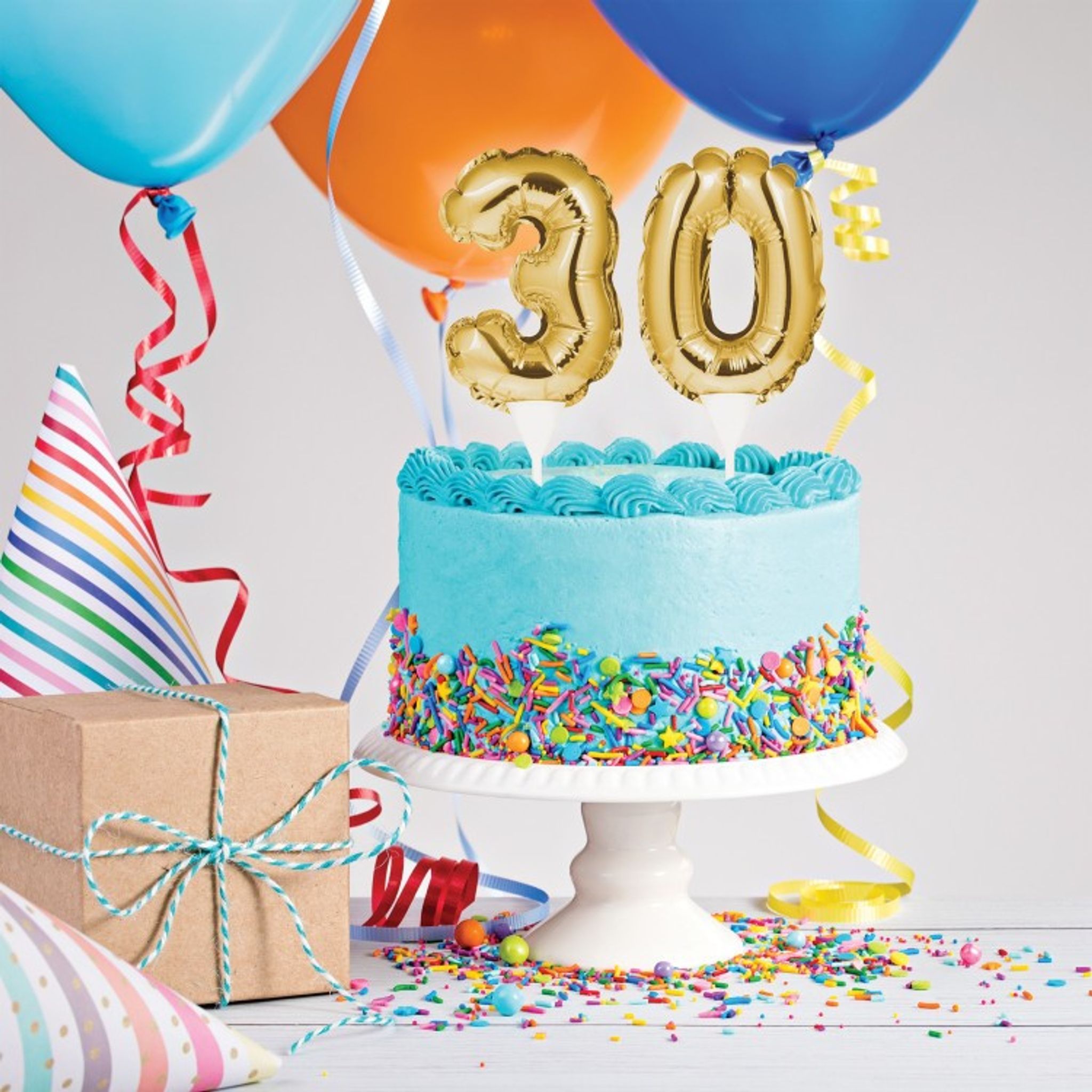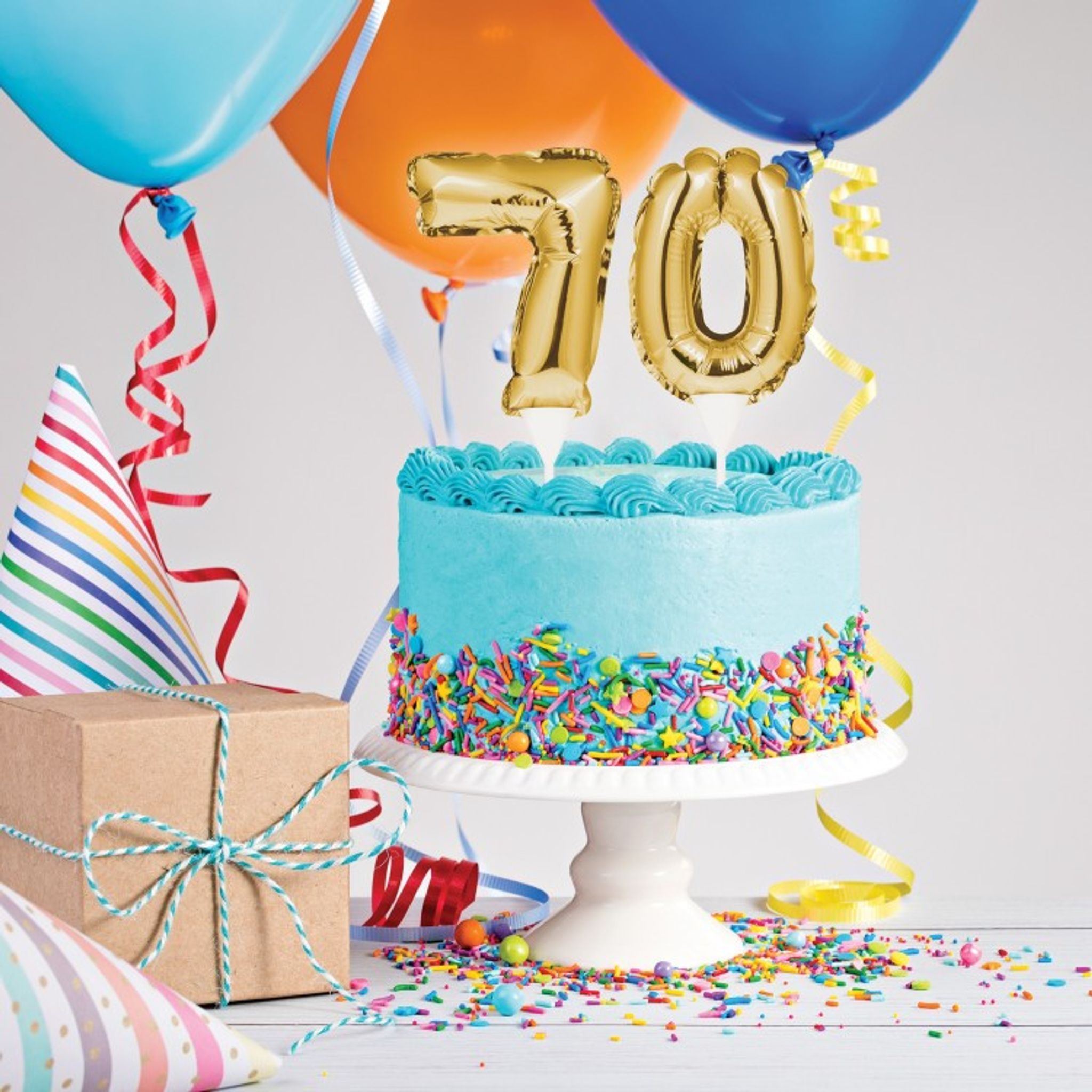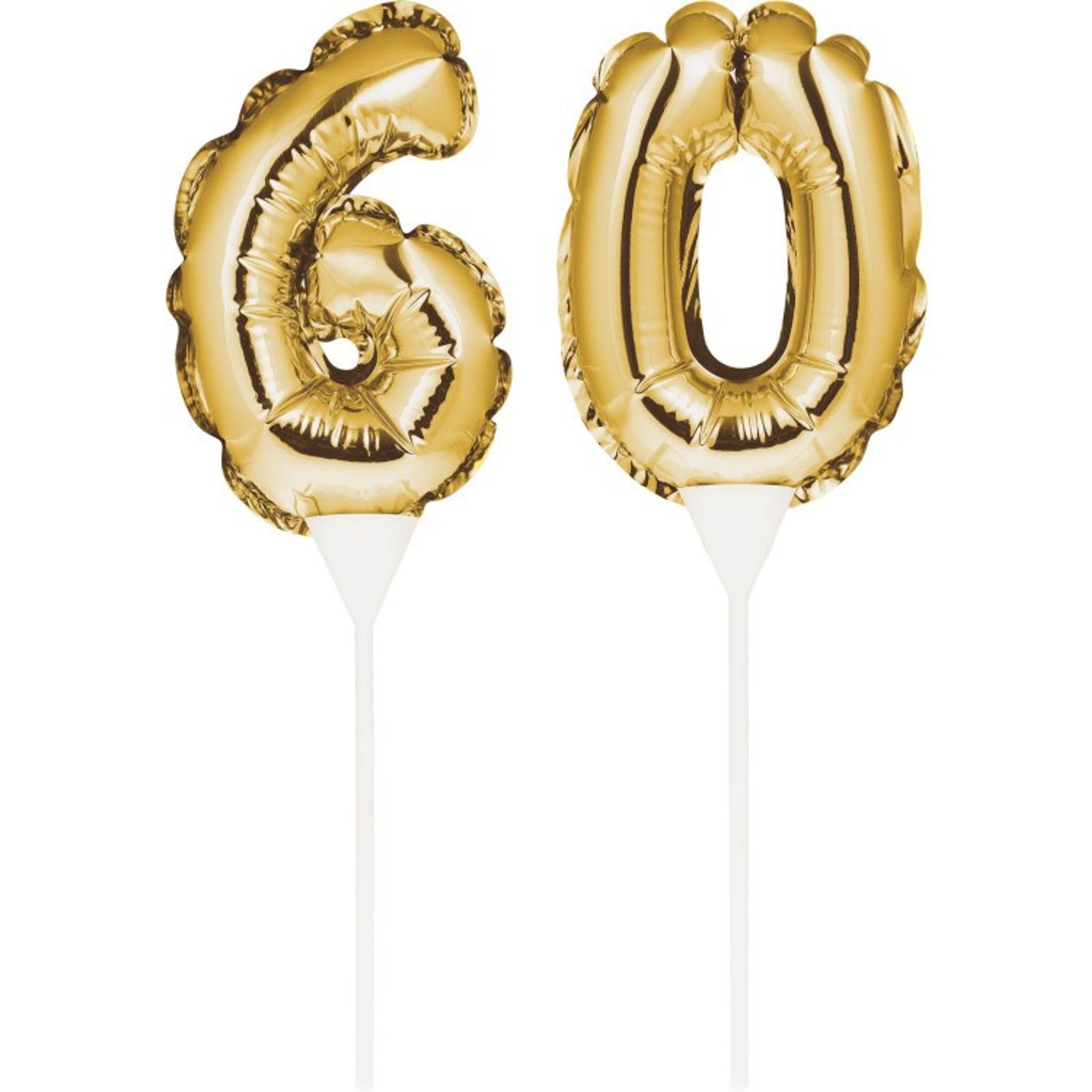 Med den här tårtdekorationen kan ni enkelt dekorera festens tårta. Dekorationerna är små folieballonger i en snygg guldfärg som fästes i tårtan med tillhörande ballongpinnar. Välj mellan 30, 40, 50, 60, 70 eller 80. Storlek på ballongerna är ca 23 cm x 10 cm.