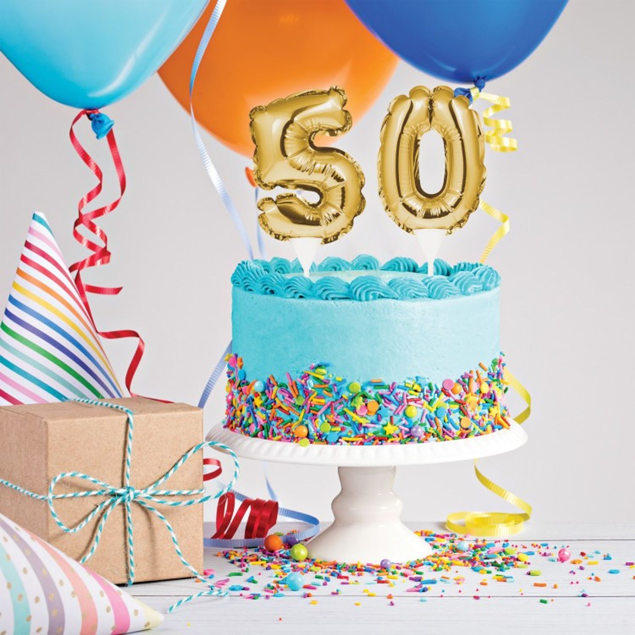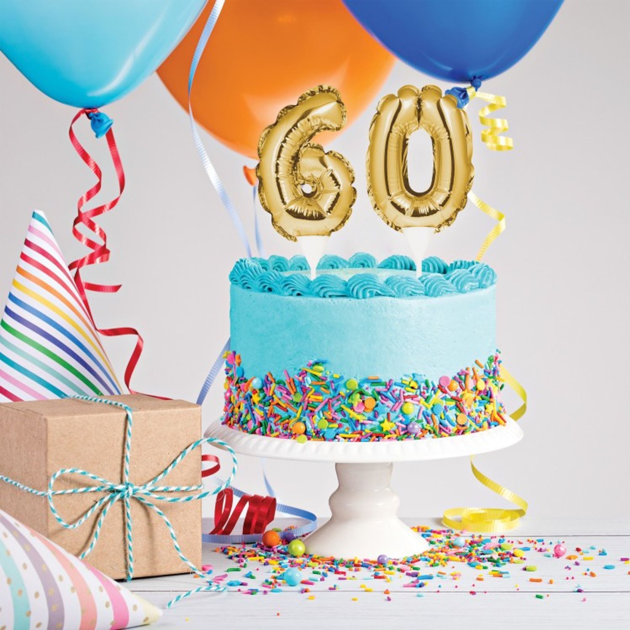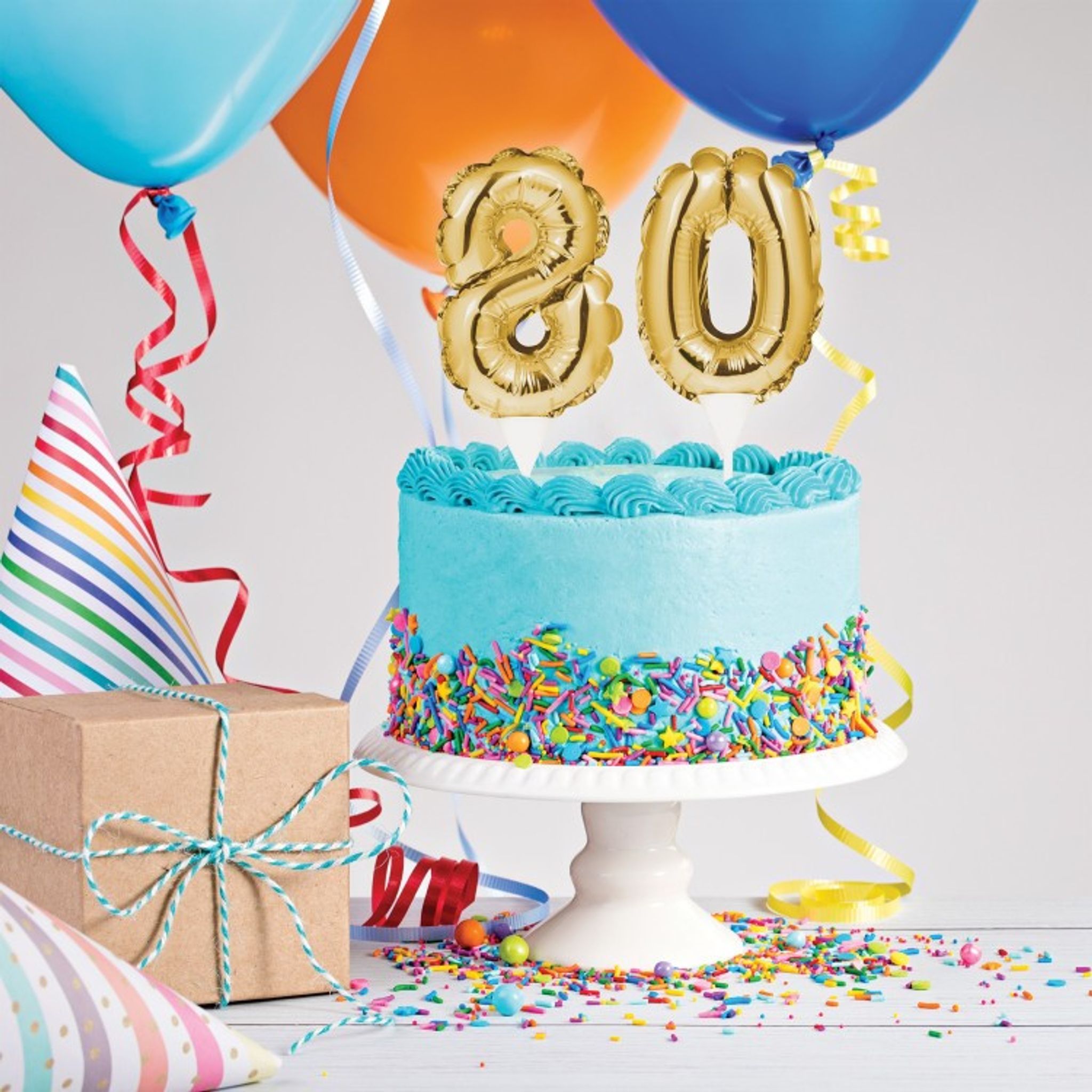 Med den här tårtdekorationen kan ni enkelt dekorera festens tårta. Dekorationerna är små folieballonger i en snygg guldfärg som fästes i tårtan med tillhörande ballongpinnar. Välj mellan 30, 40, 50, 60, 70 eller 80. Storlek på ballongerna är ca 23 cm x 10 cm.