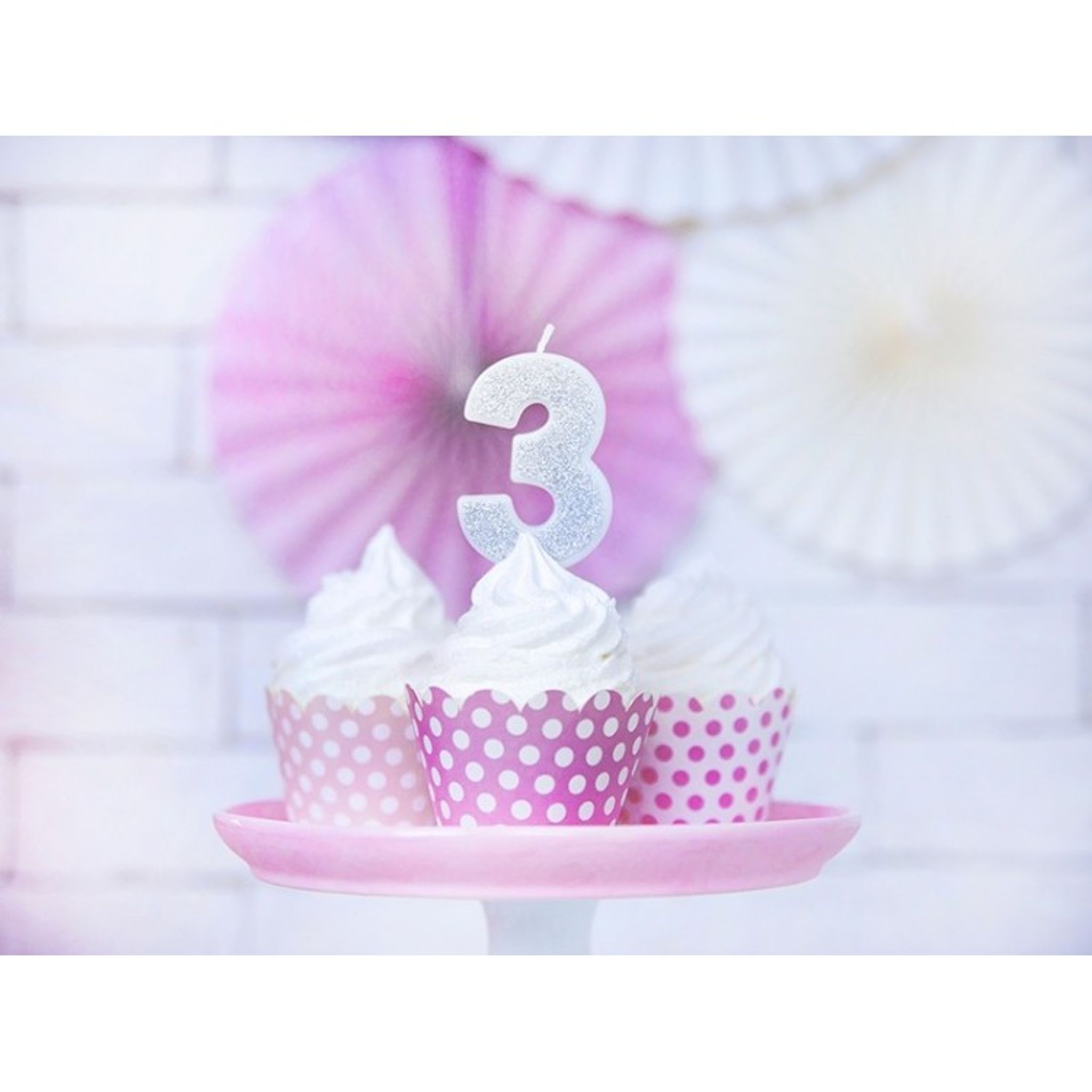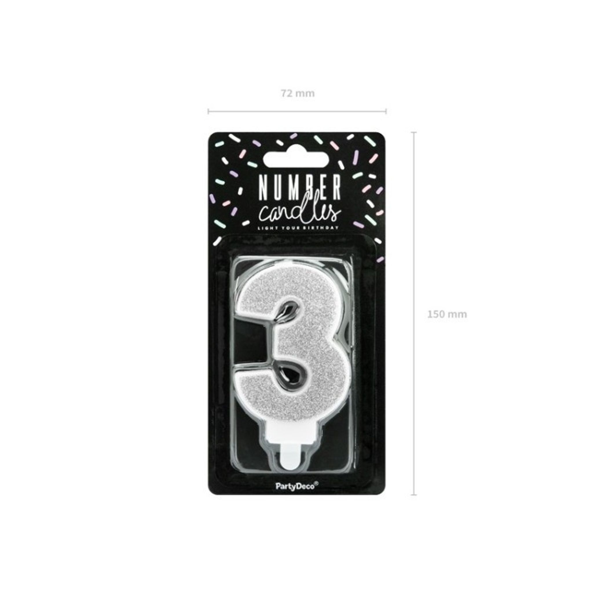 Tårtljus i form av en trea i glittrigt silver. Storlek: ca 8.5x4.5 cm.