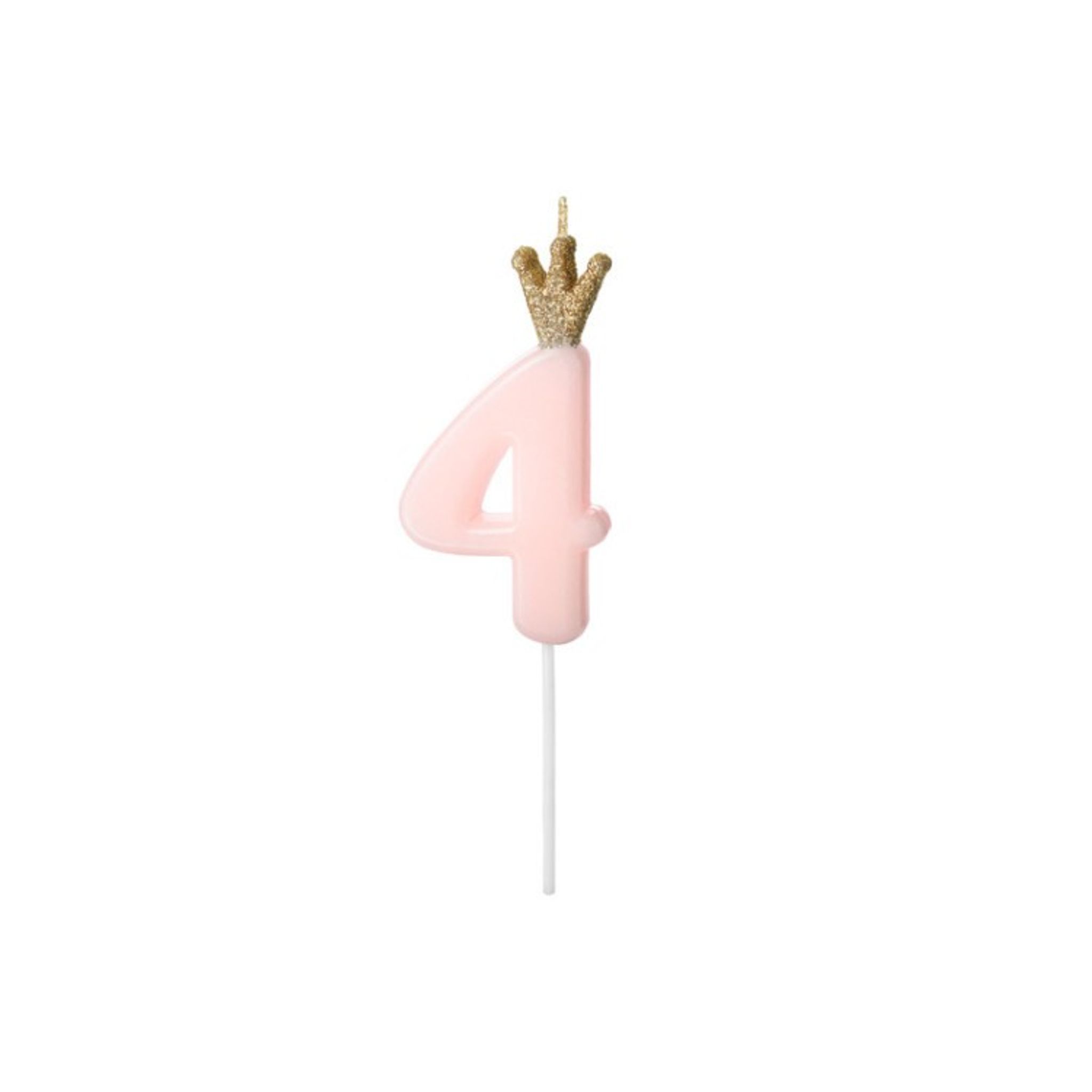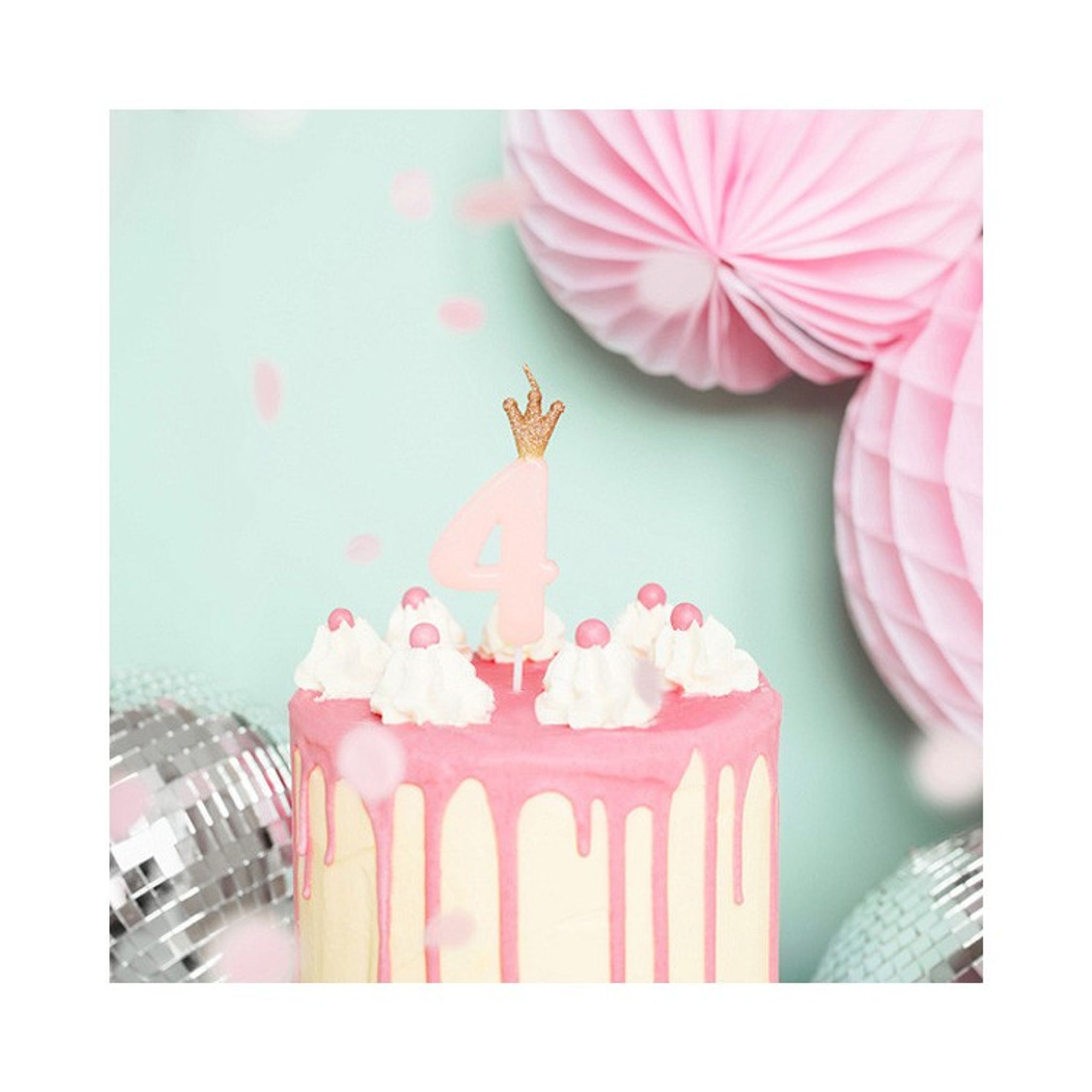Födelsedagsbarn som fyller 4 år? Fira det med ett prinsesslikt tårtljus. Det här ljusrosa tårtljuset har en glittrig guldkrona på toppen och är otroligt fin till barnkalaset.
